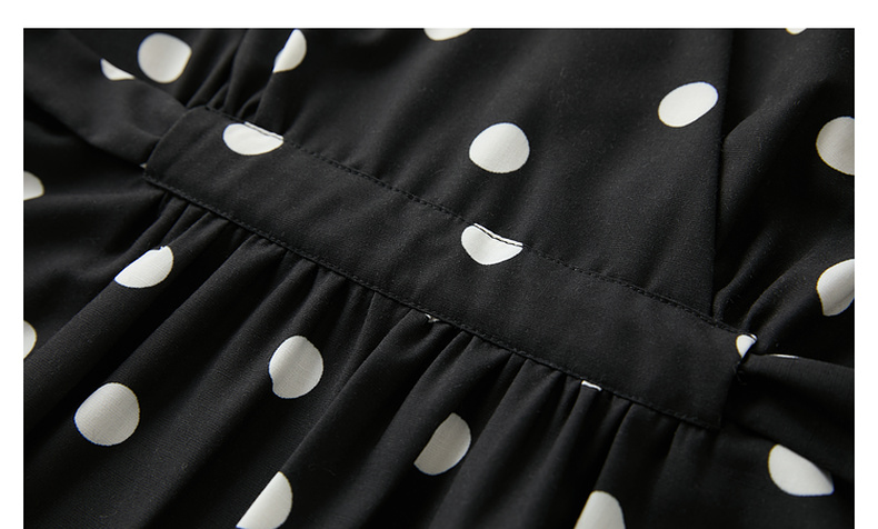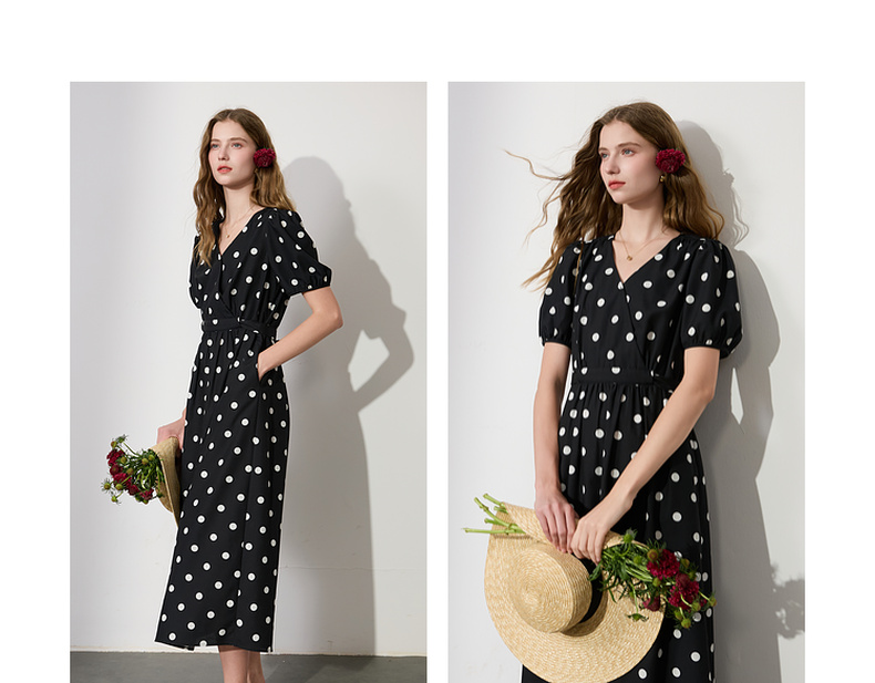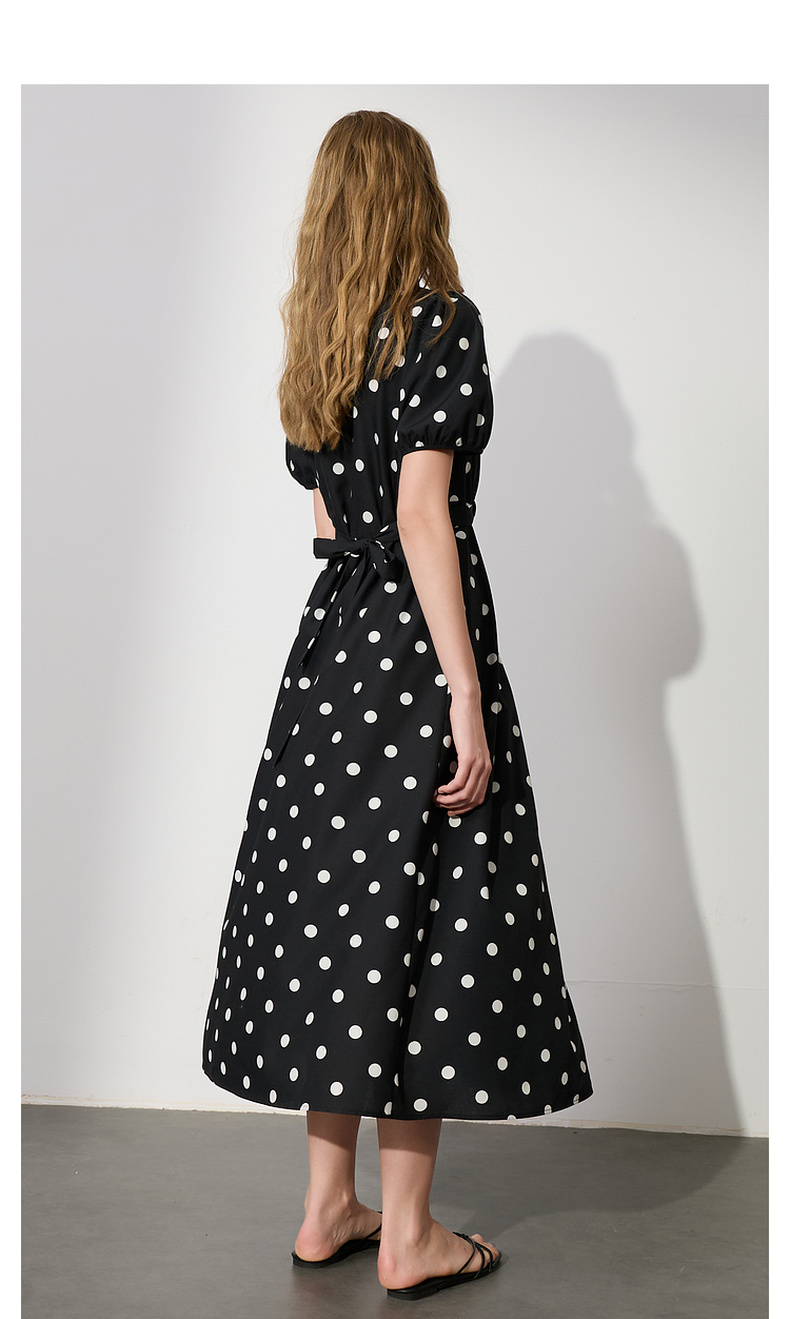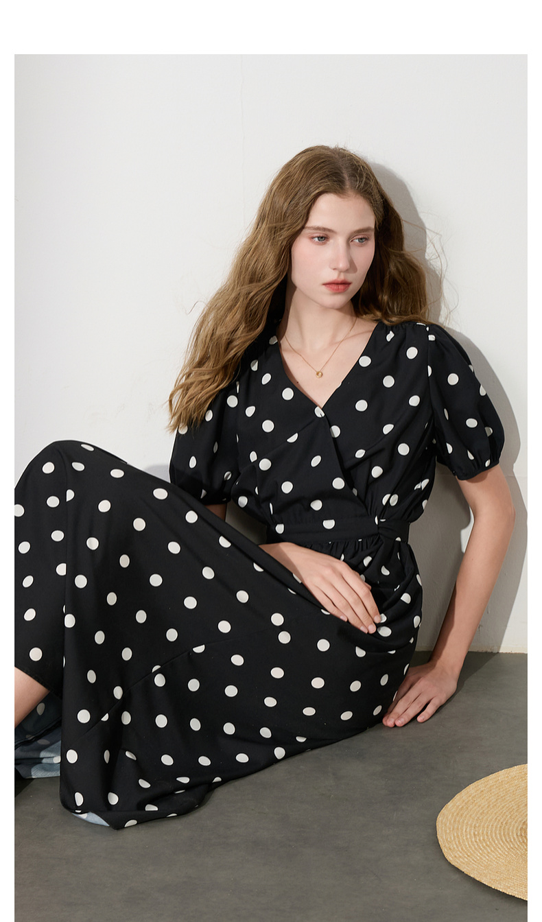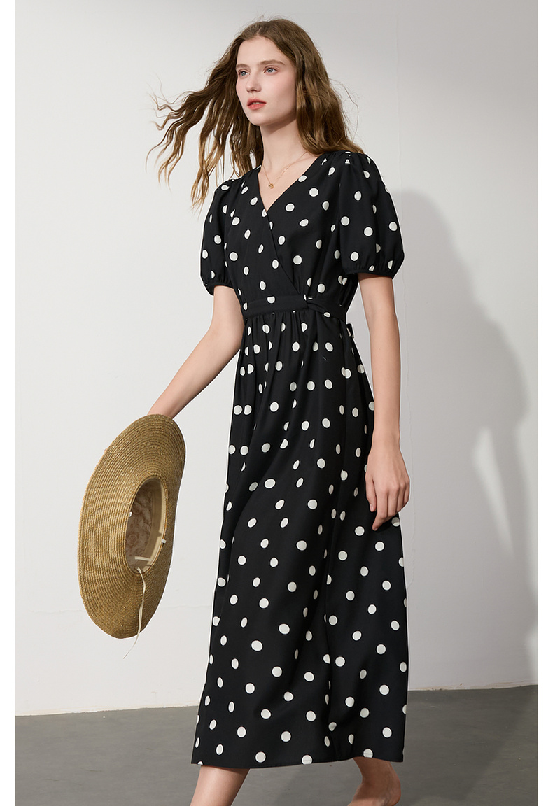 三彩2025夏季新款波点连衣裙法式高腰A字裙V领长裙优雅M
