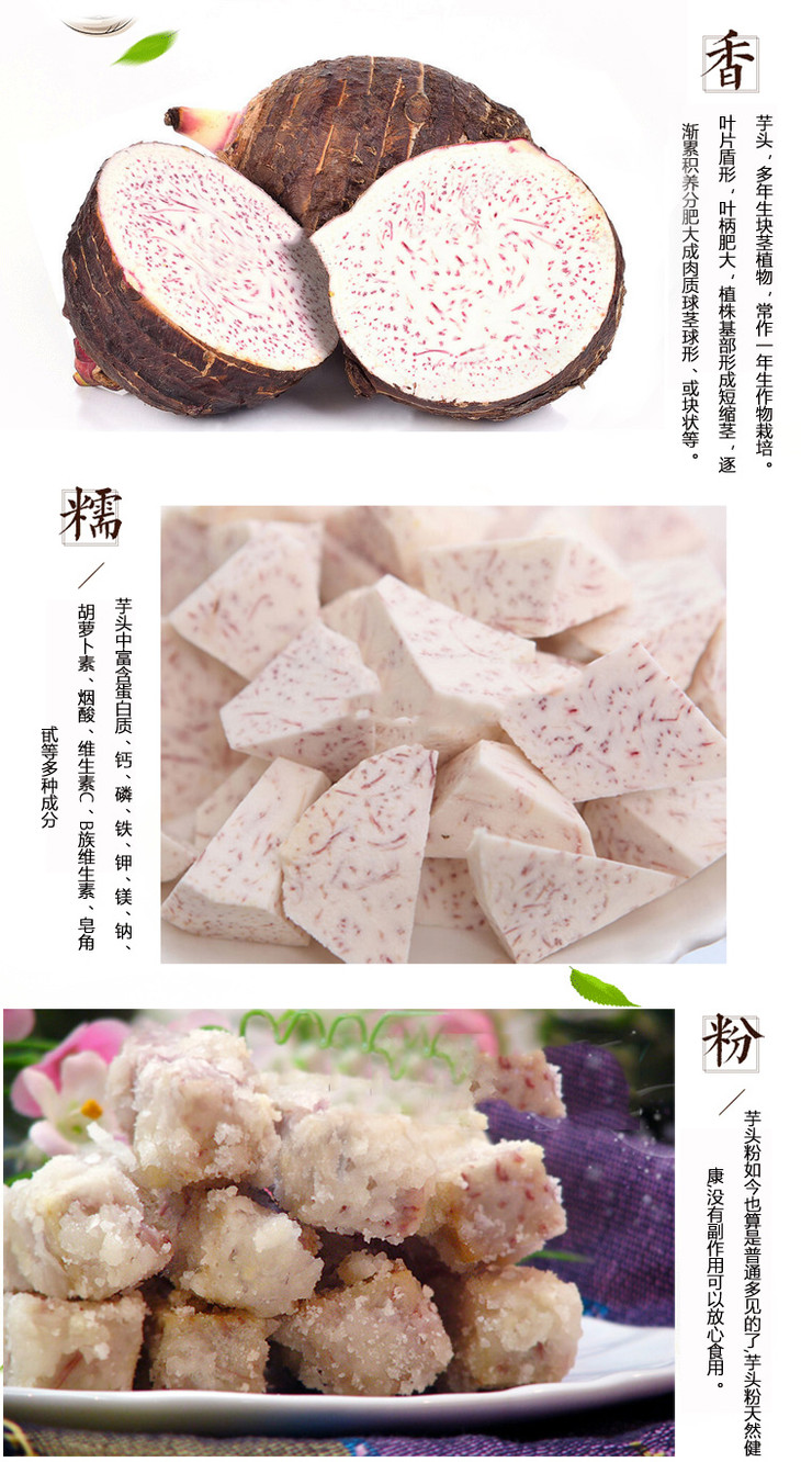 荔浦芋头营养丰富,含有大量的矿物质及维生素,既是蔬菜,又是粮食,可熟食。芋头口感细软,黏嫩爽口,营养丰富,既能做菜肴又能做各种各样的零食,是种百搭蔬菜。