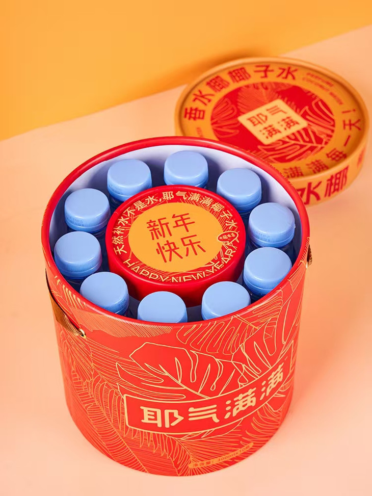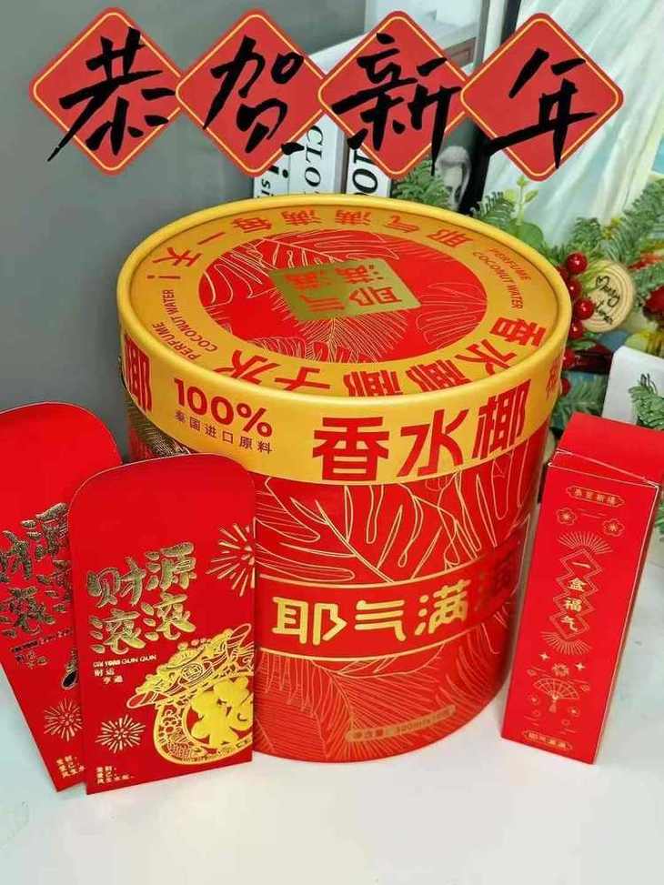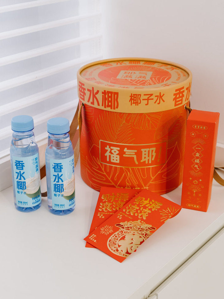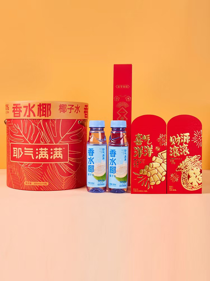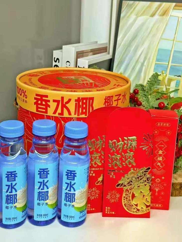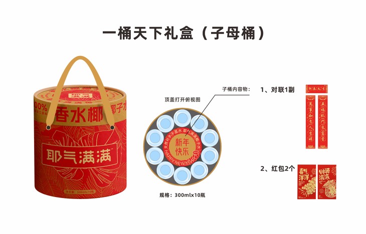 ⭕上新-耶气满满100%香水椰一桶天下礼盒 内含:香水椰300ml*10瓶+春联礼盒1个+创意红包2个 大分量品质礼盒,一盒足以诚心诚意,年尾浓浓,精致礼盒设计,送礼自用都适宜,新年送礼100%心意。