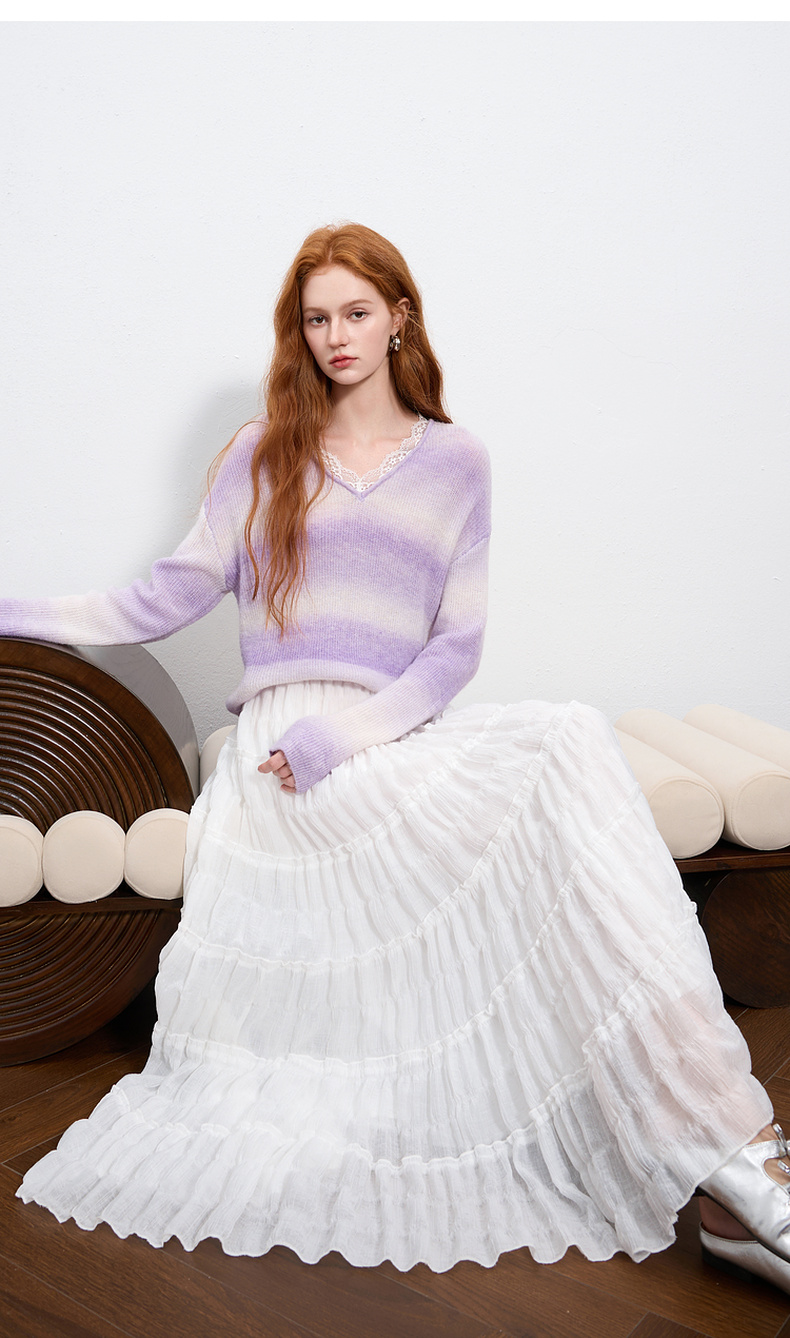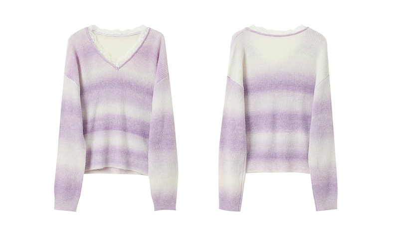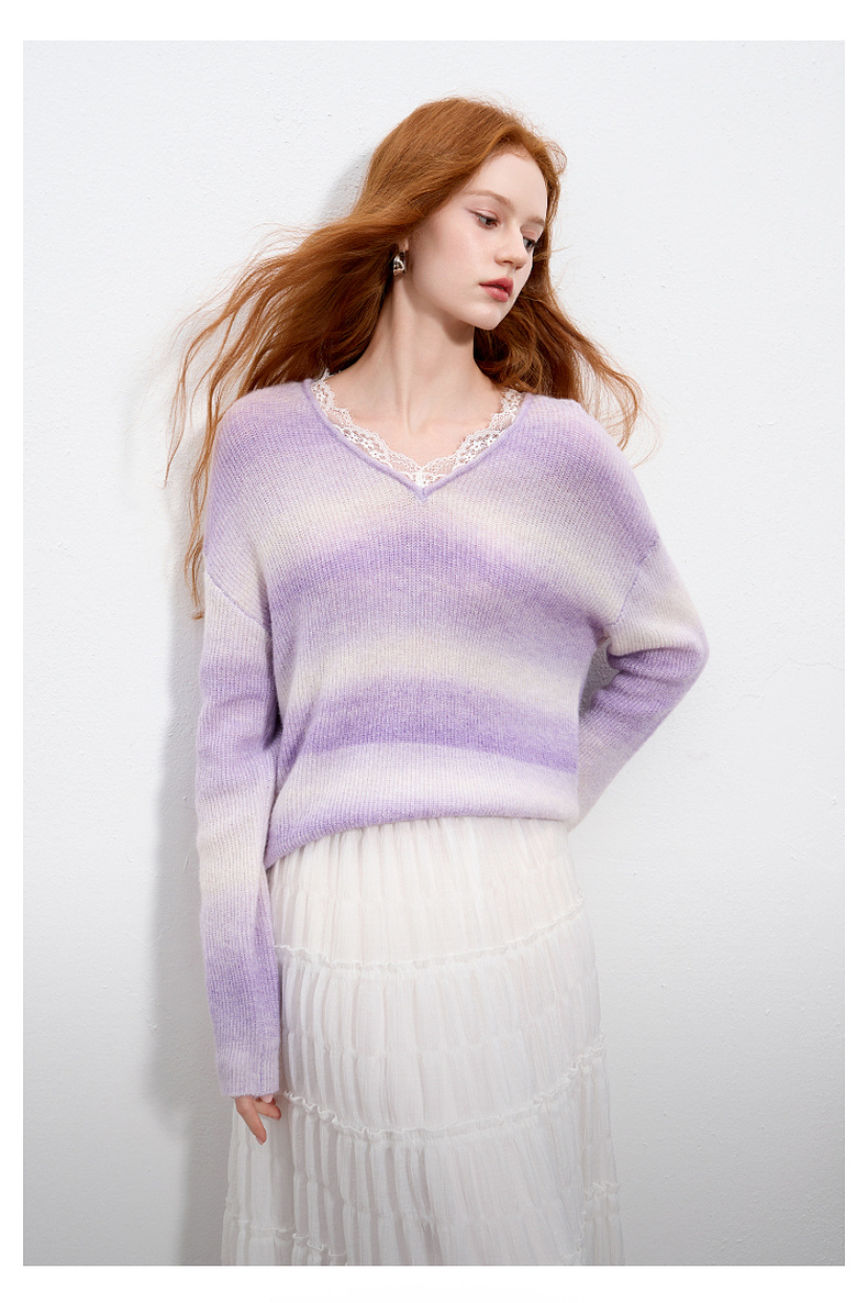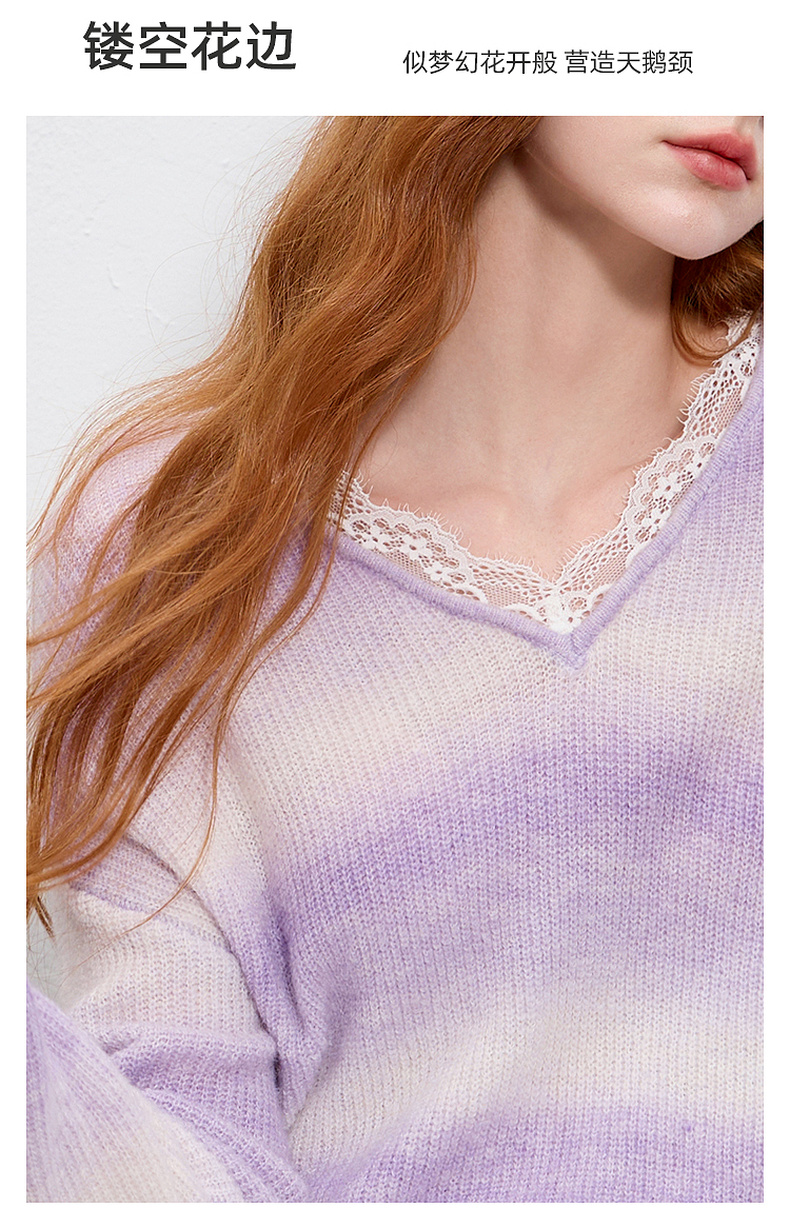 三彩2025秋季新款段染V领针织衫落肩袖毛衫渐变条纹套头衫M