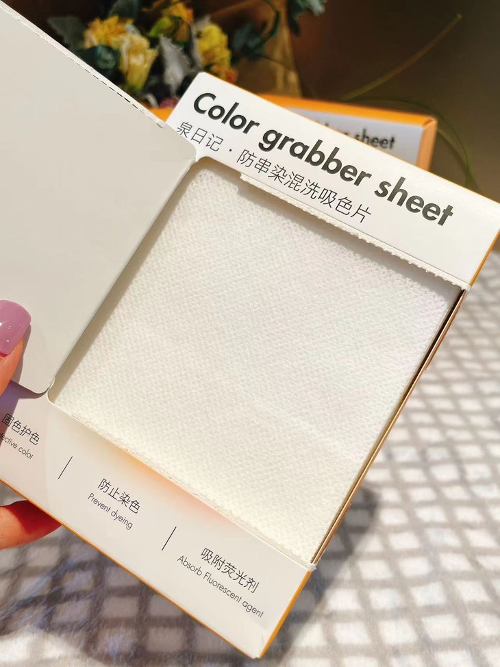 【产品名称】泉日记 · 防串染混洗吸色片 【品牌】泉日记 【规格】30片/盒 【保质期】3年 【快递】中通、韵达 【吸色原理】吸色片中,添加了防串色再生植物纤维,它能够吸附水中的游离色素!加上独特的吸色非织造布专利技术,使得被吸附的色素牢牢锁在吸色片上,达到深浅衣服混洗不串染的神奇效果。