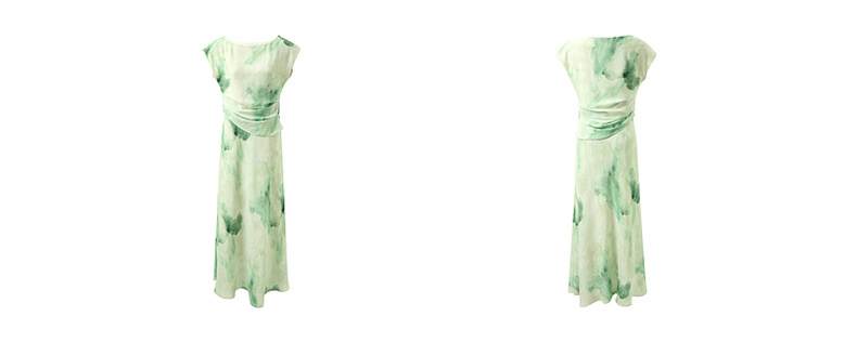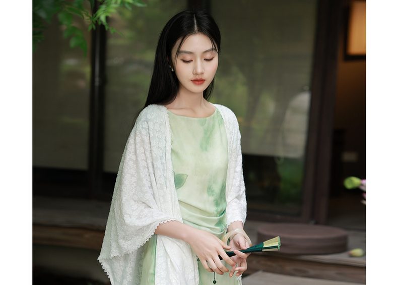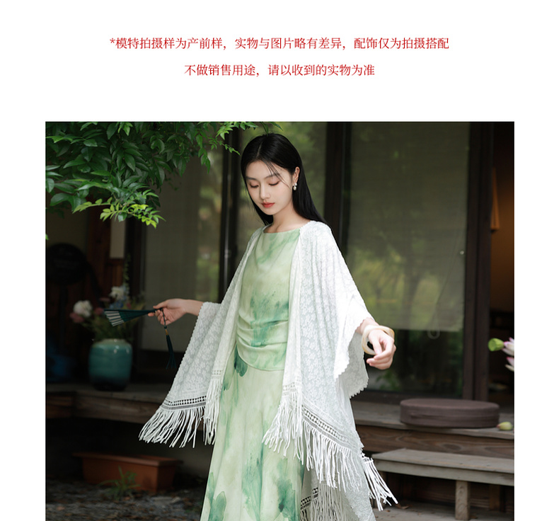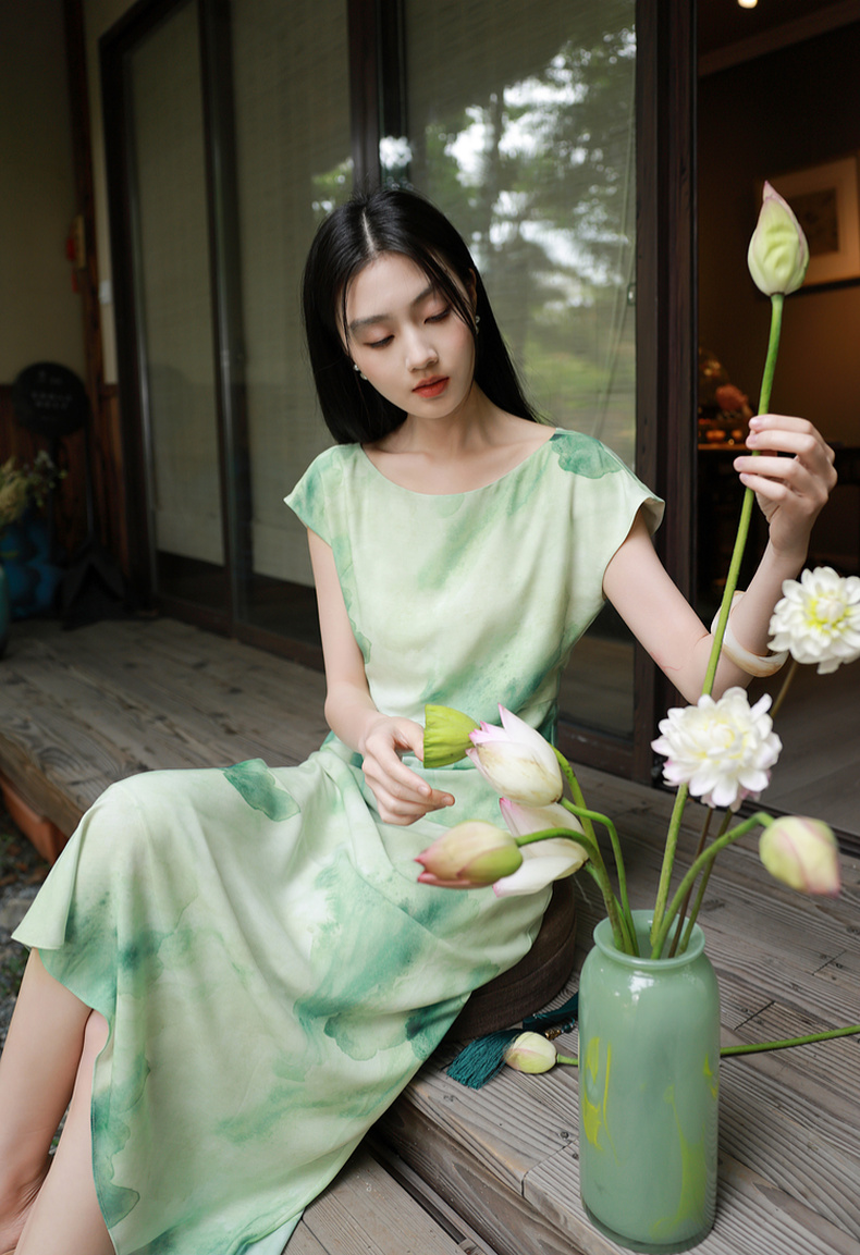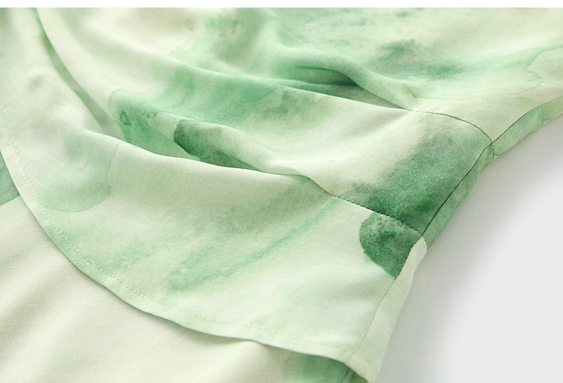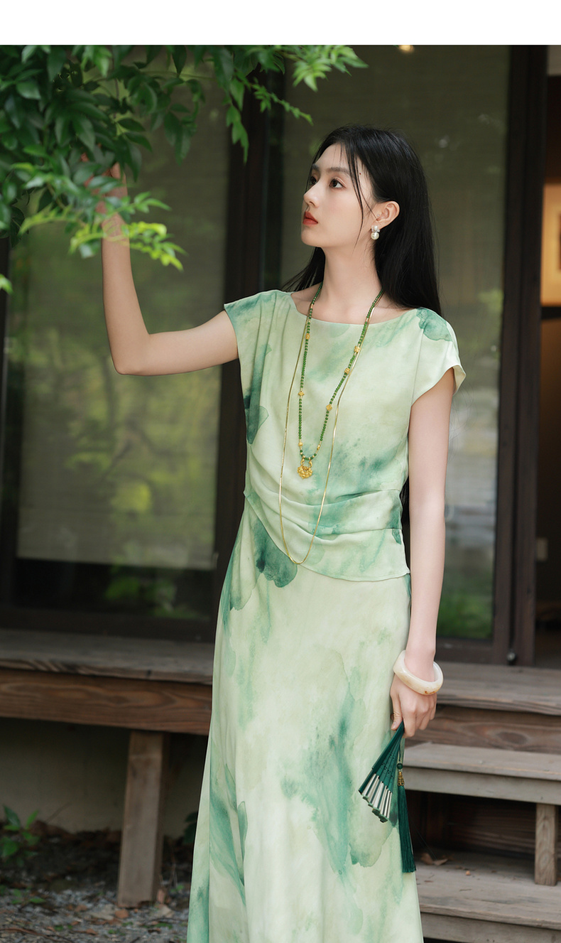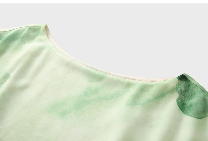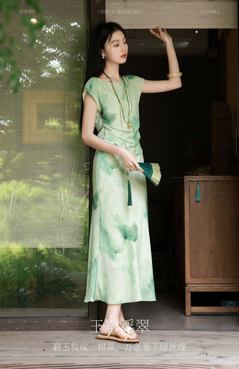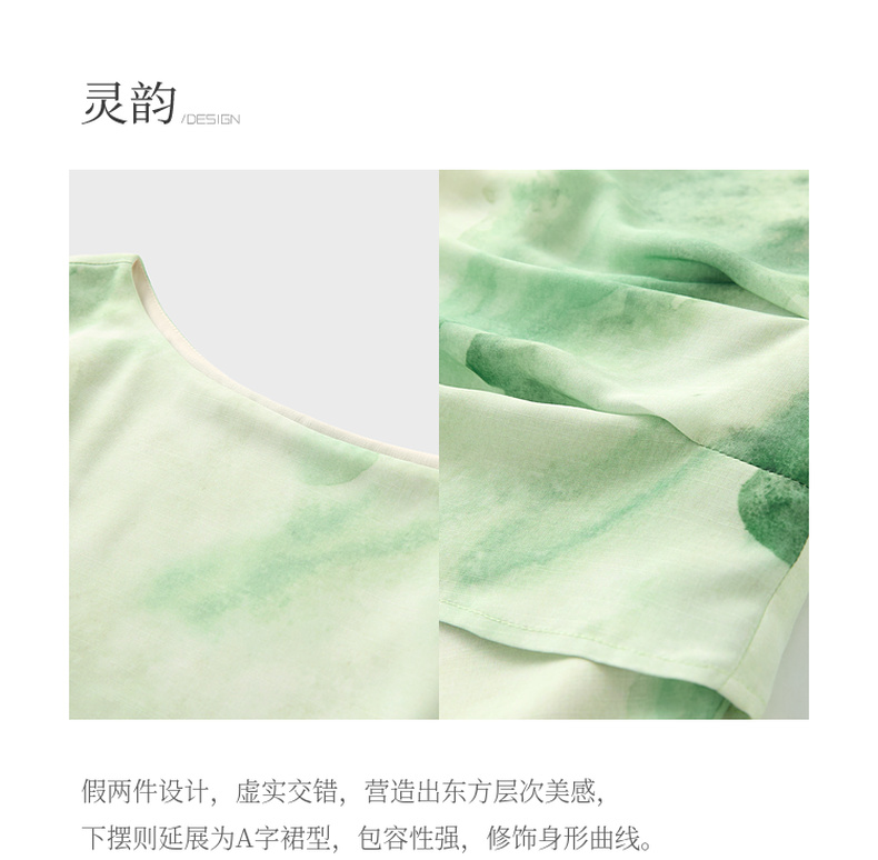 三彩【玉影浮翠】2025夏季新款新中式连衣裙假两件收腰A字裙长裙C