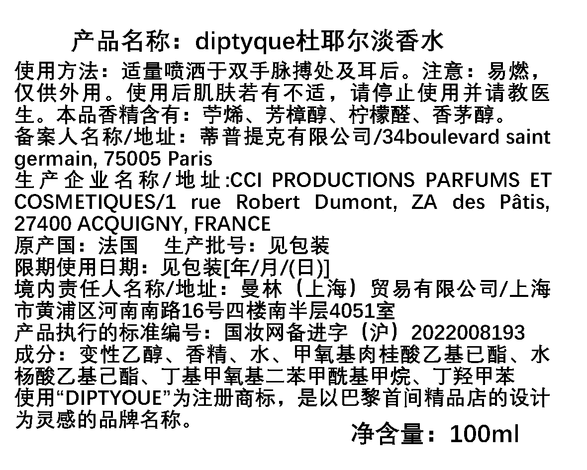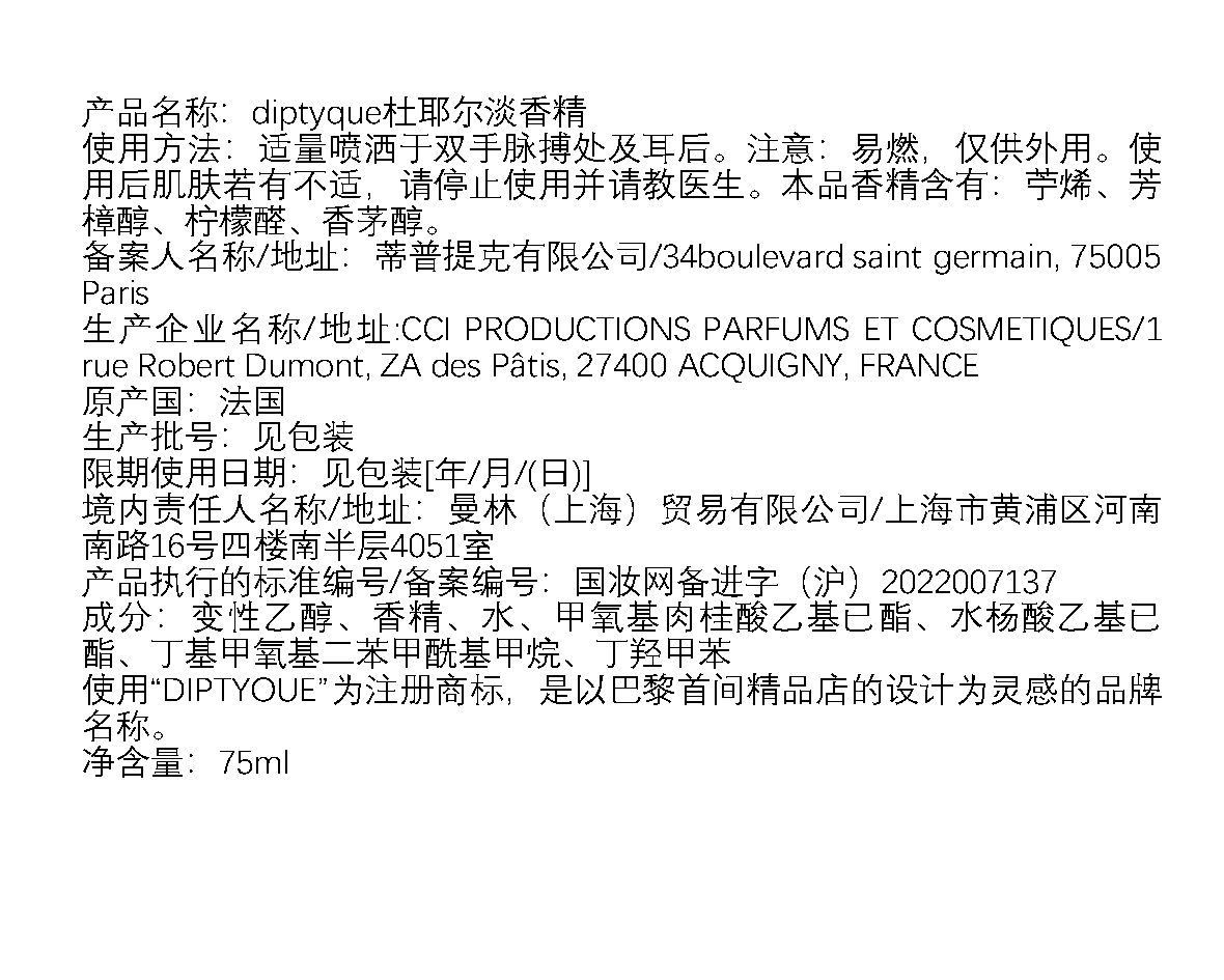 Diptyque蒂普(菩)提克 杜耶尔香水
