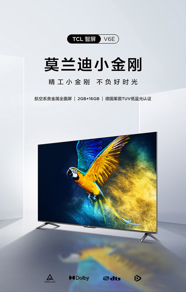 TCL电视 55V6E 55英寸 金属全面屏 2+16GB 4K超高清免遥控液晶平板电视机 京东小家 55英寸 官方标配