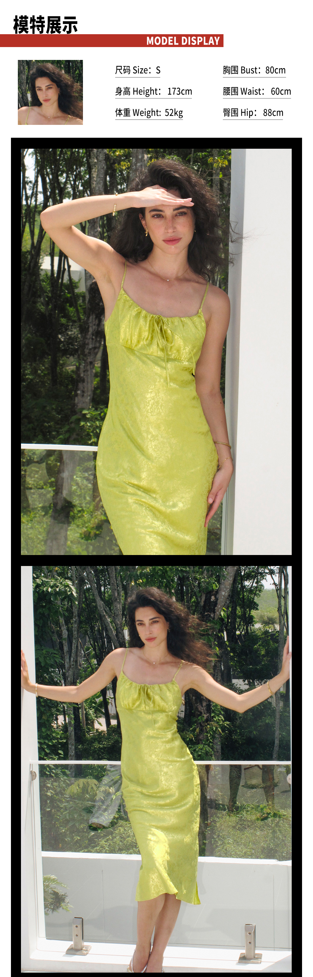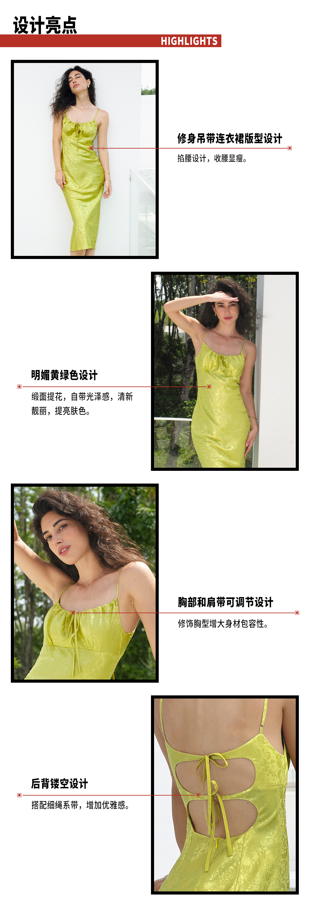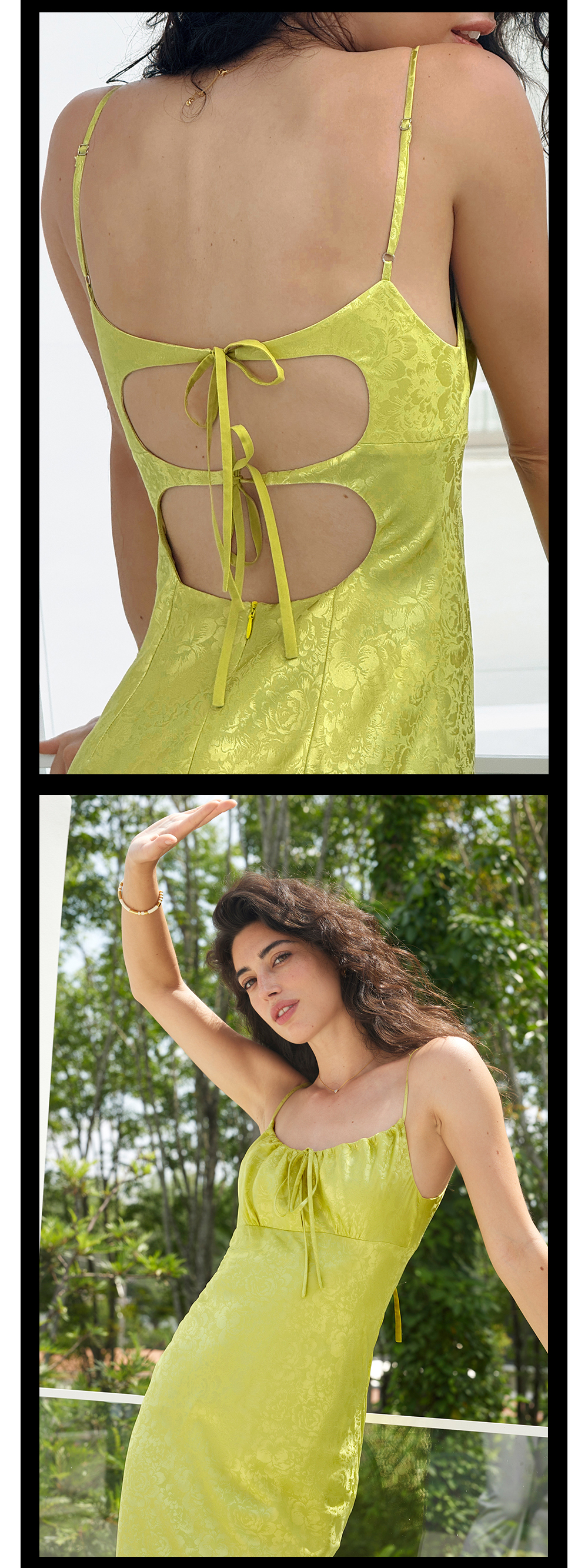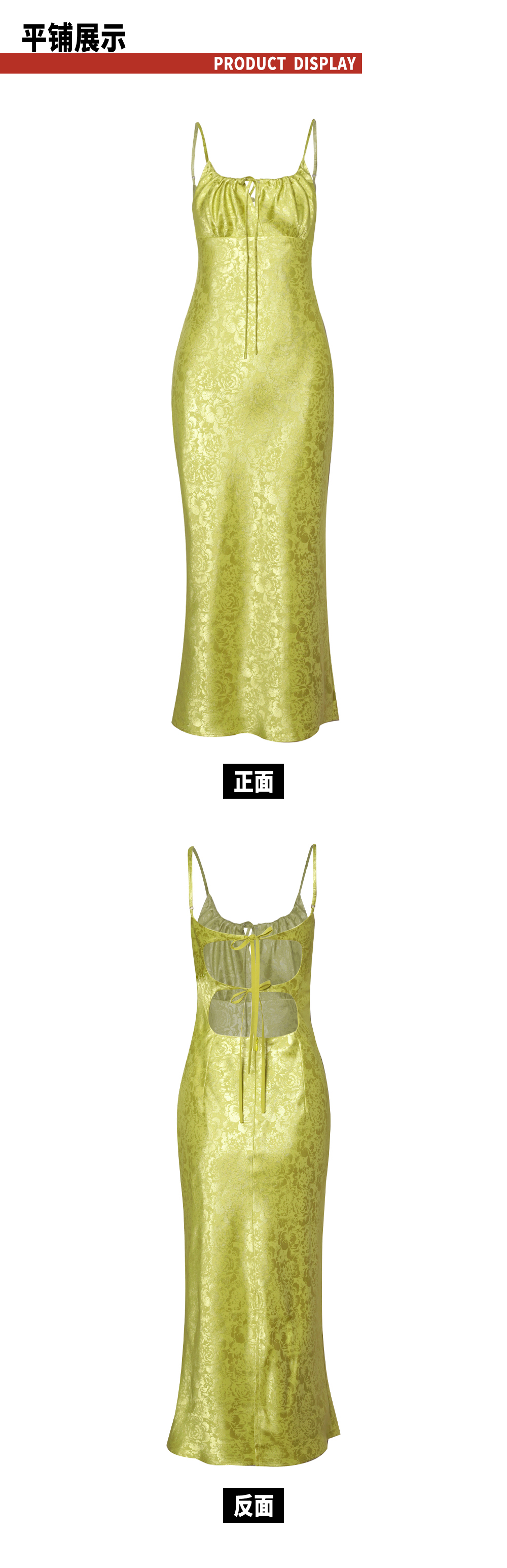 TR她热 极光琉璃 黄绿色缎面提花系带显瘦复古露背吊带连衣裙
