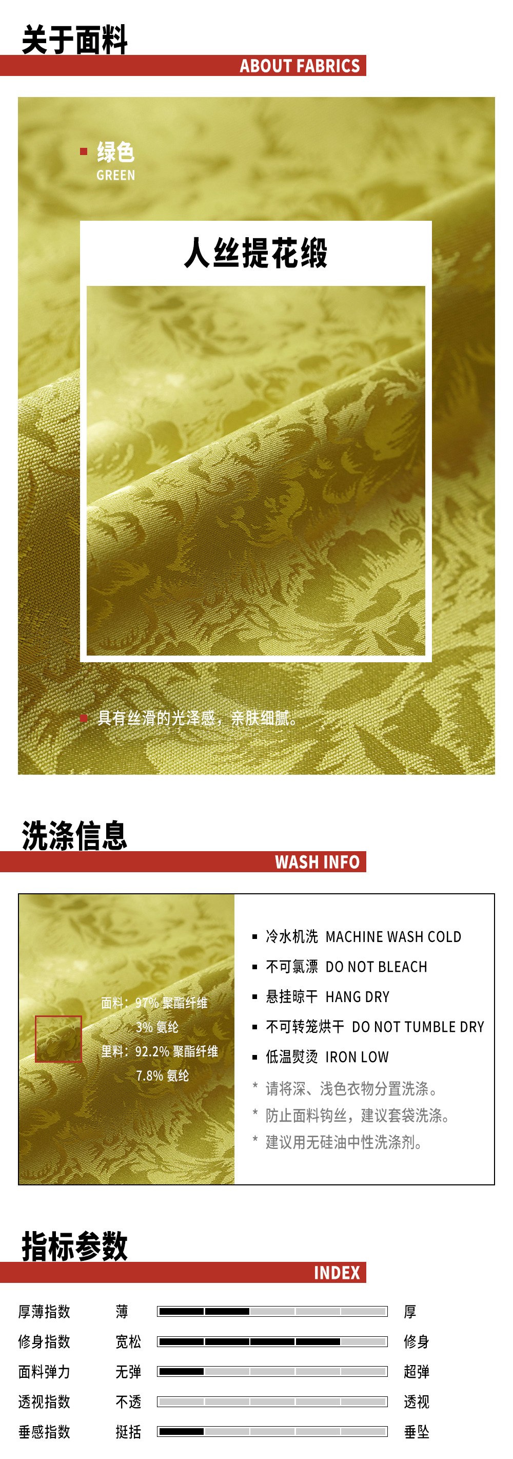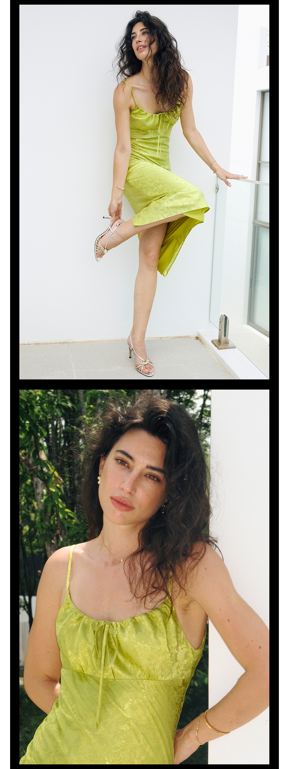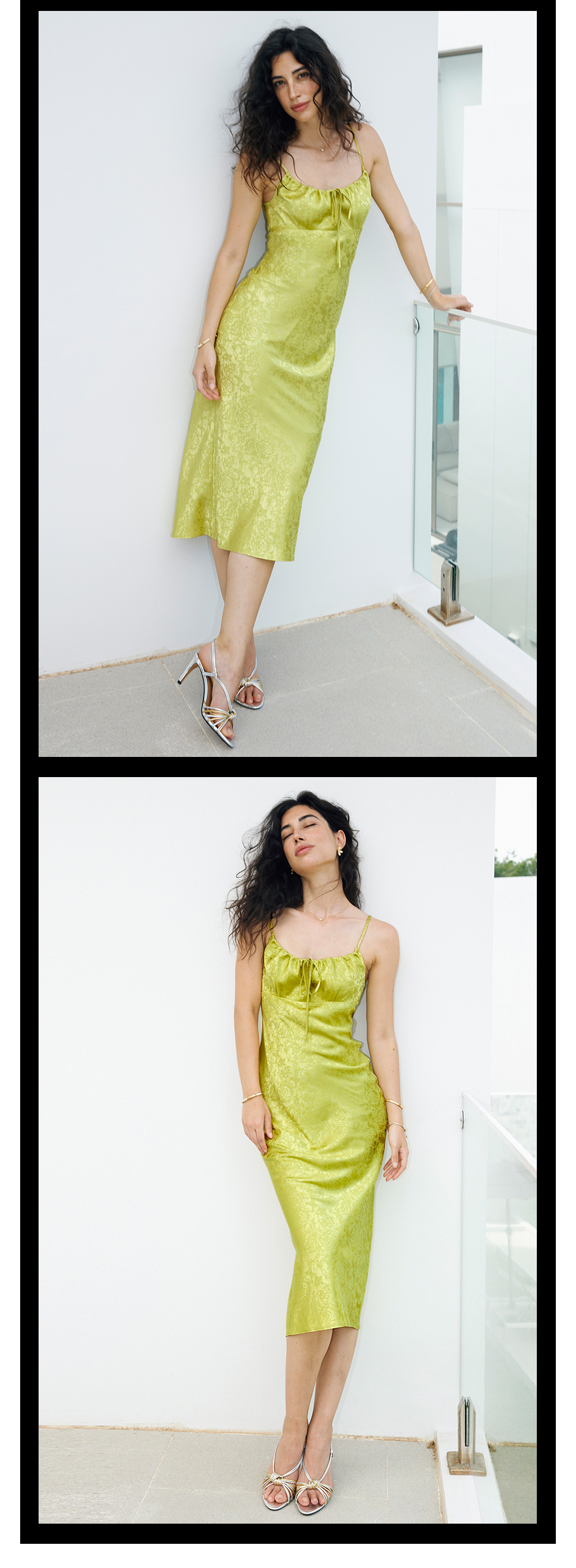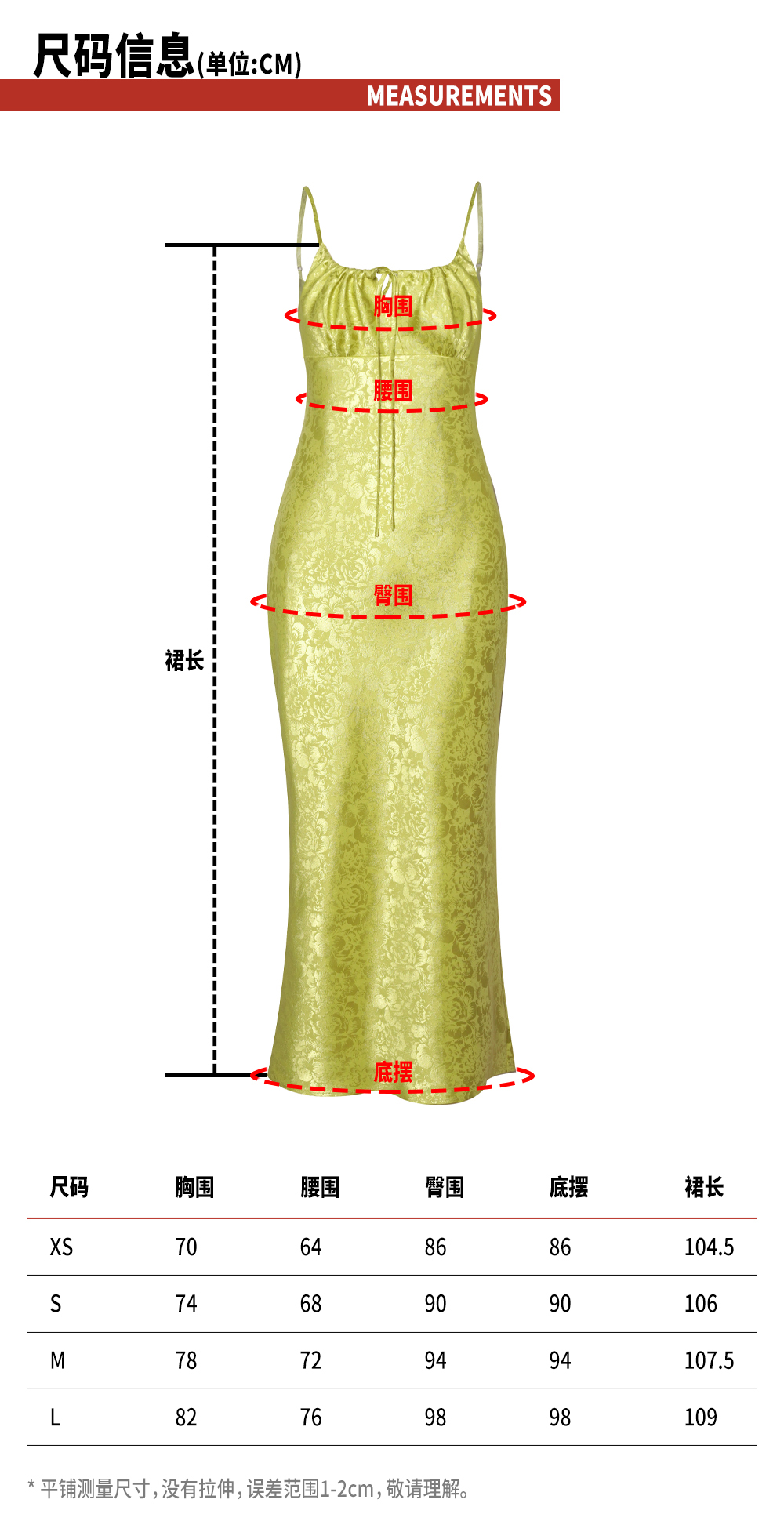 TR她热 极光琉璃 黄绿色缎面提花系带显瘦复古露背吊带连衣裙