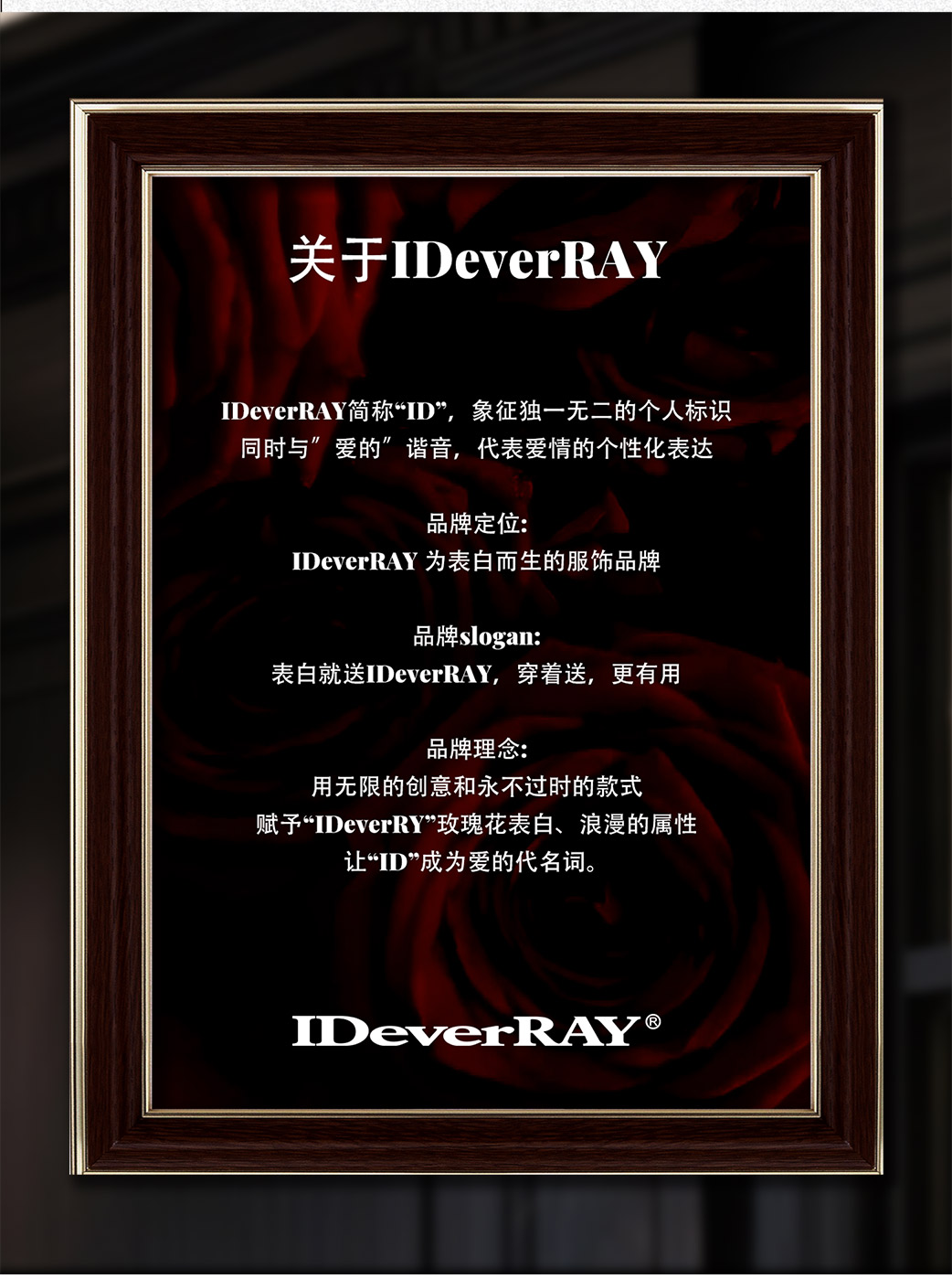 - ❣IDeverRAY简称“ID”,象征独一无二的个人标识,同时与"爱的"谐音,代表爱情的个性化表达 品牌slogan:玫瑰🌹配ID,更好的告白 品牌语言:I ID YOU