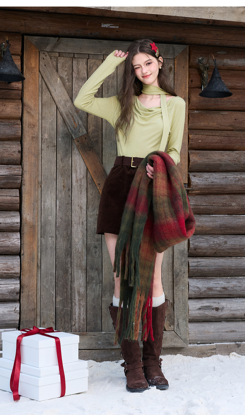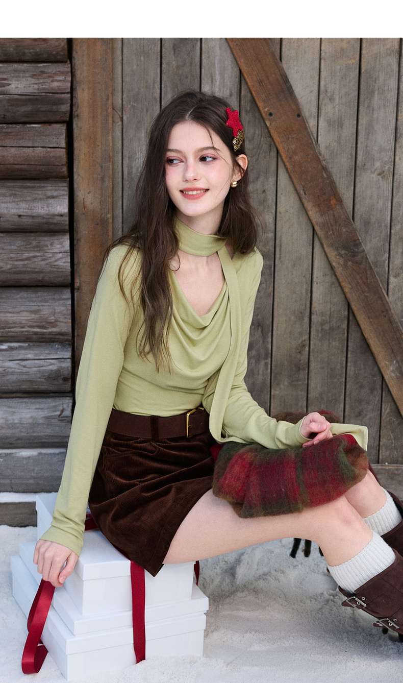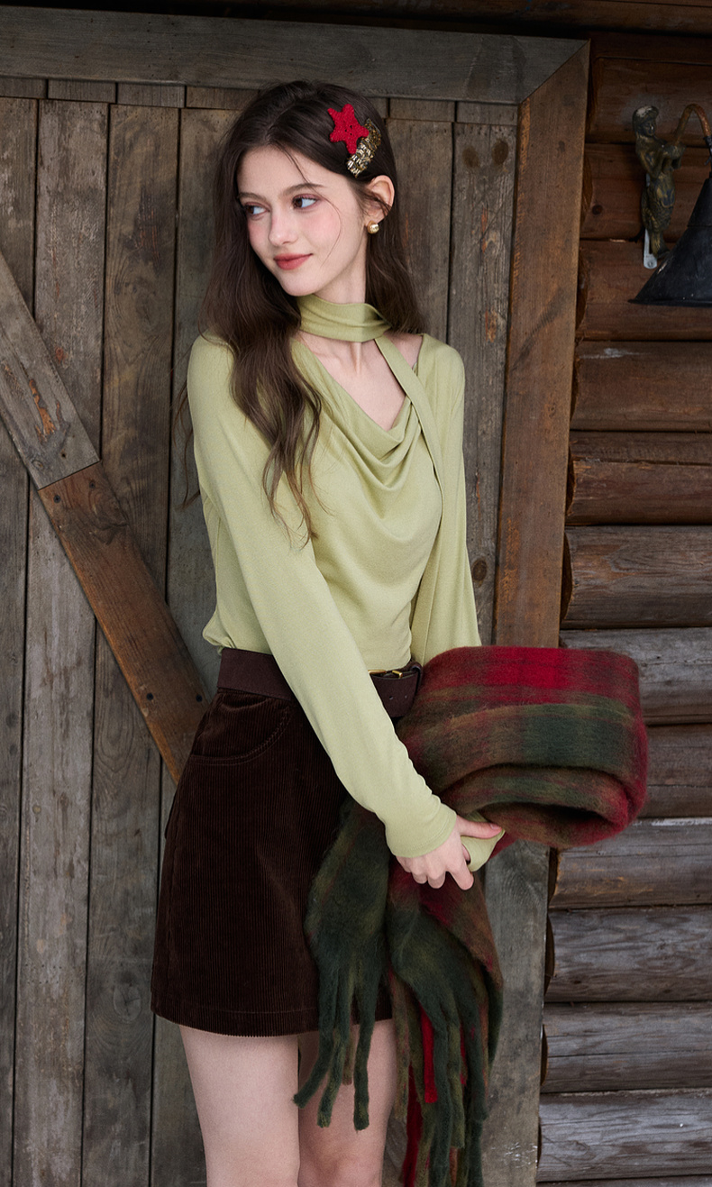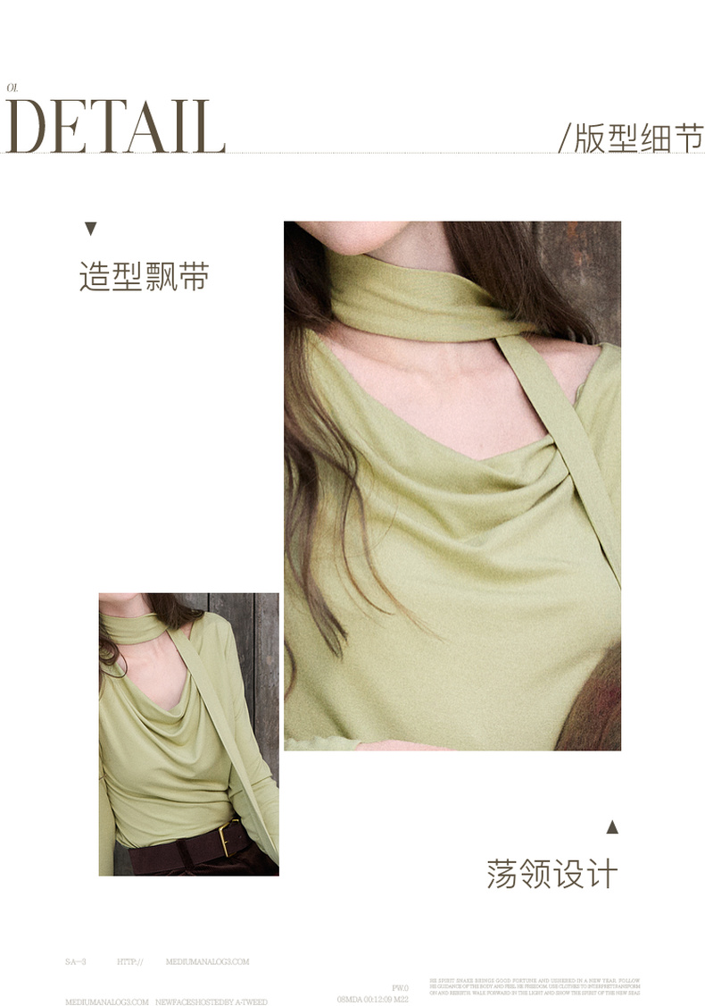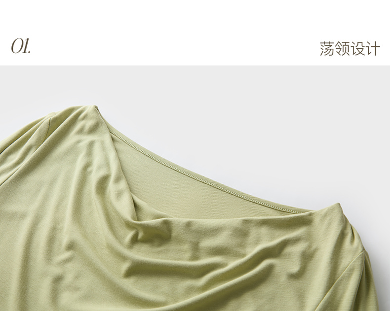 三彩独醒2026春季新款荡领T恤休闲长袖修身飘带上衣套头纯色F
