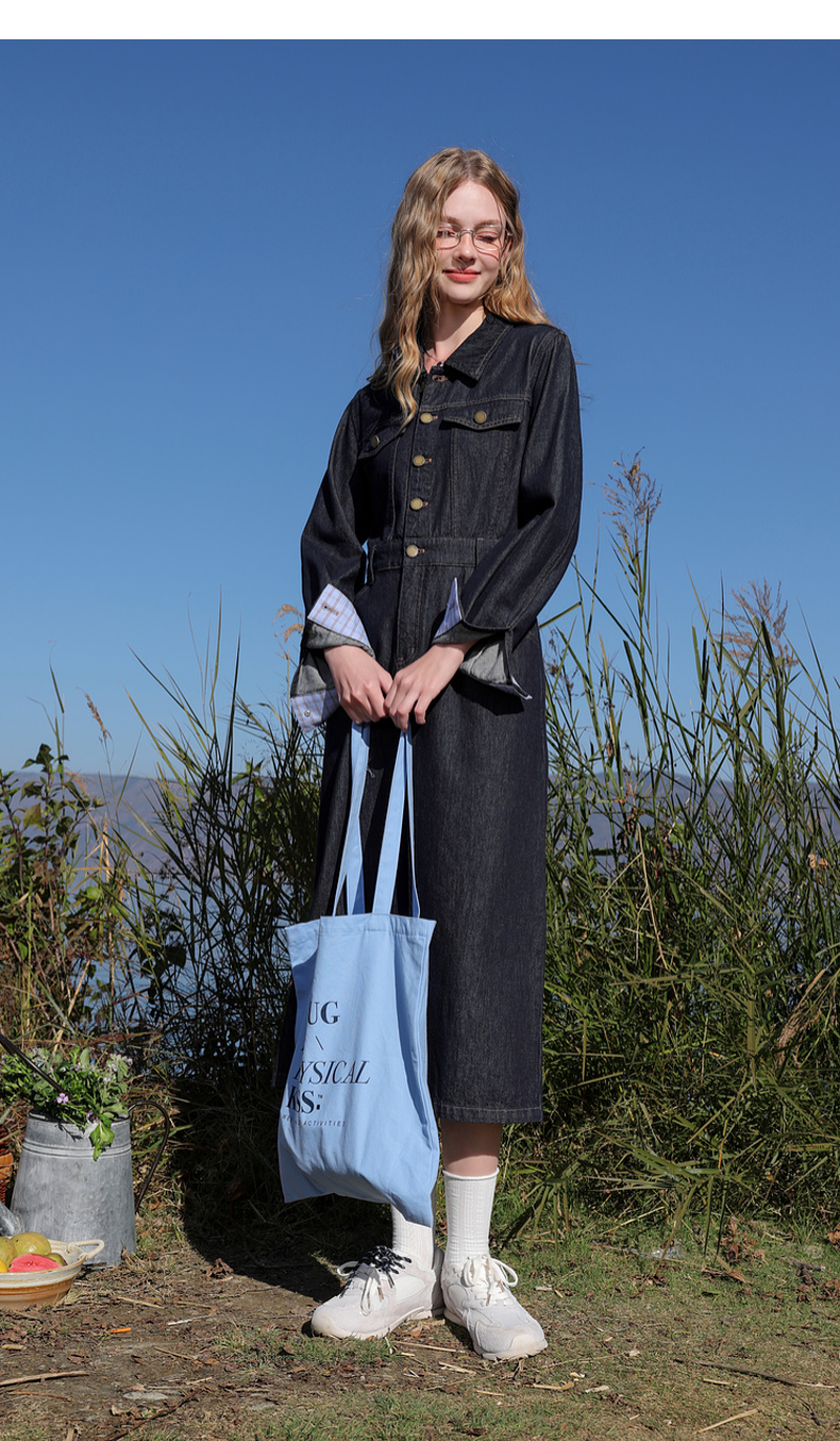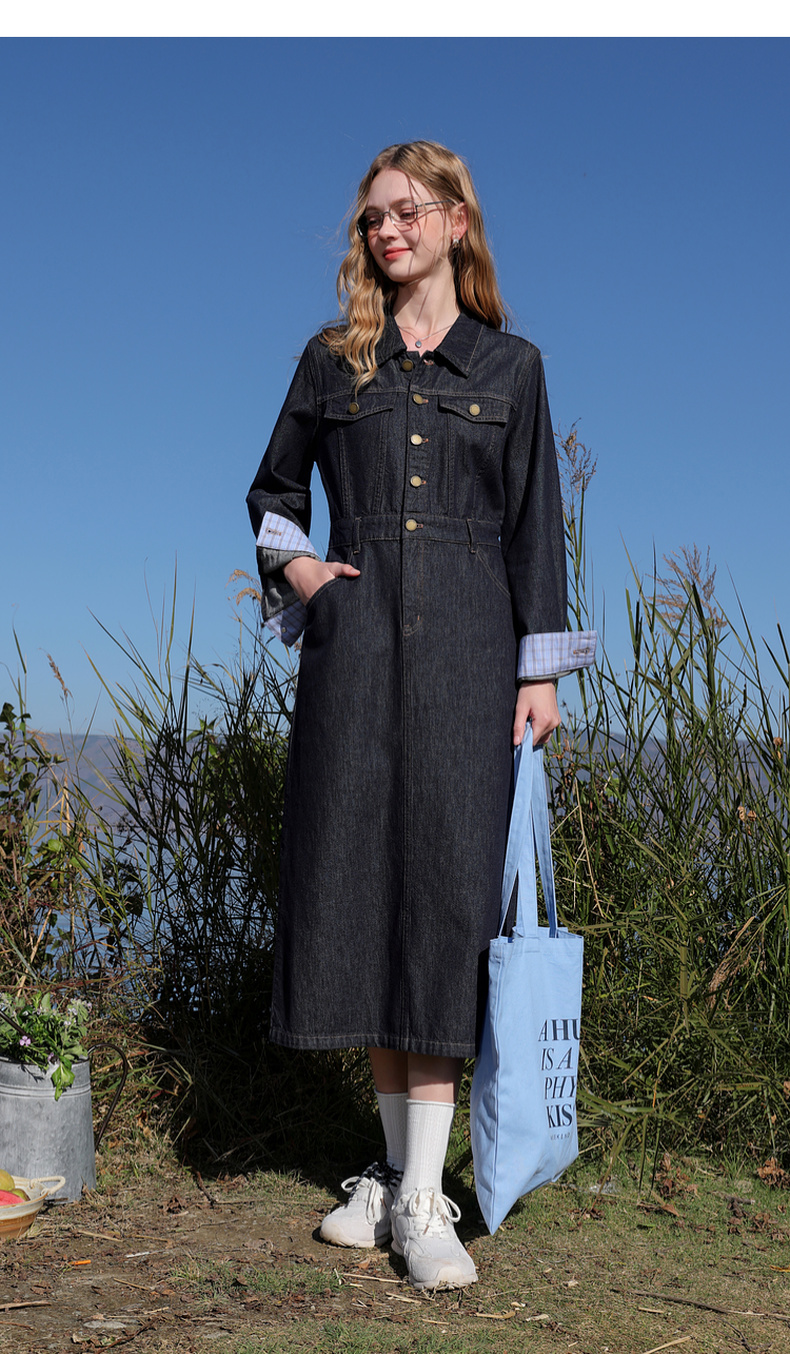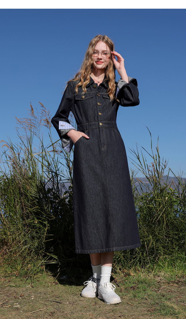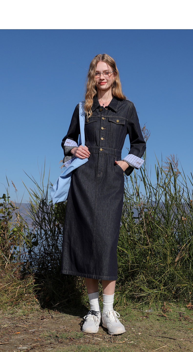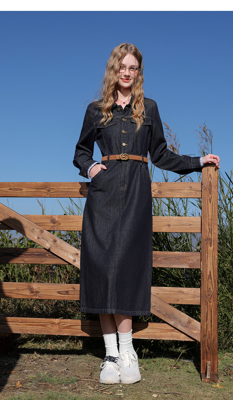 【不易褪色】三彩2026春季新款翻领收腰牛仔裙连衣裙直筒裙纯棉M