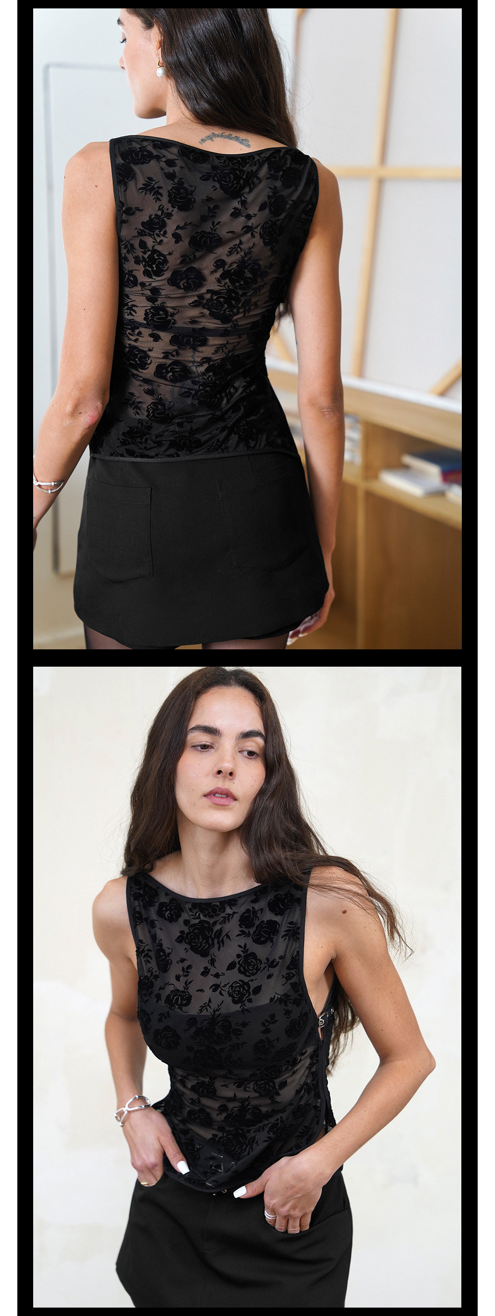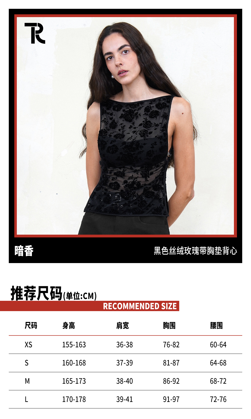 TR她热 暗香 黑色玫瑰植绒网纱透视性感复古带胸垫背心上衣