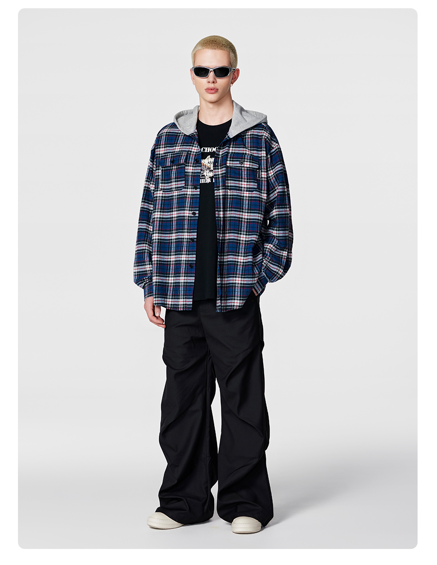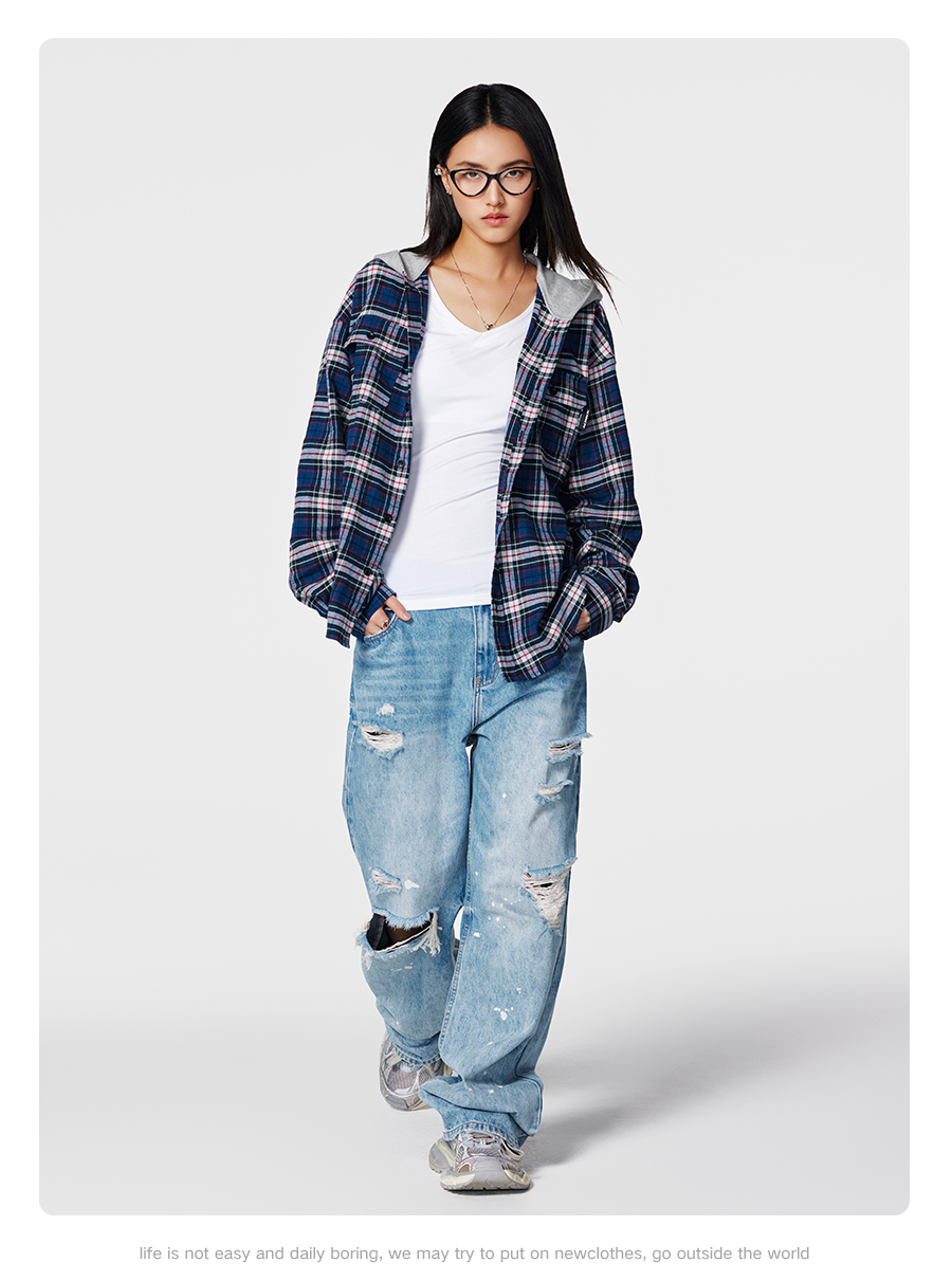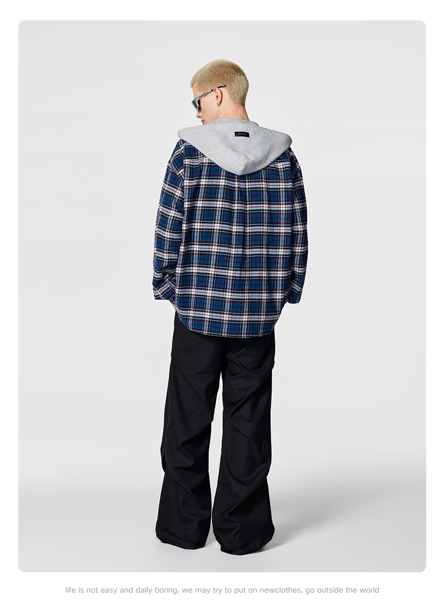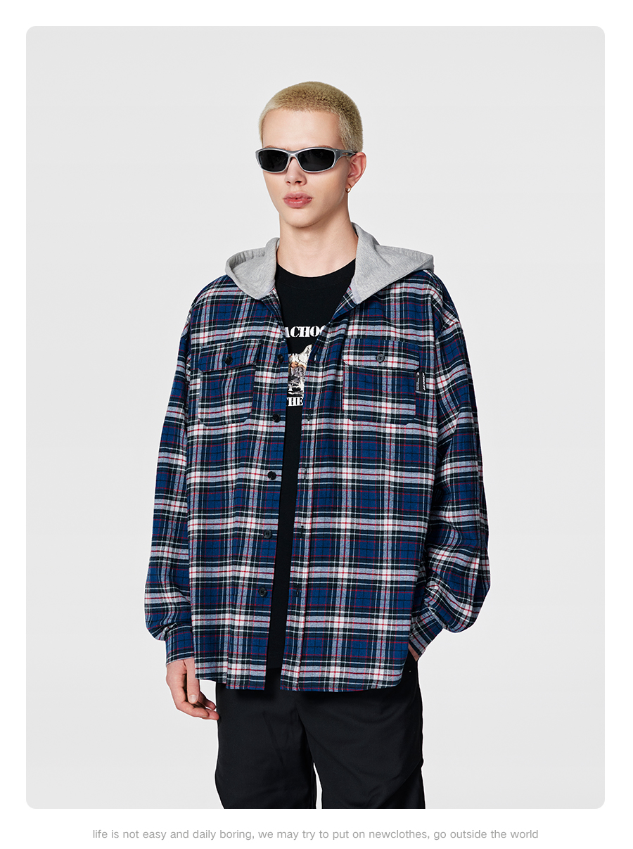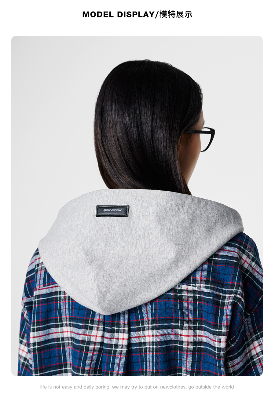 【Achock官方店】街头撞色蓝色格纹连帽长袖衬衫美式复古休闲外套