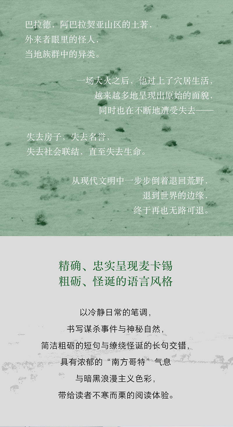 巴拉德是阿巴拉契亚山区的土著,外来者眼里的怪人,当地族群中的异类,“一个上帝的孩子,多半和你一样”。一场大火之后,巴拉德过上了穴居生活,他越来越多地呈现出原始的面貌,同时也在不断地遭受失去——失去房子,失去名誉,失去社会联结,直至失去生命。从现代文明中一步步倒着退回荒野,退到世界的边缘,终于再也无路可退。一个人是怎样被逐步剥夺殆尽的?一无所有的赤裸生命又要如何存在?“他决心继续前行,因为已经无路可回,那天的世界和往常的任何一天一样可爱,可他却在骑着骡子迈向死亡。”