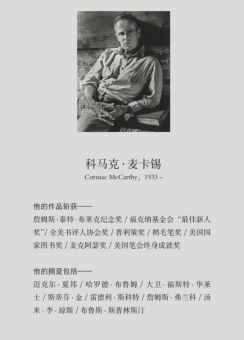 科马克·麦卡锡(Cormac McCarthy,1933— ),美国当代小说家、剧作家,已著有10部长篇小说及其他短篇作品和剧作。先后斩获普利策奖、美国国家图书奖、全美书评人协会奖等美国文学界主流奖项,多部作品被改编为影视剧,科恩兄弟改编的同名电影《老无所依》获得包括最佳影片、最佳导演和最佳改编剧本在内的四项奥斯卡大奖。