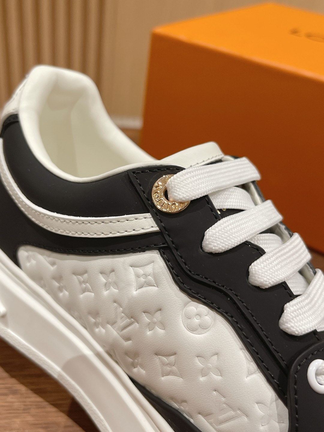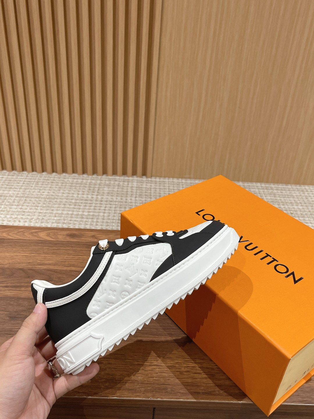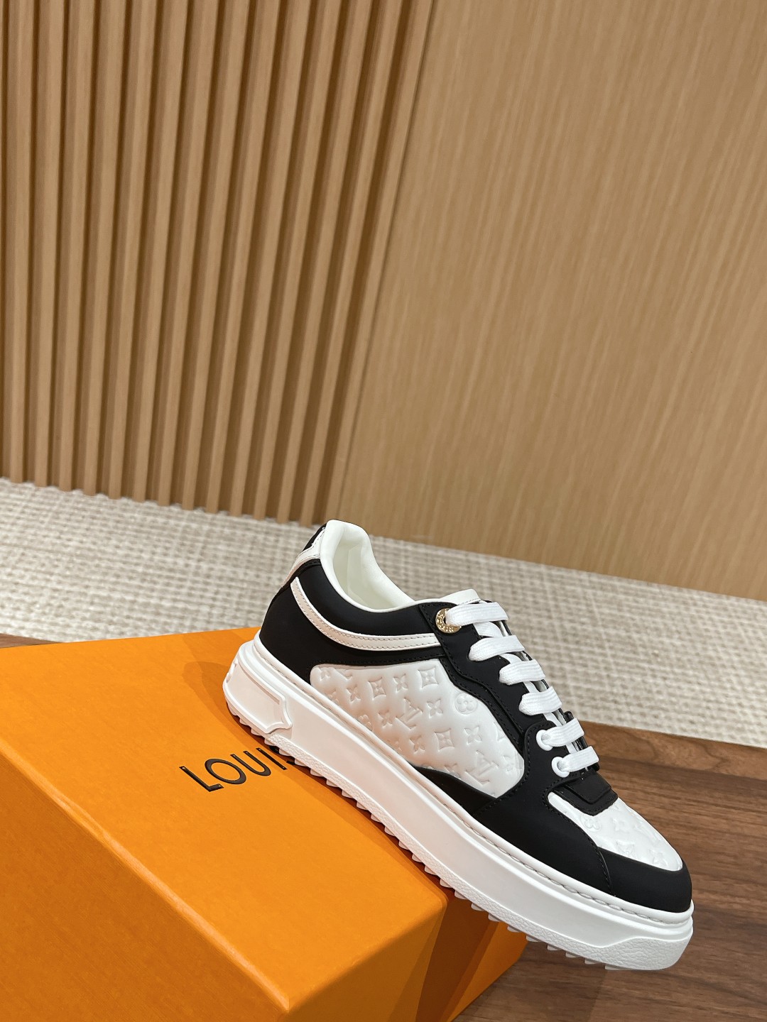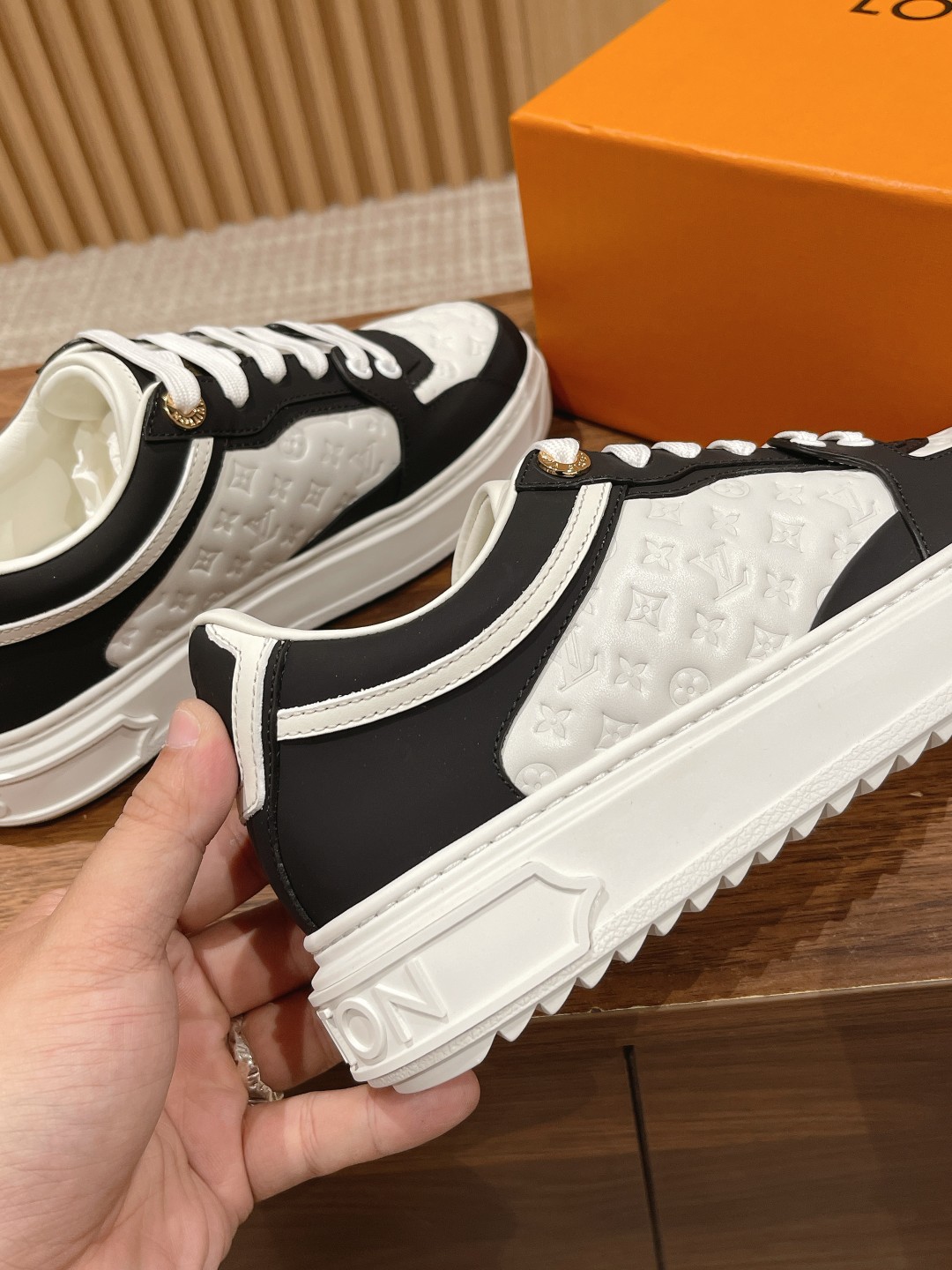 Louis Vuitton 路易威登经典厚底运动鞋2023春夏新版面 老花monogram皮革logo挂饰,精致绝伦! 本款Time Out 运动鞋取材柔软牛皮革,以耀眼光泽点亮侧面心标识。铭纹孔眼和后部金属质感皮革饰边丰富细节,加厚橡胶外底绽放 Monogram 花卉
