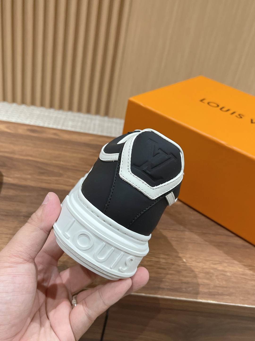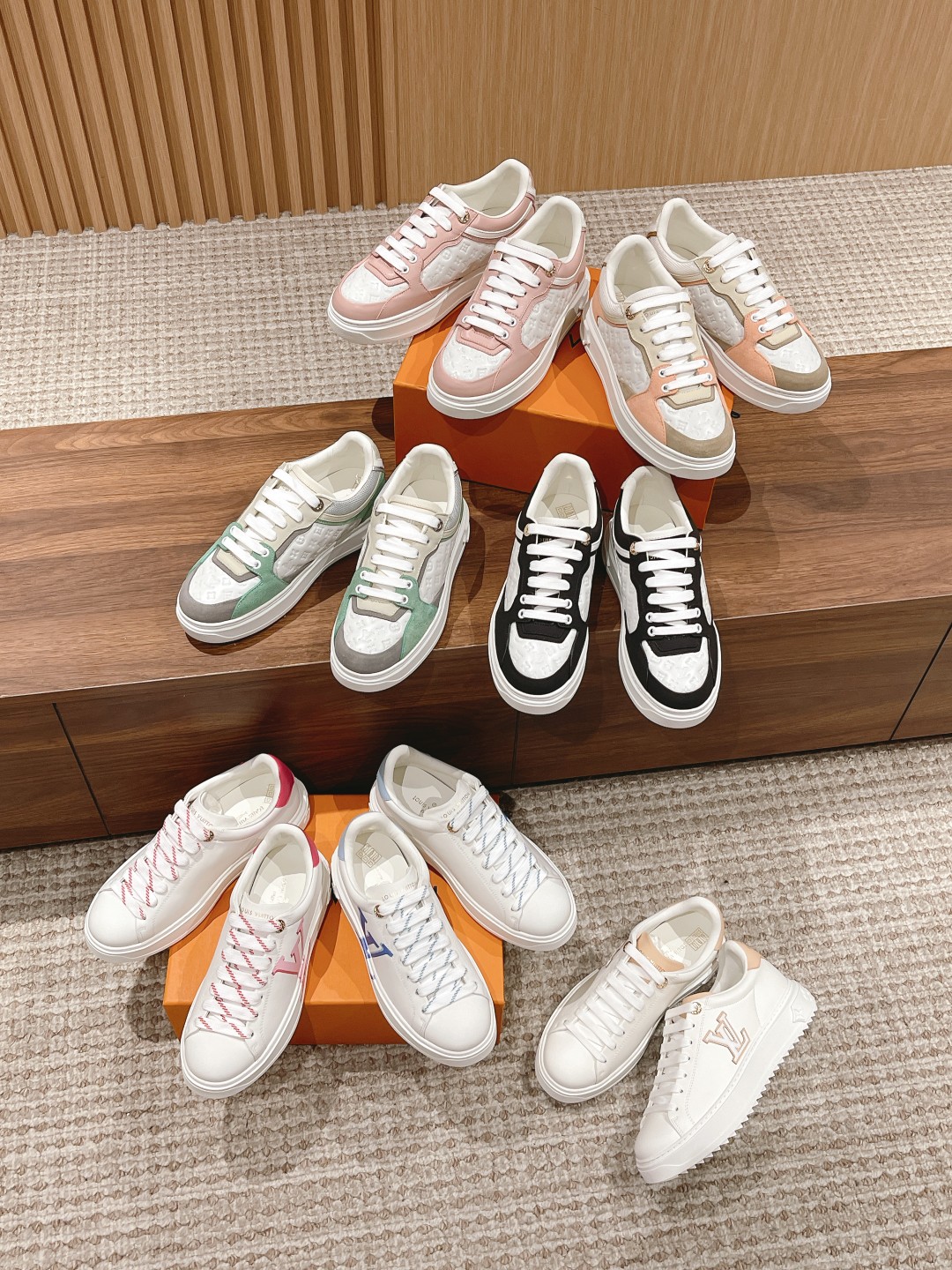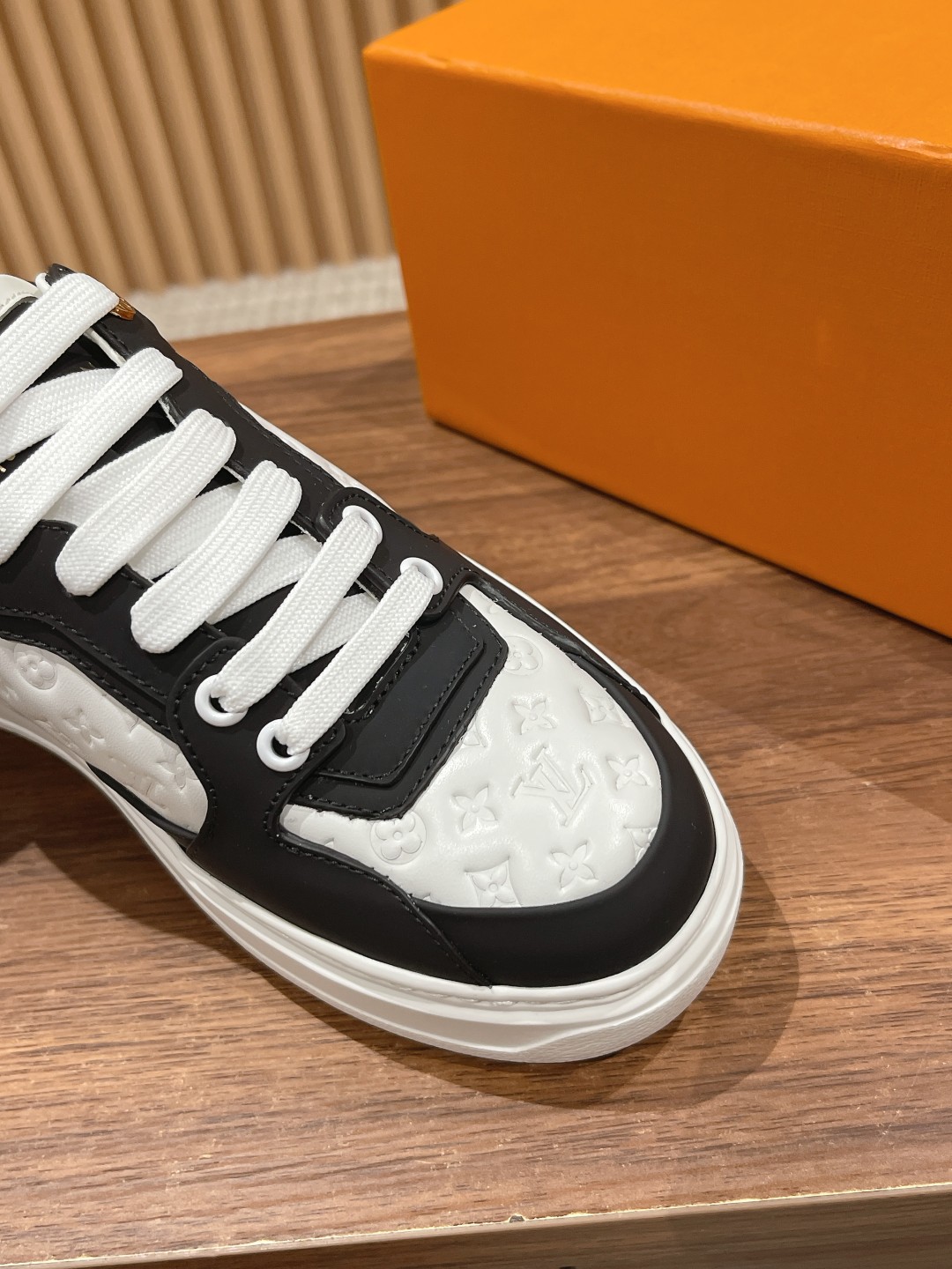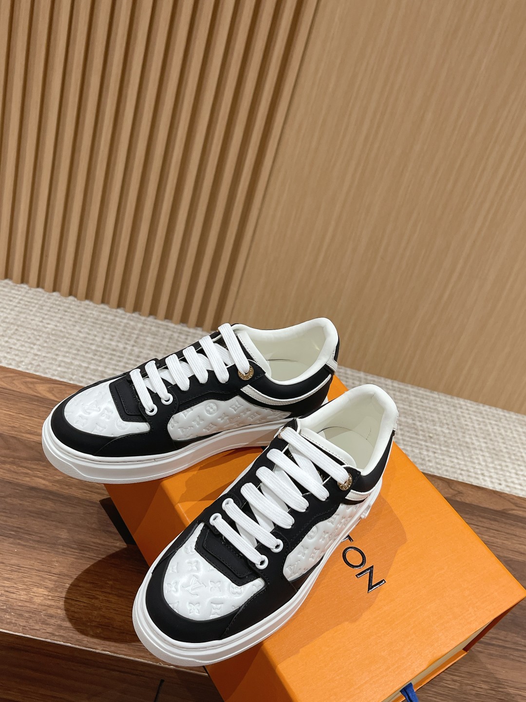 Louis Vuitton 路易威登经典厚底运动鞋2023春夏新版面 老花monogram皮革logo挂饰,精致绝伦! 本款Time Out 运动鞋取材柔软牛皮革,以耀眼光泽点亮侧面心标识。铭纹孔眼和后部金属质感皮革饰边丰富细节,加厚橡胶外底绽放 Monogram 花卉