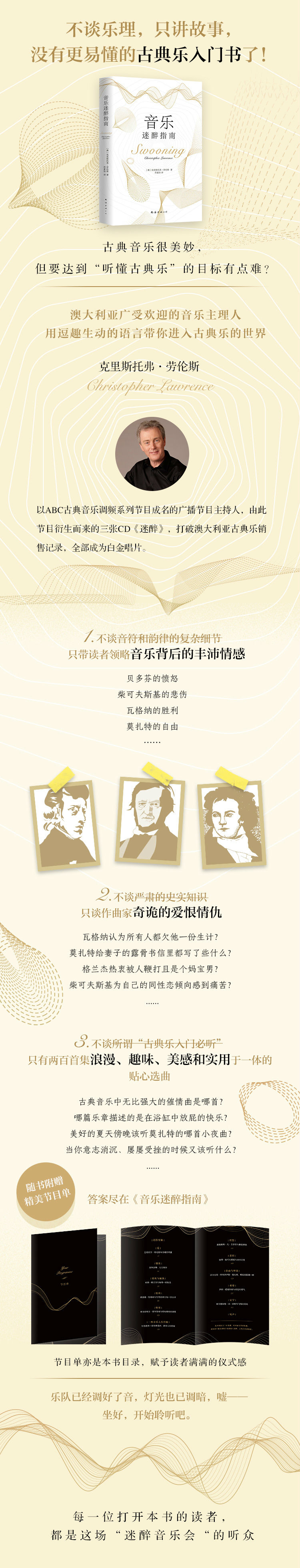 ★随书附赠《音乐迷醉指南》节目单,读本书有如聆听一场精彩的音乐会