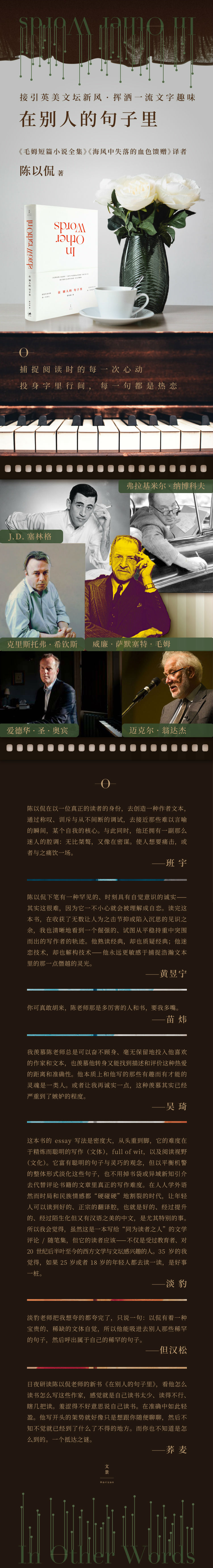 我羡慕陈老师总是可以奋不顾身、毫无保留地投入他喜欢的作家和文本,也羡慕他转身又能找到描述和评价这种热爱的距离和准确性。他本质上和他写的那些有趣而有才能的灵魂是一类人。或者让我再诚实一点,这种羡慕其实已经严重到了嫉妒的程度。——吴琦,《单读》主编