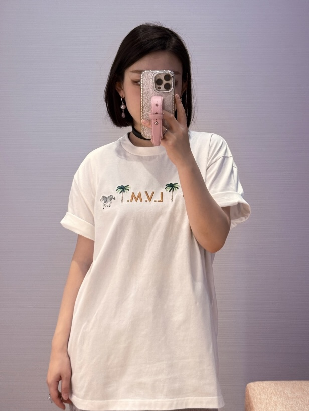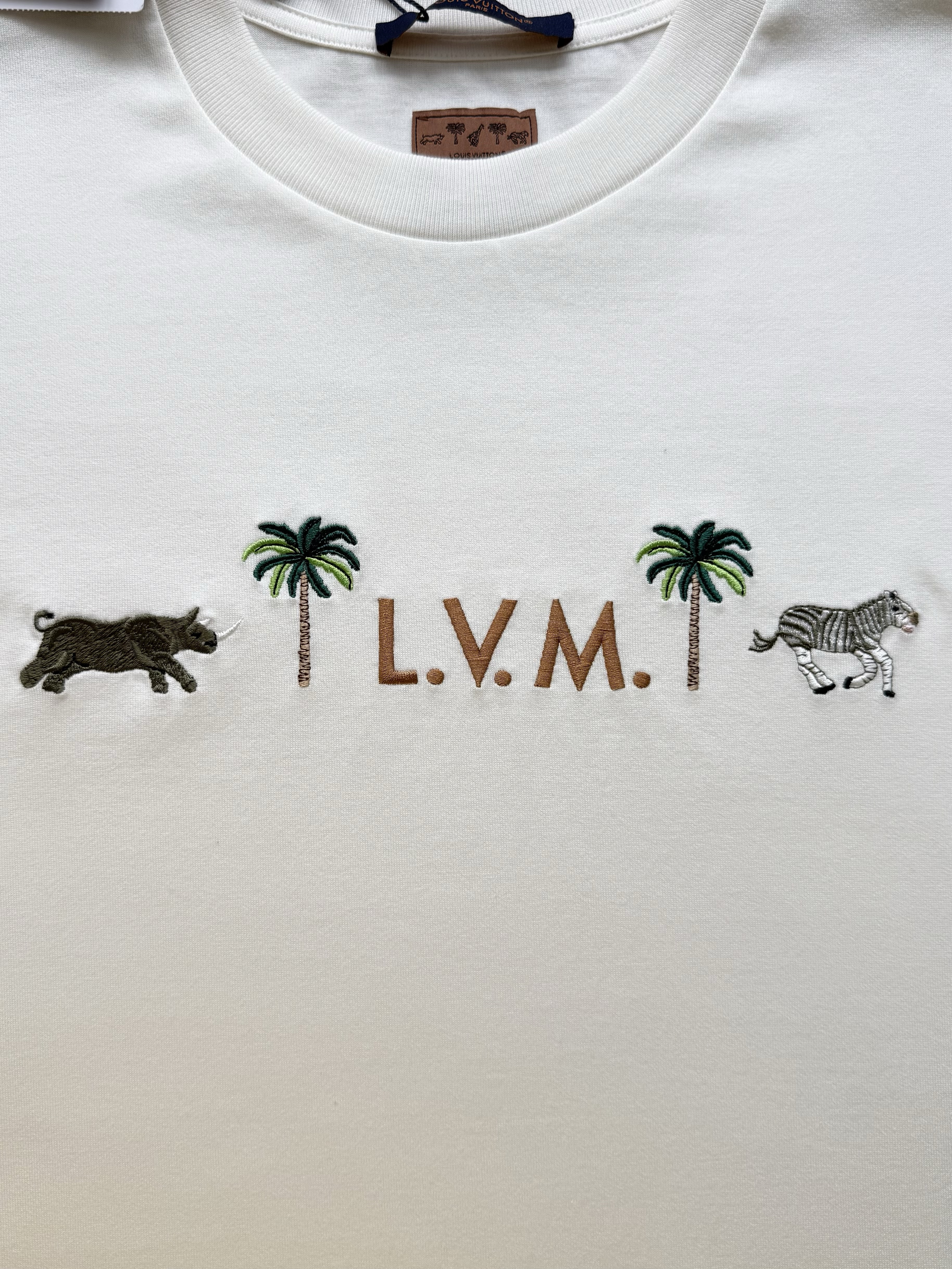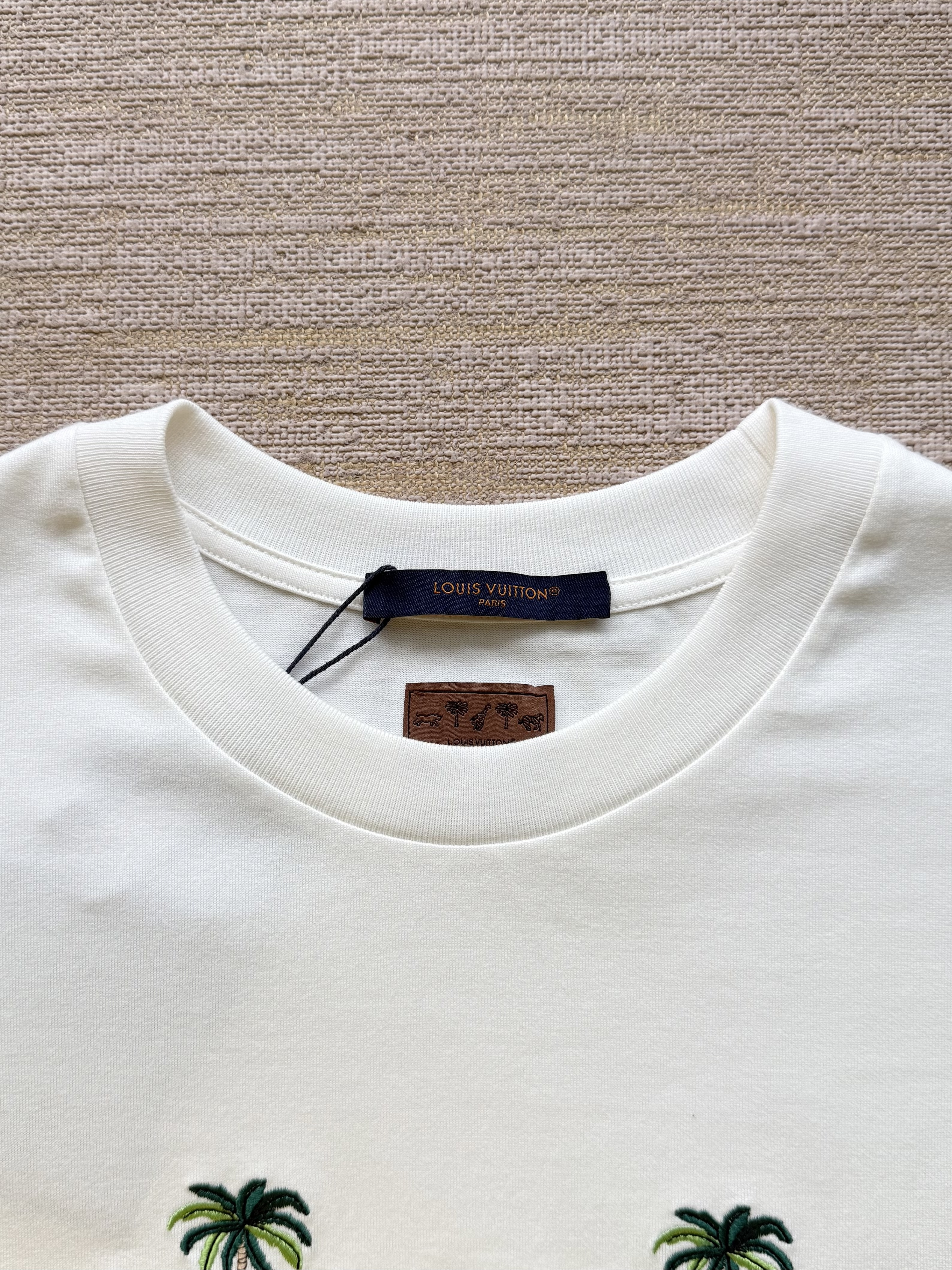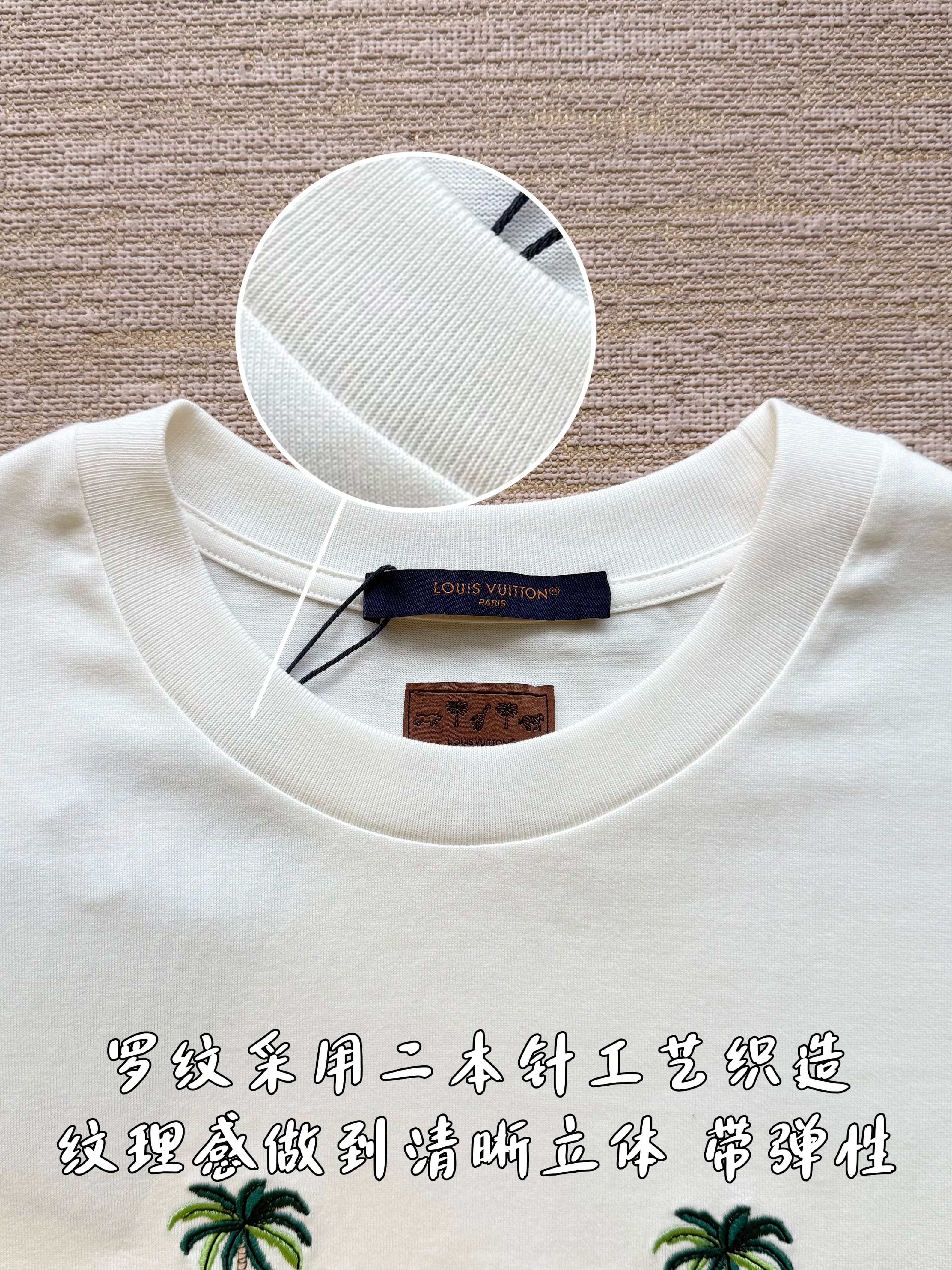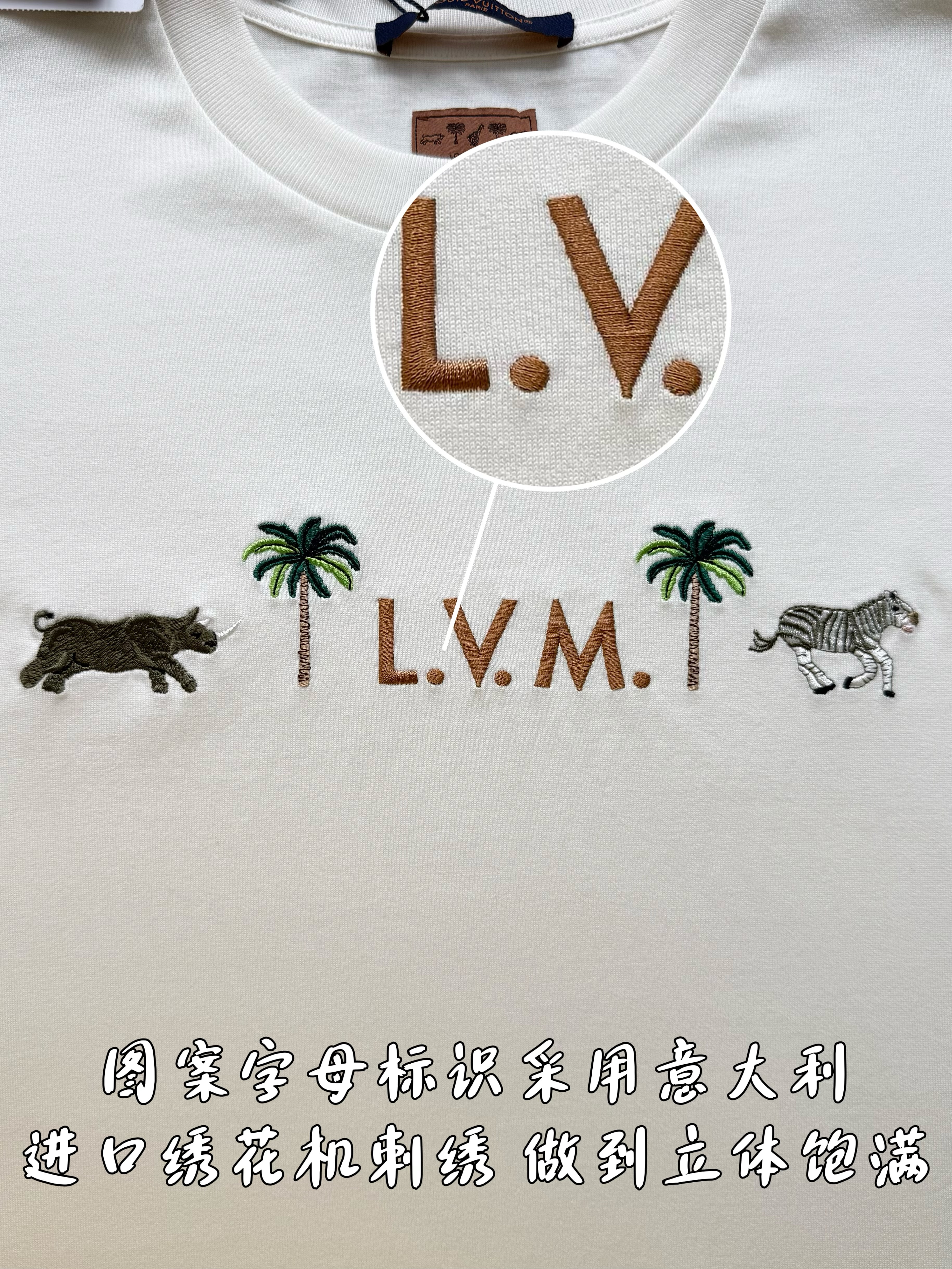 Louis Vuitton25ss椰树斑马绣花短袖T恤‼️整件衣服9350购买ZP拆解打造,采用定制白色纯棉面料,做到100%全棉进口纱线,意大利制造,前幅饰以字母标识图案刺绣,后幅饰以字母标识皮革标签,定织标志性罗纹领口,超紧密度局部编织,真正做到1:1copy