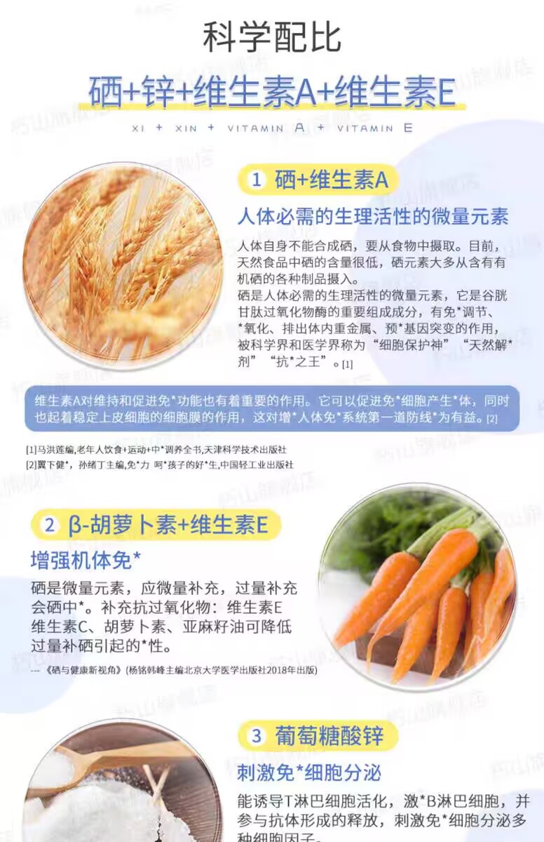 素西朽当中有维生素a、维生素e以及维生素c等营养物质成分,另外还特别添加了硒元素,这些都是身体所需要的重要营养物质,通过适当的补充以后可以维持机体生理活动,同时又可以形成更强的防护屏障来帮助调节机体免疫能力,增强身体的抗病能力,减少感冒以及其他感染问题发生。