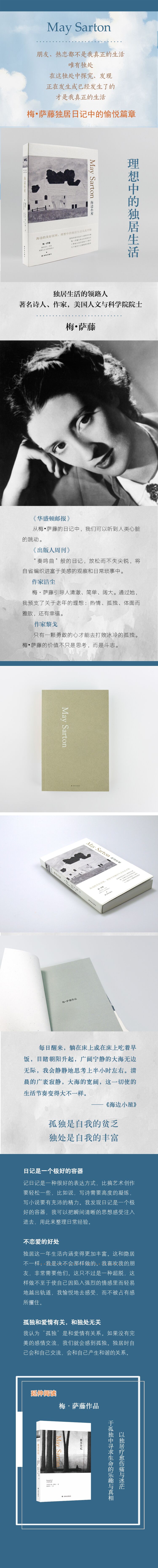 梅·萨藤,美国著名诗人、小说家、日记体作家。出生于比利时,四岁时因一战爆发随父母移民美国。梅·萨藤继承了科学史作家父亲的勤奋严谨,和艺术家母亲的创造力,在近六十年的写作生涯里,创作了五十余部作品。曾在包括哈佛大学在内的多所高校任教,作品被美国各地高校用作教材。1958年当选美国人文与科学院院士。 梅·萨藤写作半生,声誉正隆之际,选择隐居避世,侍弄花草,思考创作,以日记与自己对话。这些日记的出版将梅?萨藤的写作推至一个新的高度,为她赢得国际性声誉。其中以《独居日记》《海边小屋》为代表之作,《独居小屋》更被认为是“现代女性自传的里程碑”。