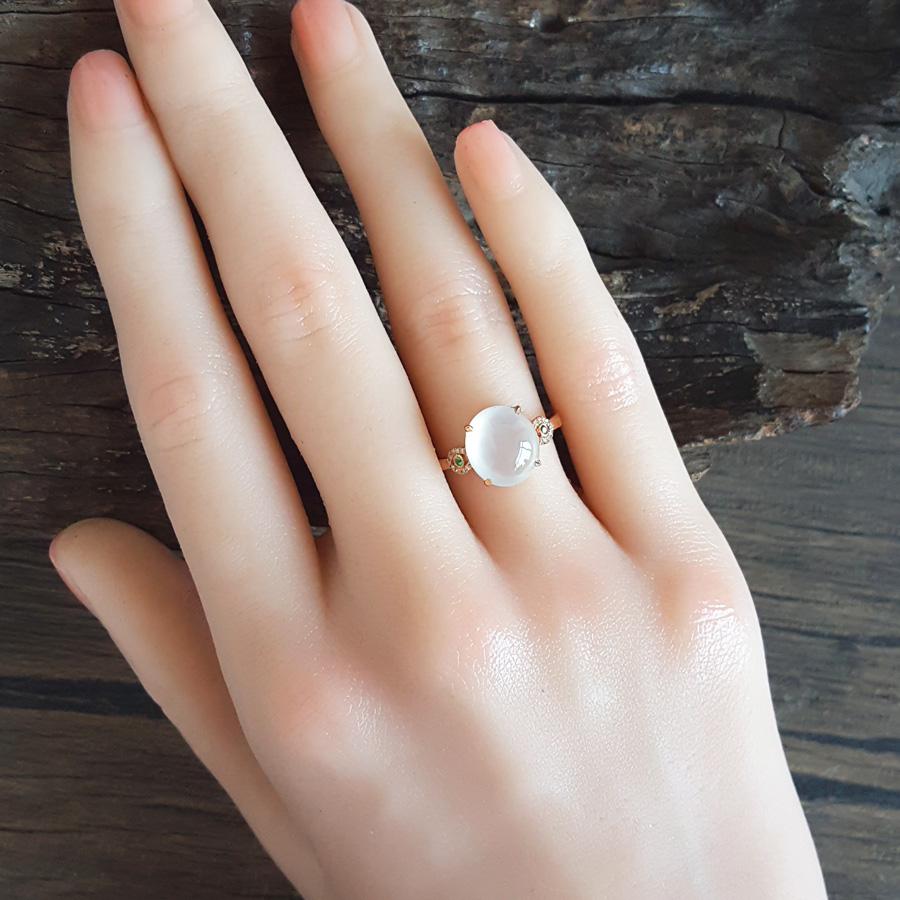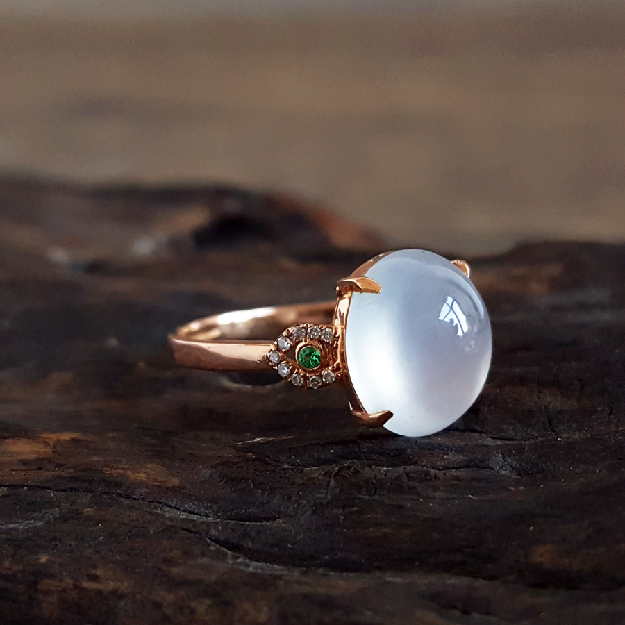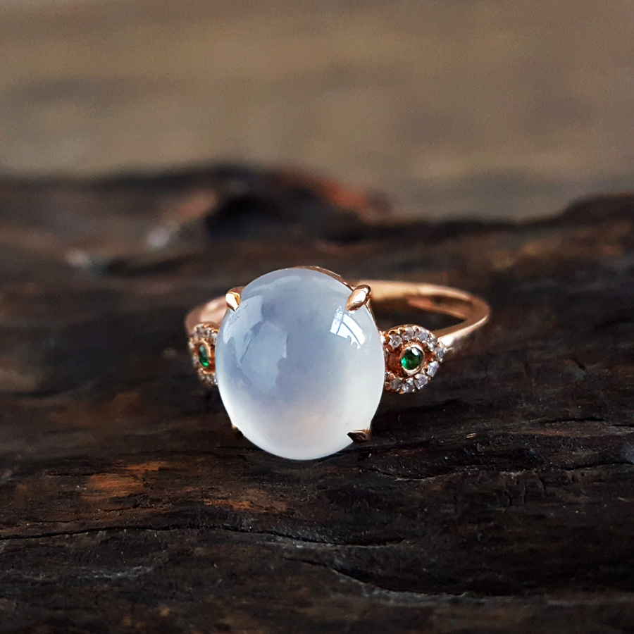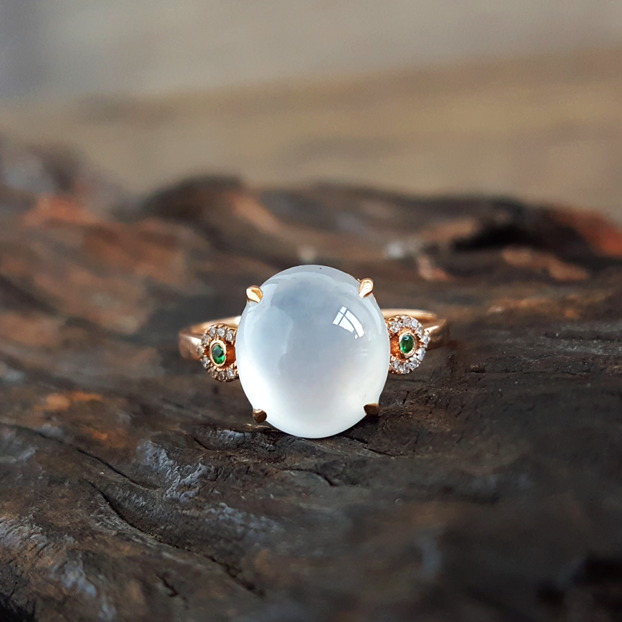 名称 | AU750玫瑰金镶钻镶天然细腻白色起荧冰种蛋面翡翠戒指 |