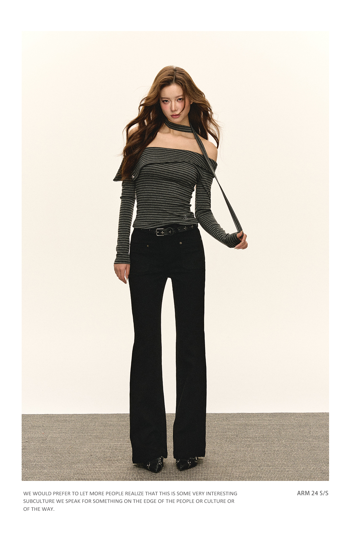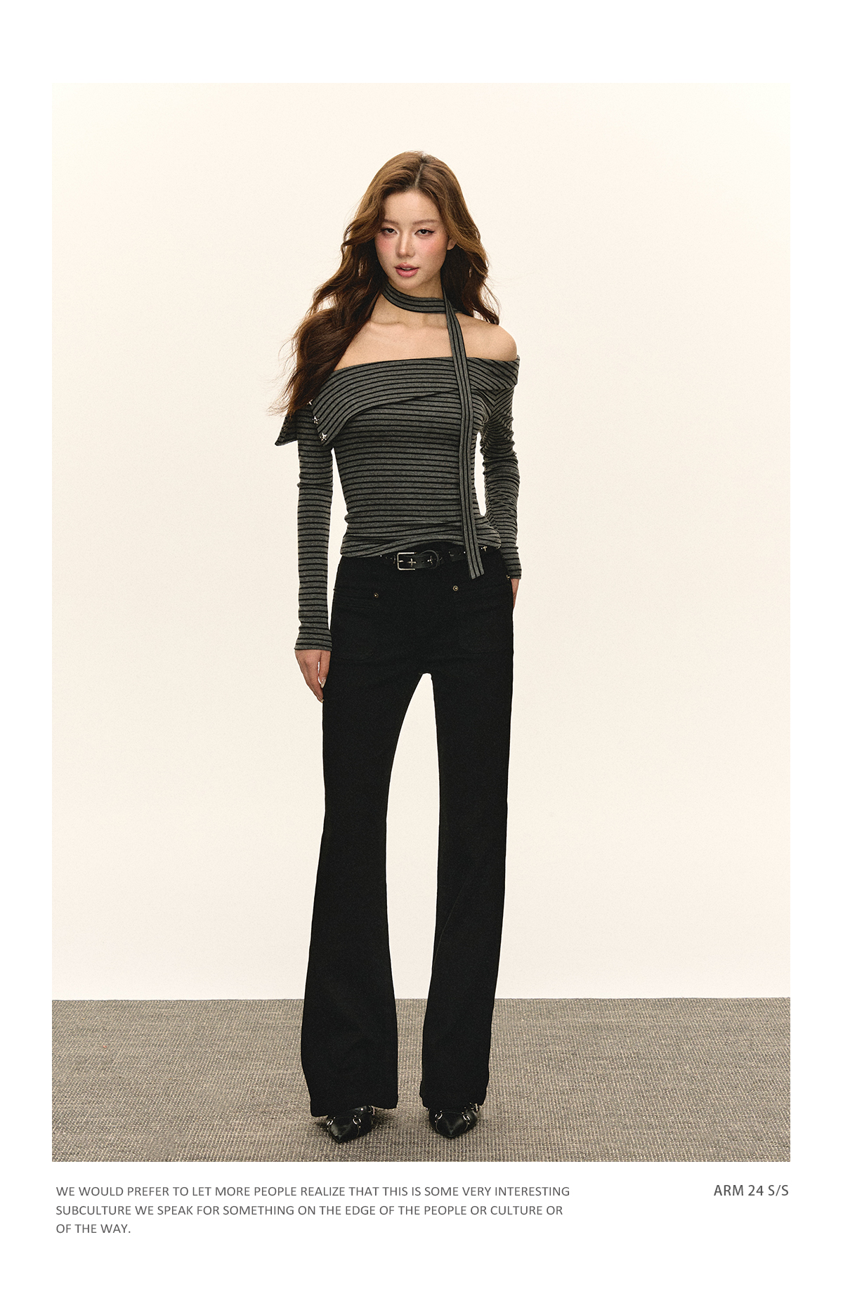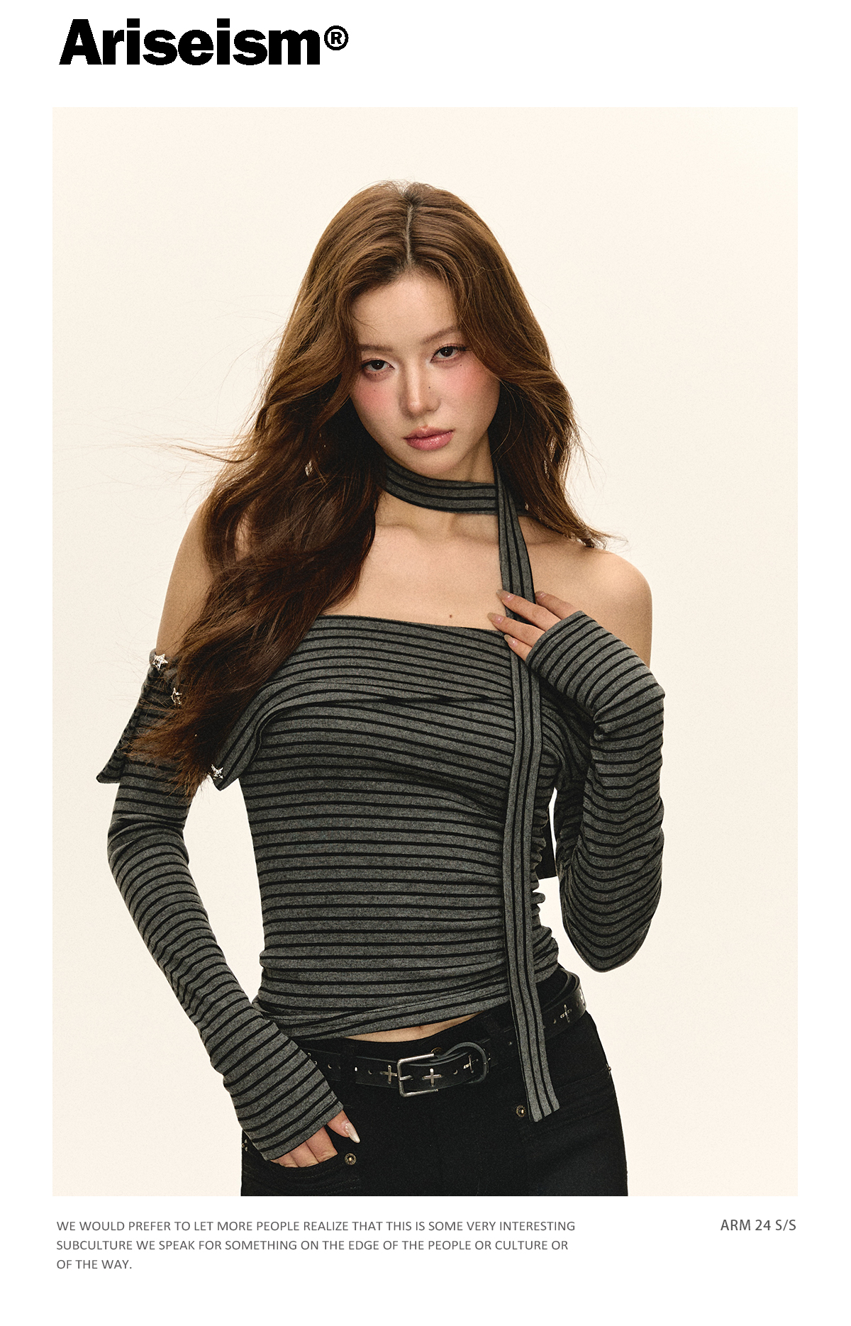 Ariseism 美式辣妹设计感一字肩长袖T恤女春季新款内搭修身上衣