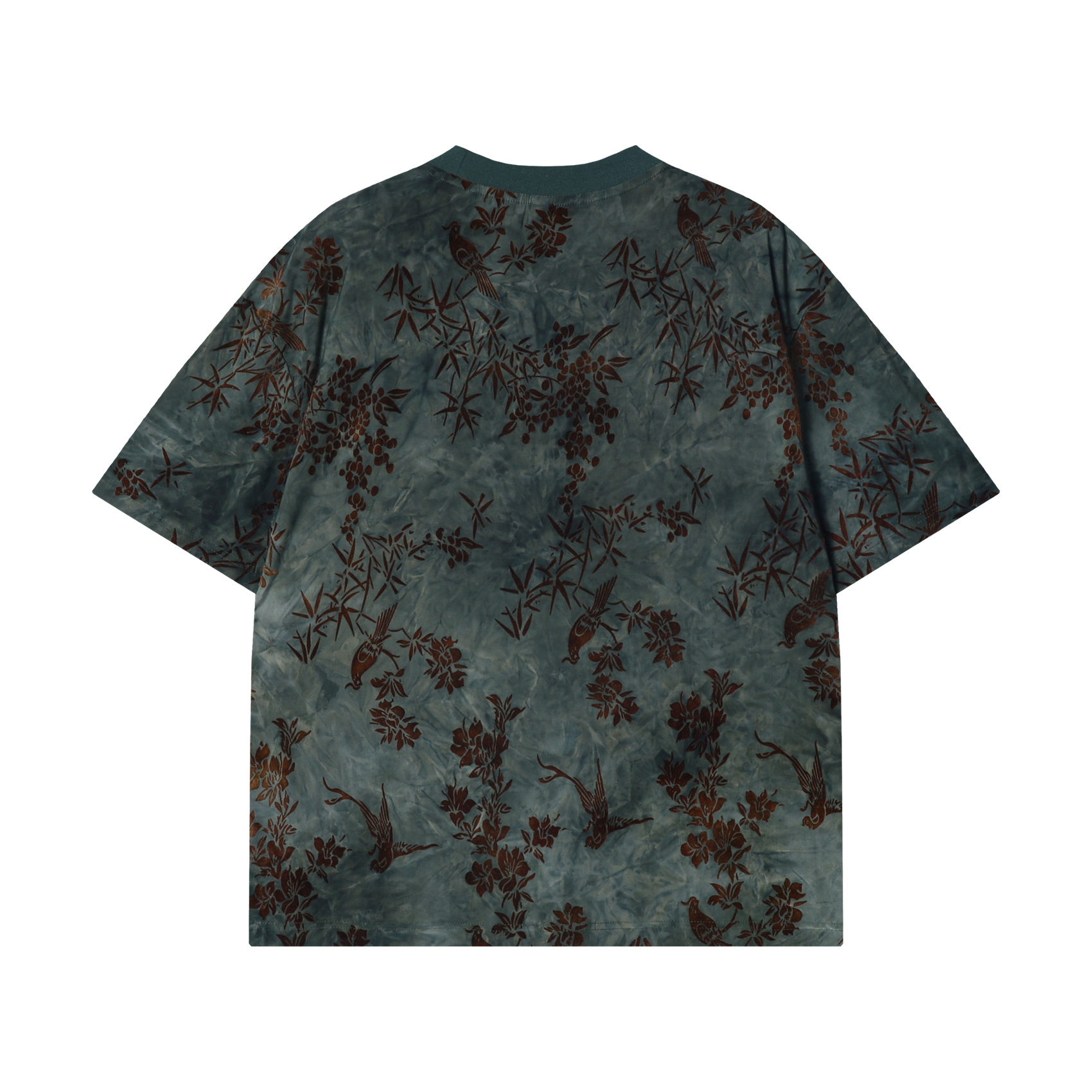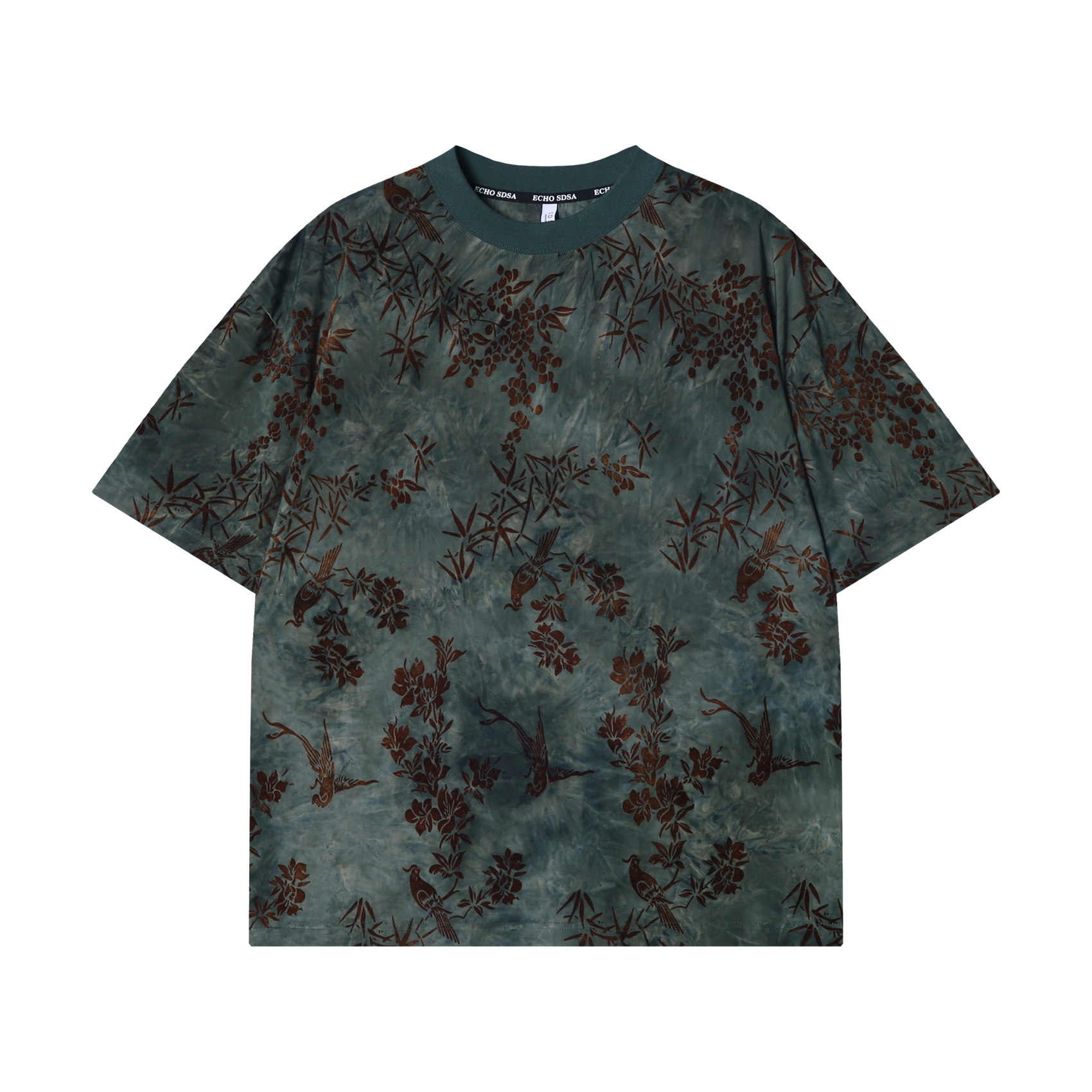 T2664夏季新款时尚个性花鸟树木印花扎染国潮新中式百搭休闲短袖上衣