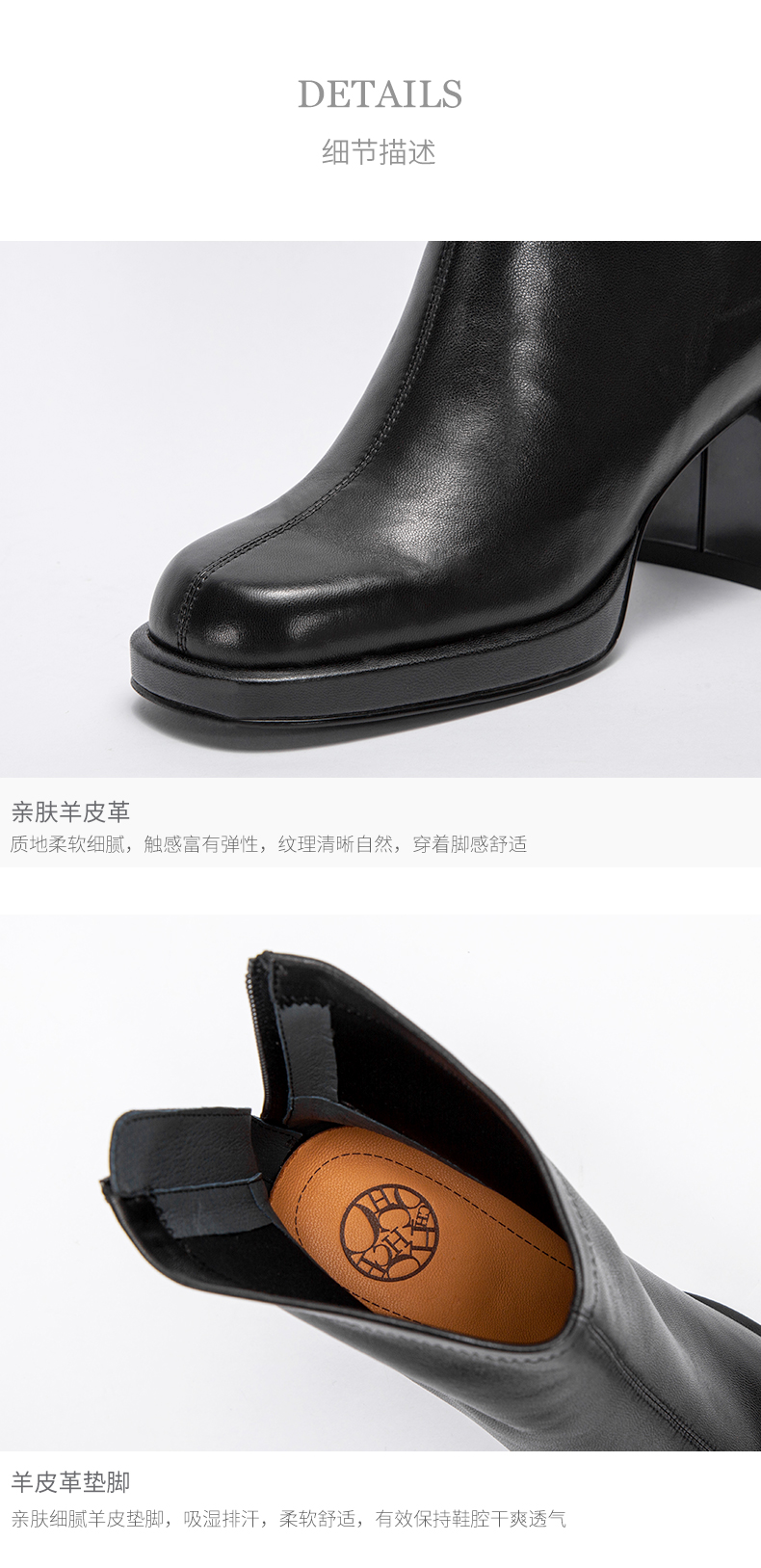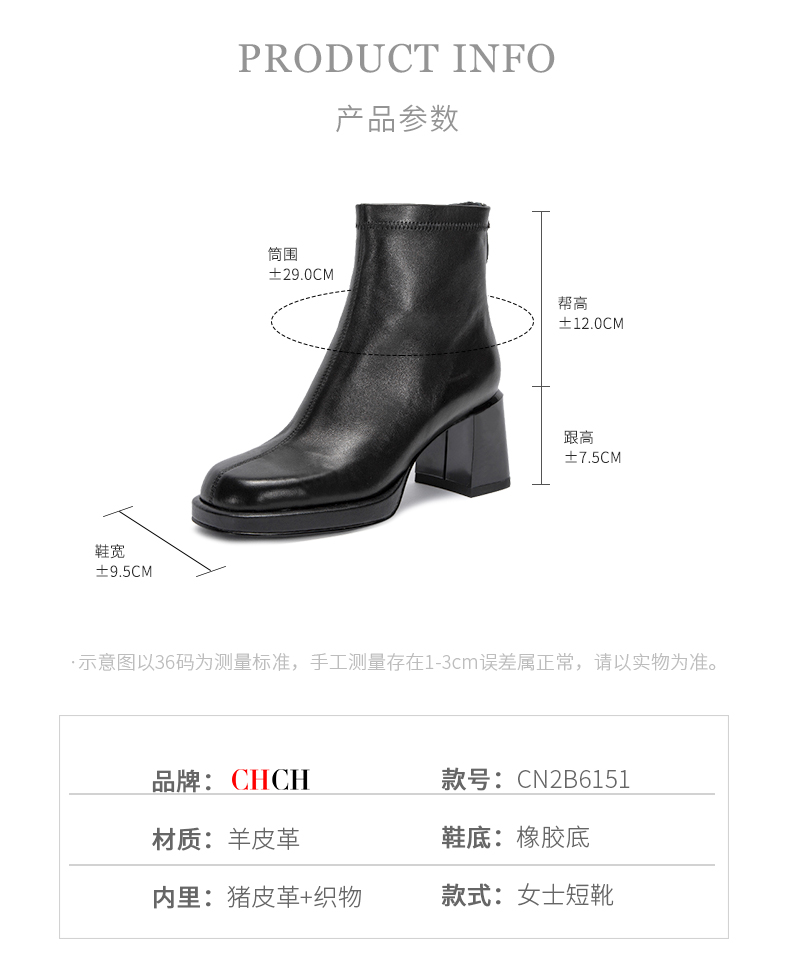 CHCH平衡鞋短靴2024秋冬新品羊皮拉链粗跟时尚女靴CN2B6151