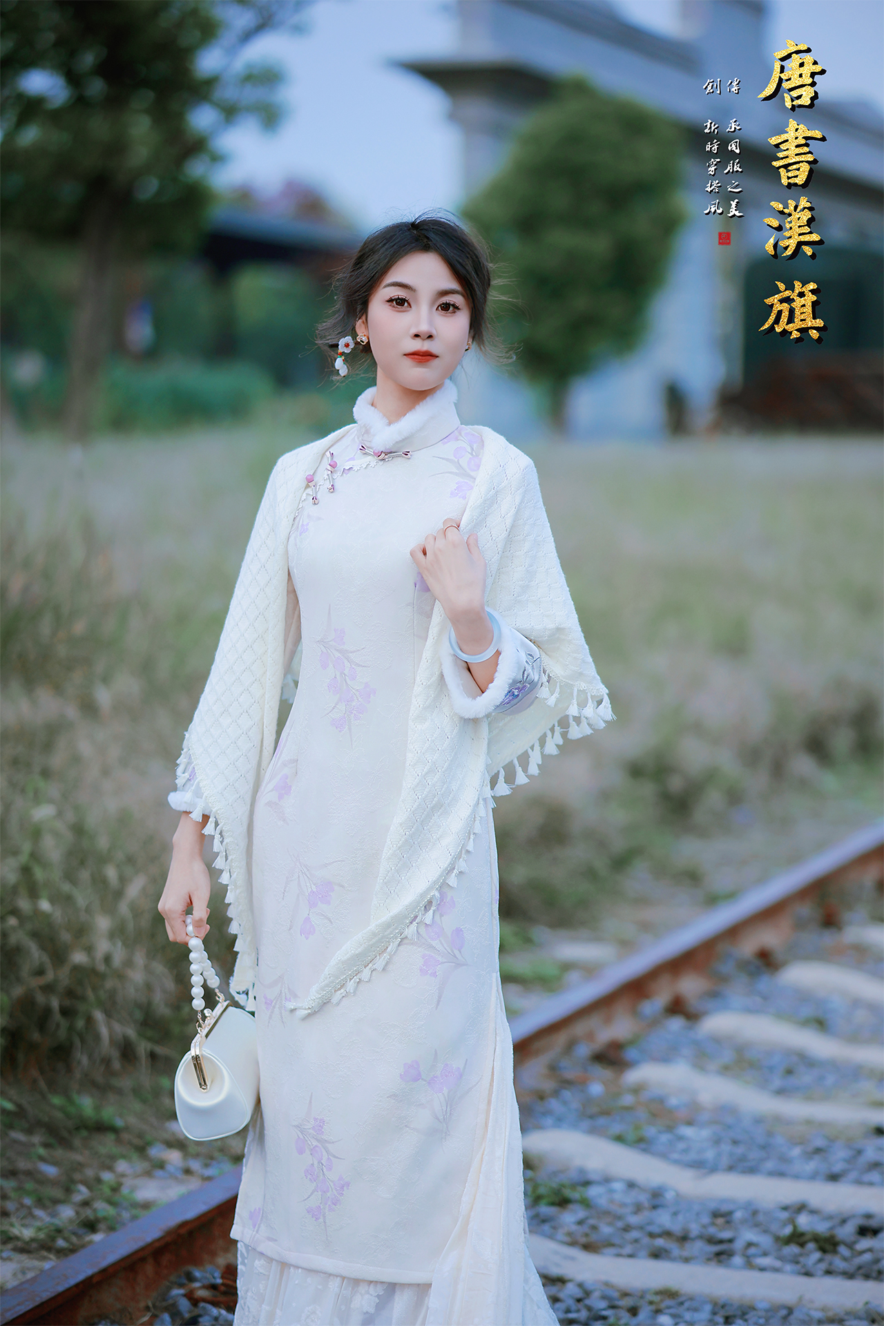 【云素兰绒】奶白底色+淡紫花枝刺绣,斜襟珍珠扣细节精致;修身长款版型,衬出优雅曲线自带温婉仙气,国风韵味拉满,加绒面料,暖糯亲肤,秋冬穿不冷还显贵气
