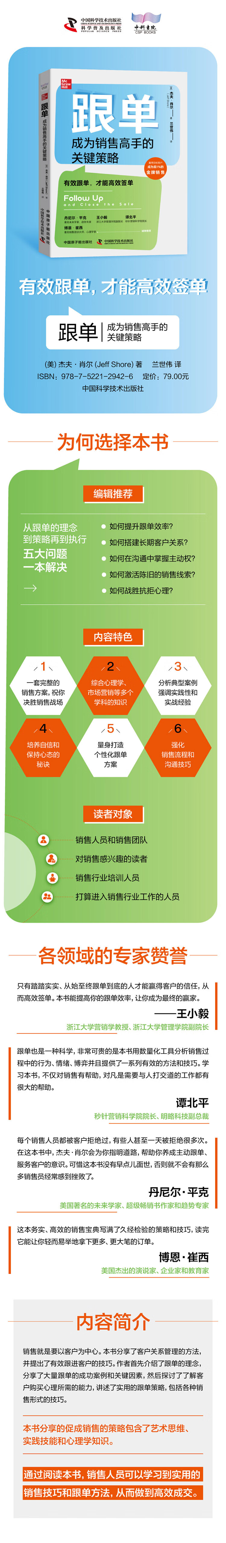 有效跟单,才能高效签单。本书介绍了大量备受著名未来学家丹尼尔平克、著名销售培训大师博恩·崔西等专家推崇的销售方法,浙江大学管理学院教授王小毅等国内专家倾情力荐。