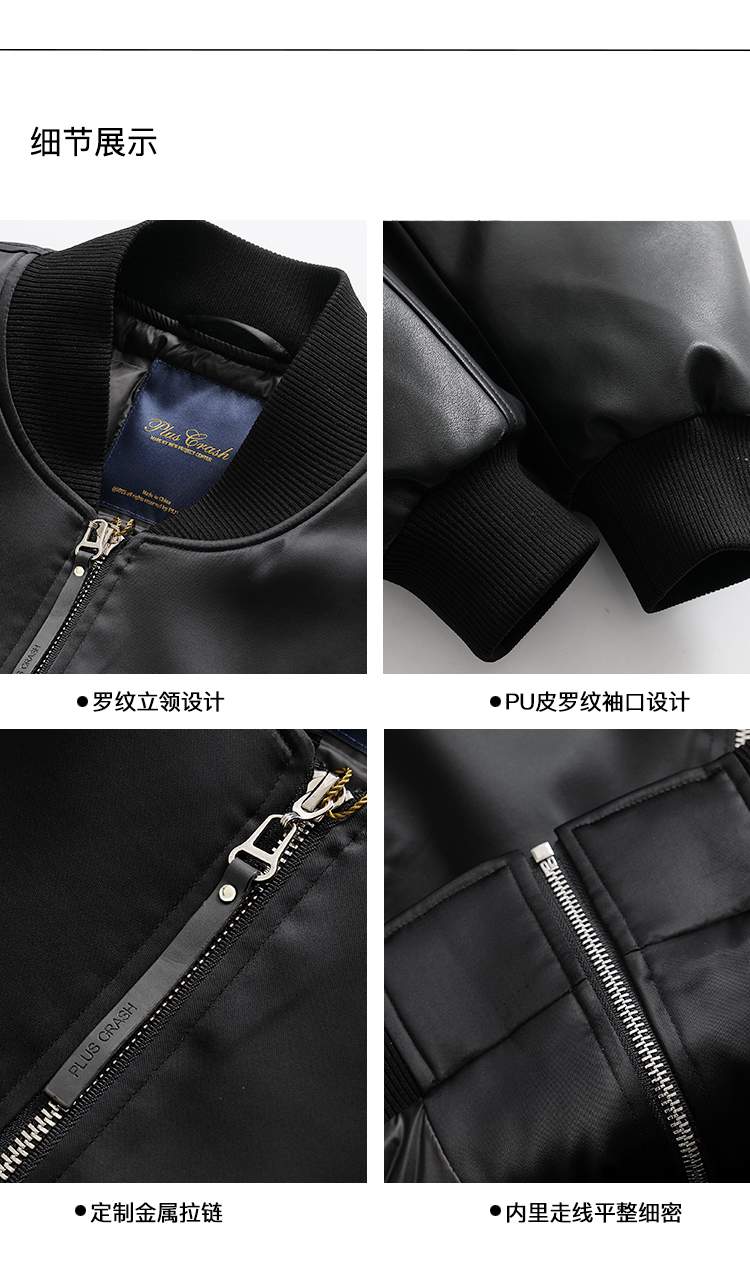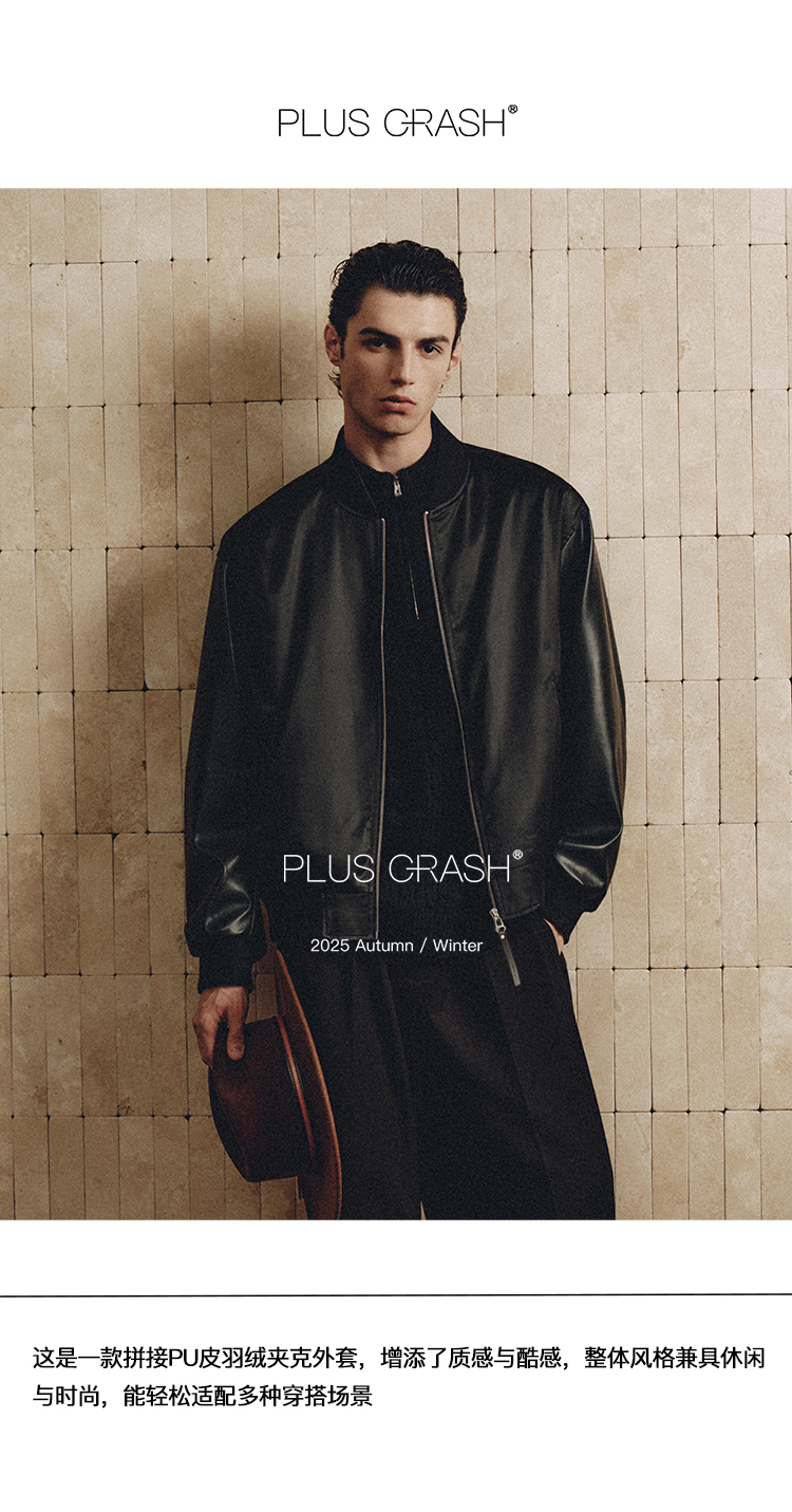 PLUS CRASH2025冬季老钱风拼接Pu飞行服棒球羽绒服保暖夹克外套