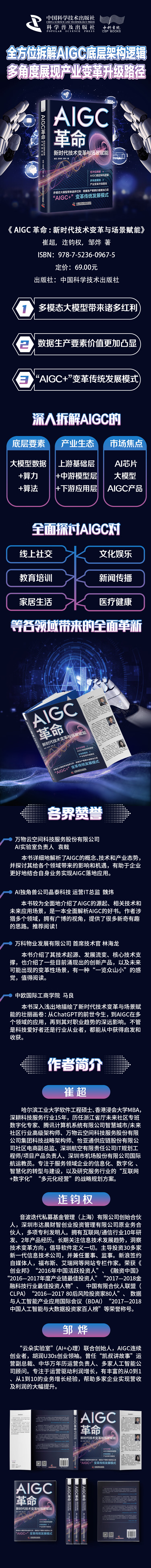 2.AIGC的发展带来新的商业机会。当前,已经有许多企业开始关注AIGC方向,并深化AIGC探索。本书针对企业的这种需求,详解了AIGC对多领域的变革,拆解了其中的发展机会,为企业的AIGC探索提供指导。