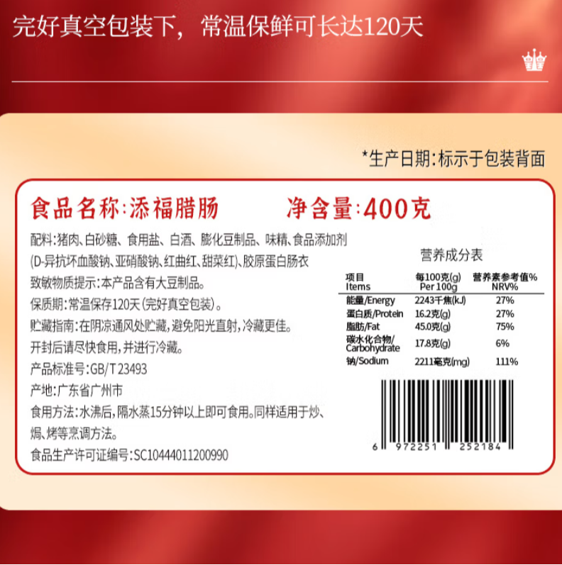 皇上皇 添福腊肠400g/袋