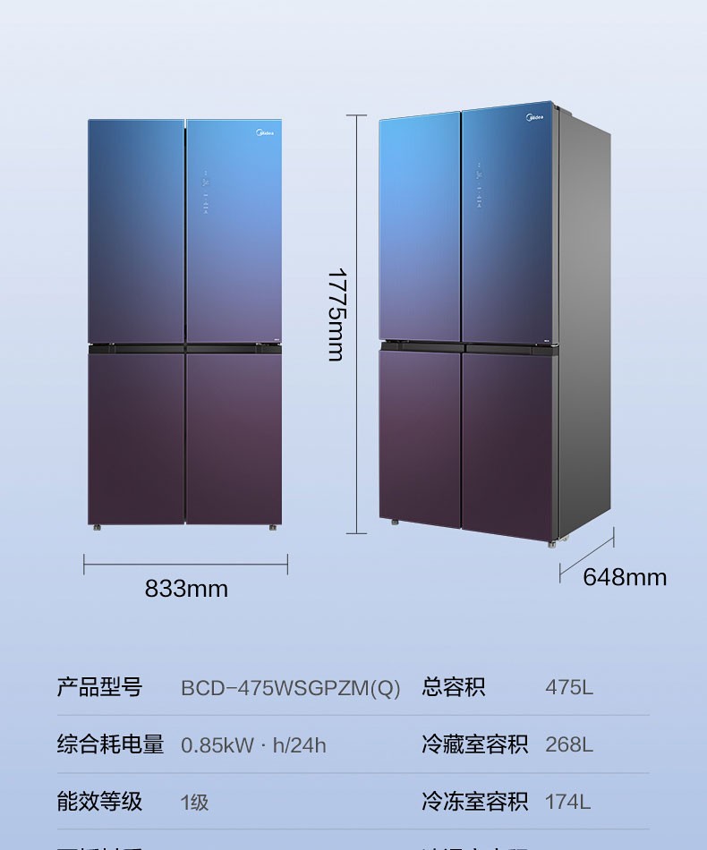 Midea/美的 BCD-475WSGPZM(Q)家用十字四门风冷无霜变频智能冰箱