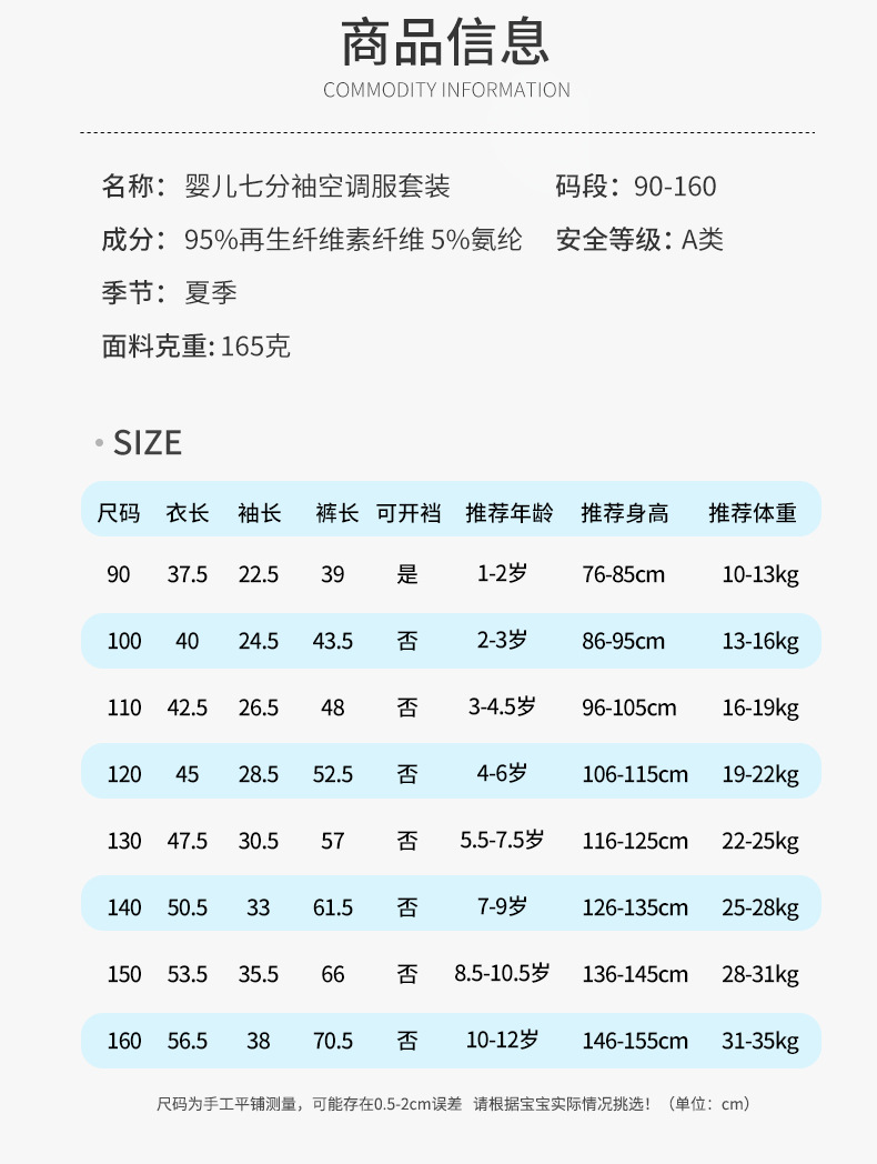 【优可丝7分袖空调服】儿童睡衣夏季a类内衣男女童家居服套装童装