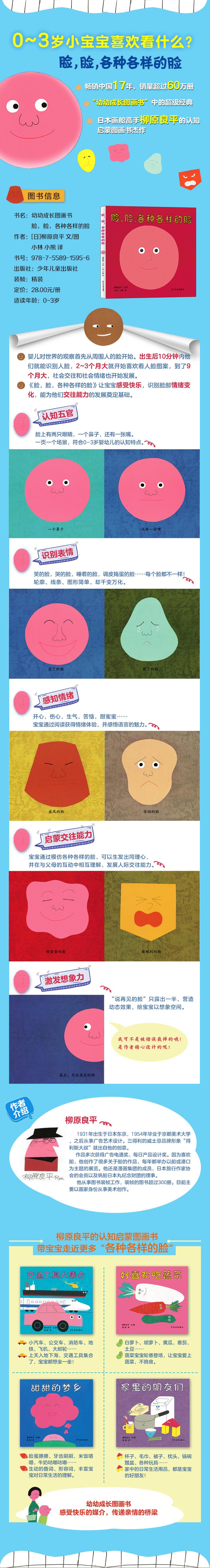 •《朝日新闻》年度畅销婴儿图画书•日本全国学校图书馆选定图书•入选《爱阅早期儿童阅读书目》《亲近母语分级阅读书目·幼儿版》日本画船高手柳原良平独具艺术风格表现的表情认知图画书,搭起感受快乐、传递亲情的桥梁。重点发展宝宝的视觉空间智能、自我认知智能、人际社会智能。剪贴画的美术风格和可爱的造型具有极强的可辨识性。画面中央的物体形象,总是大大的、色彩鲜艳、还具有灵动的表情。书中的文字,则是简单得不能再简单,宛如旁白,细声细气地告诉宝宝这是什么,那是什么。