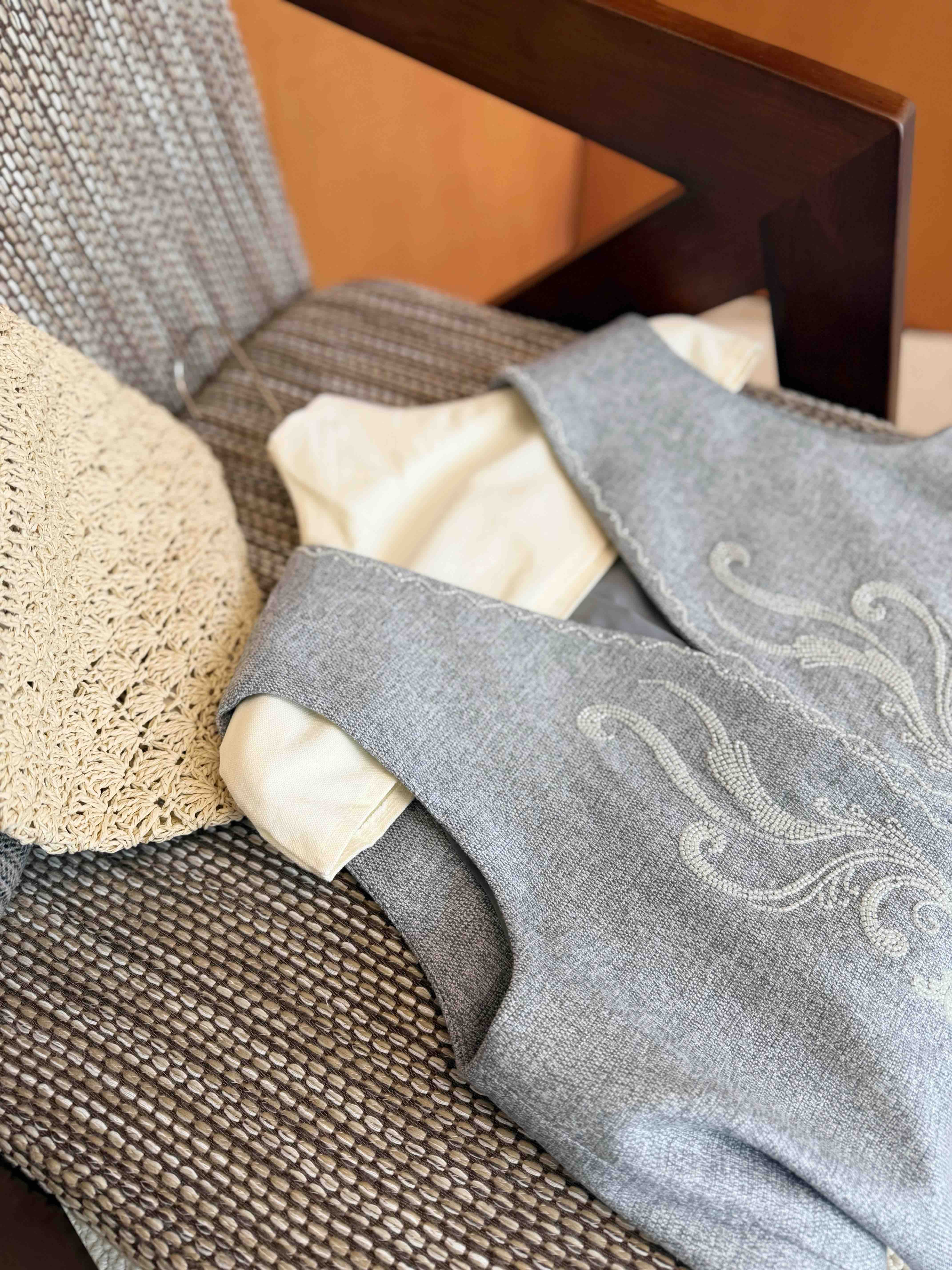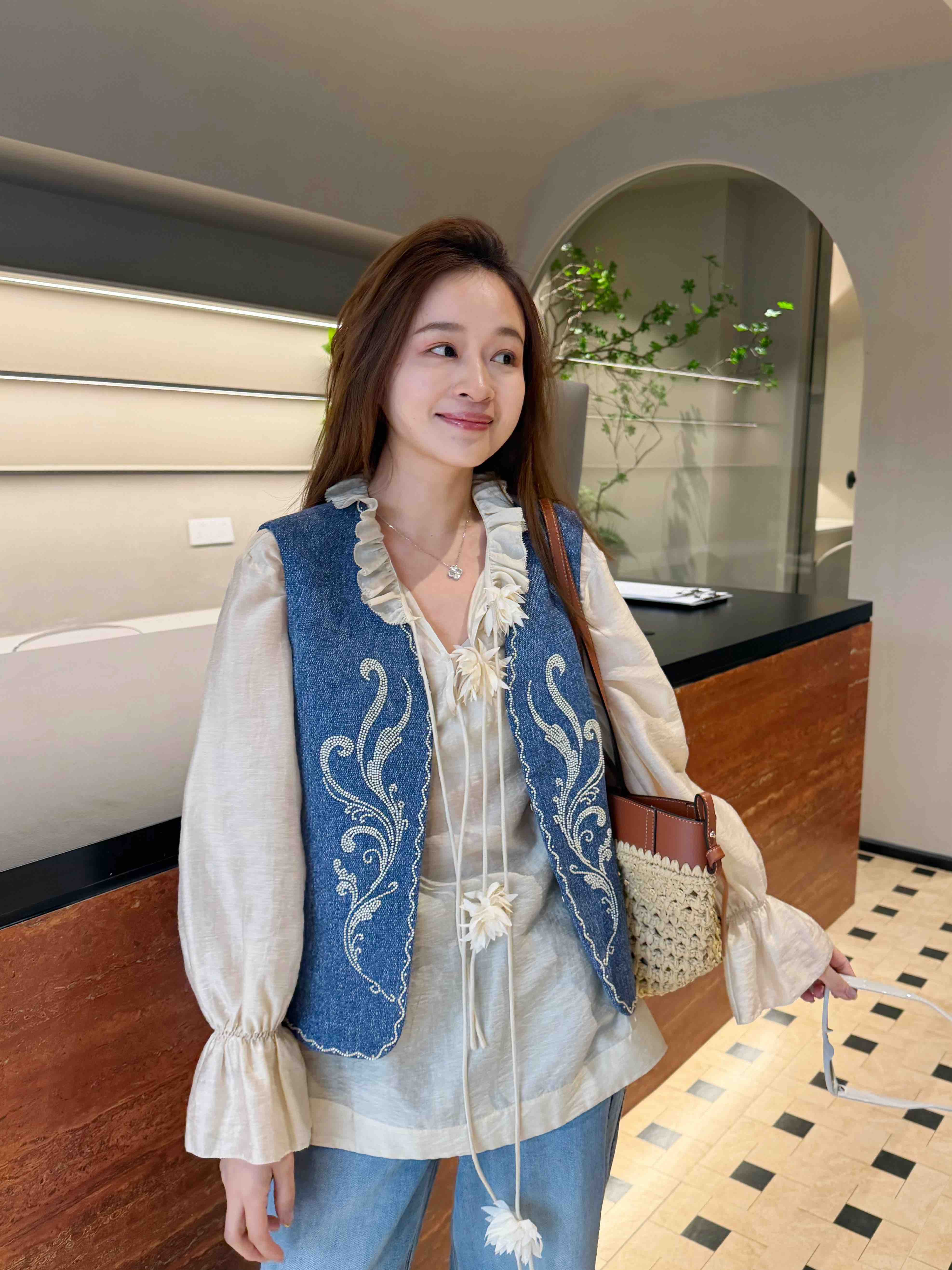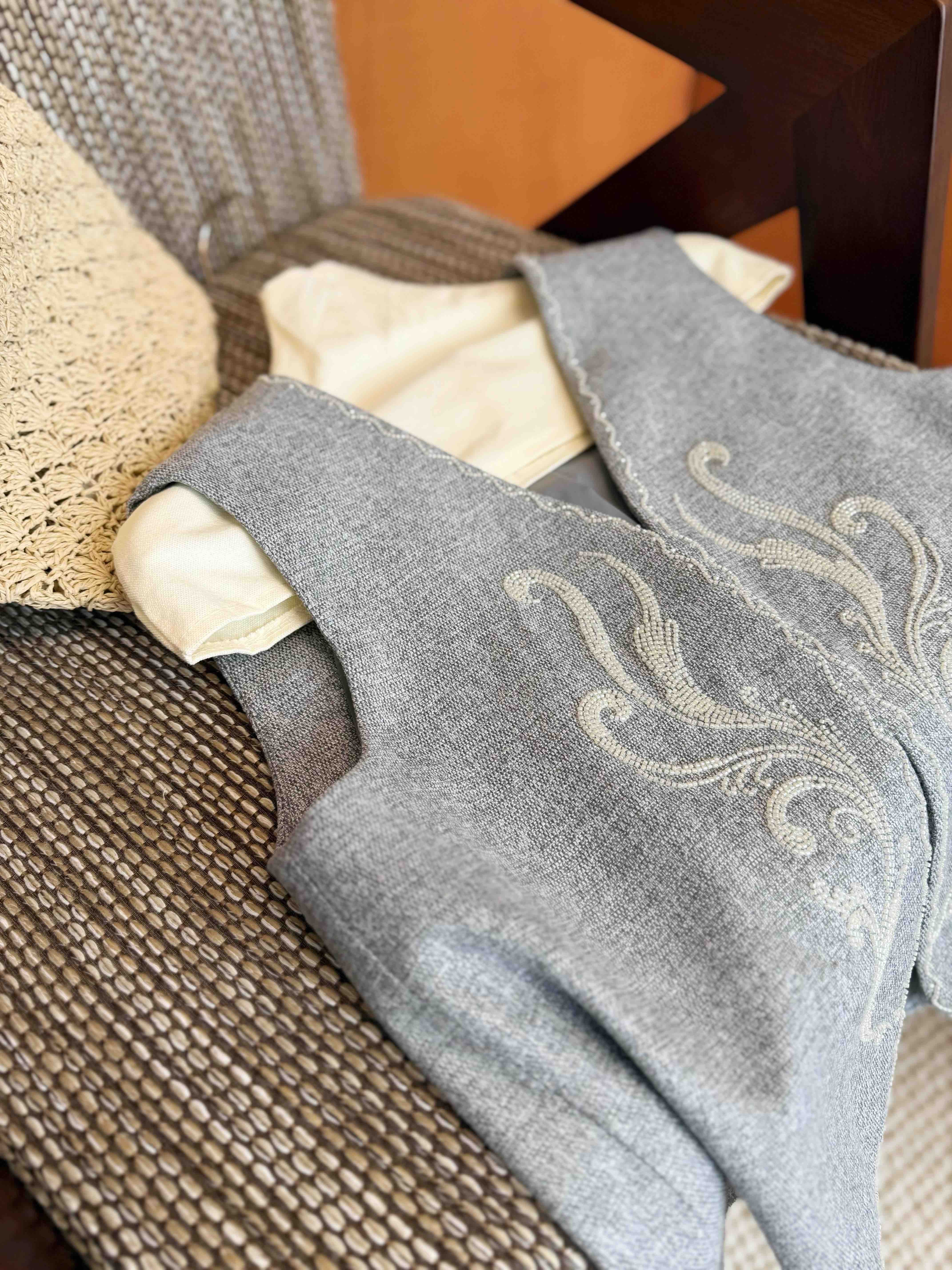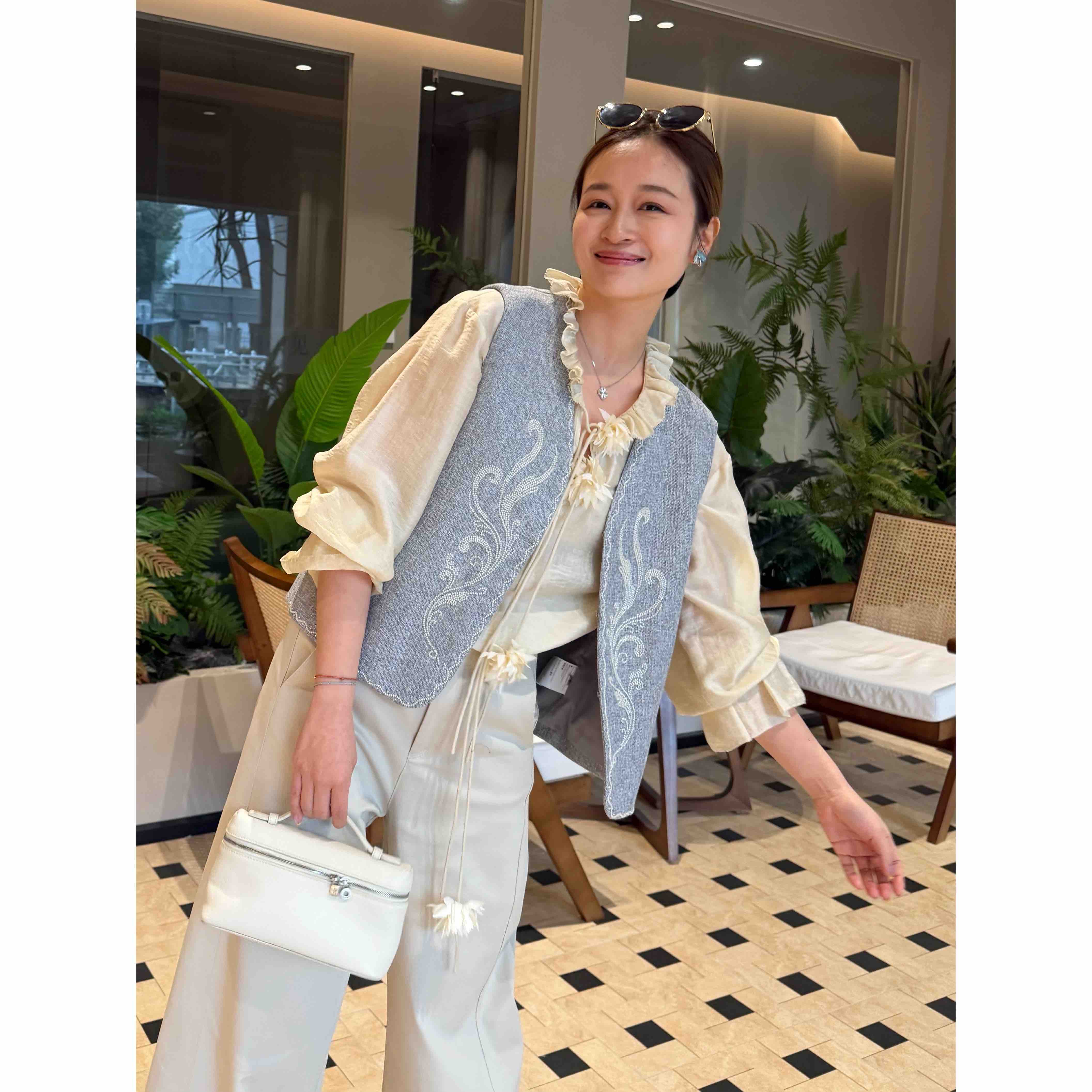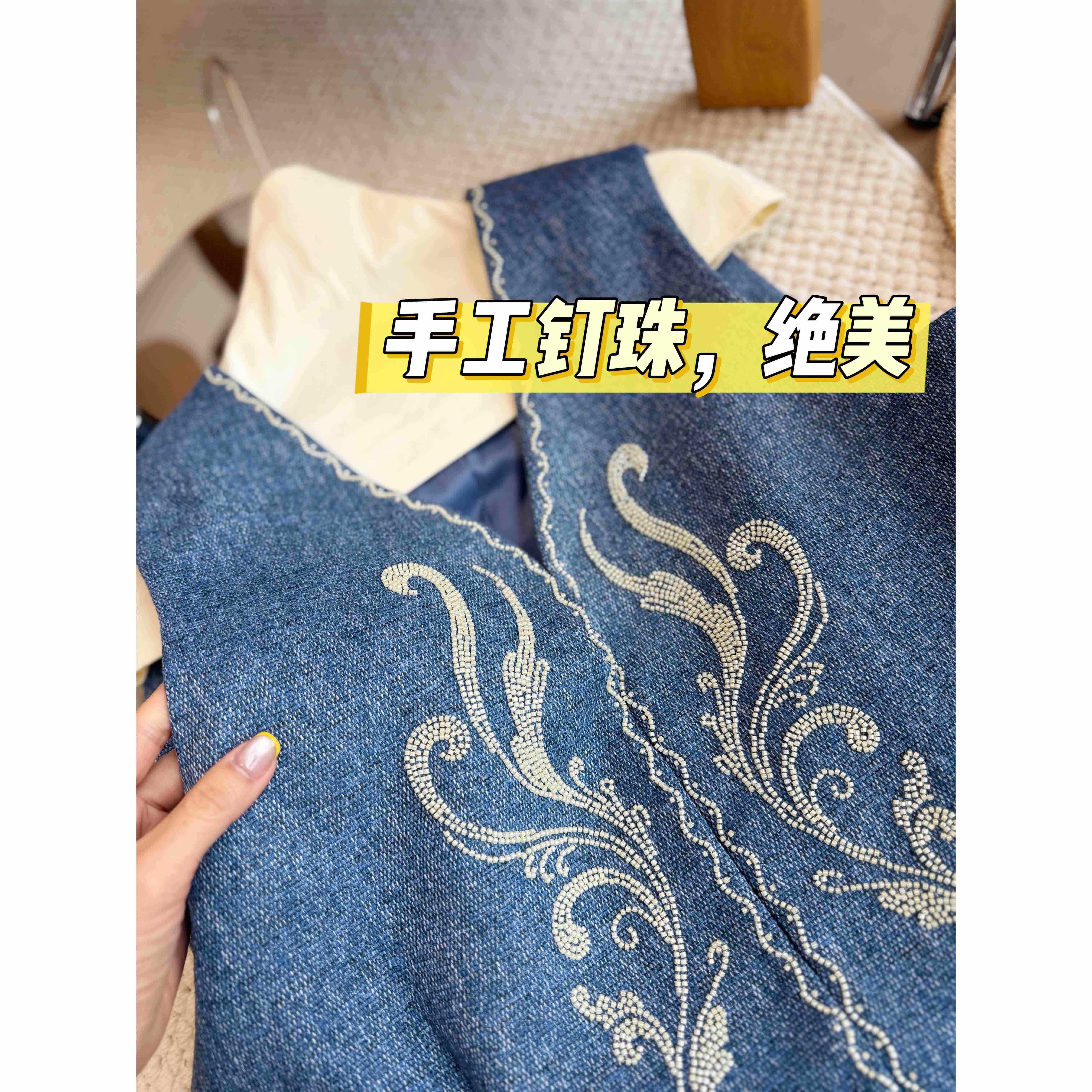 手工订珠部分,每一颗都是手工定的。一件衣服耗时2、3 小时哦。