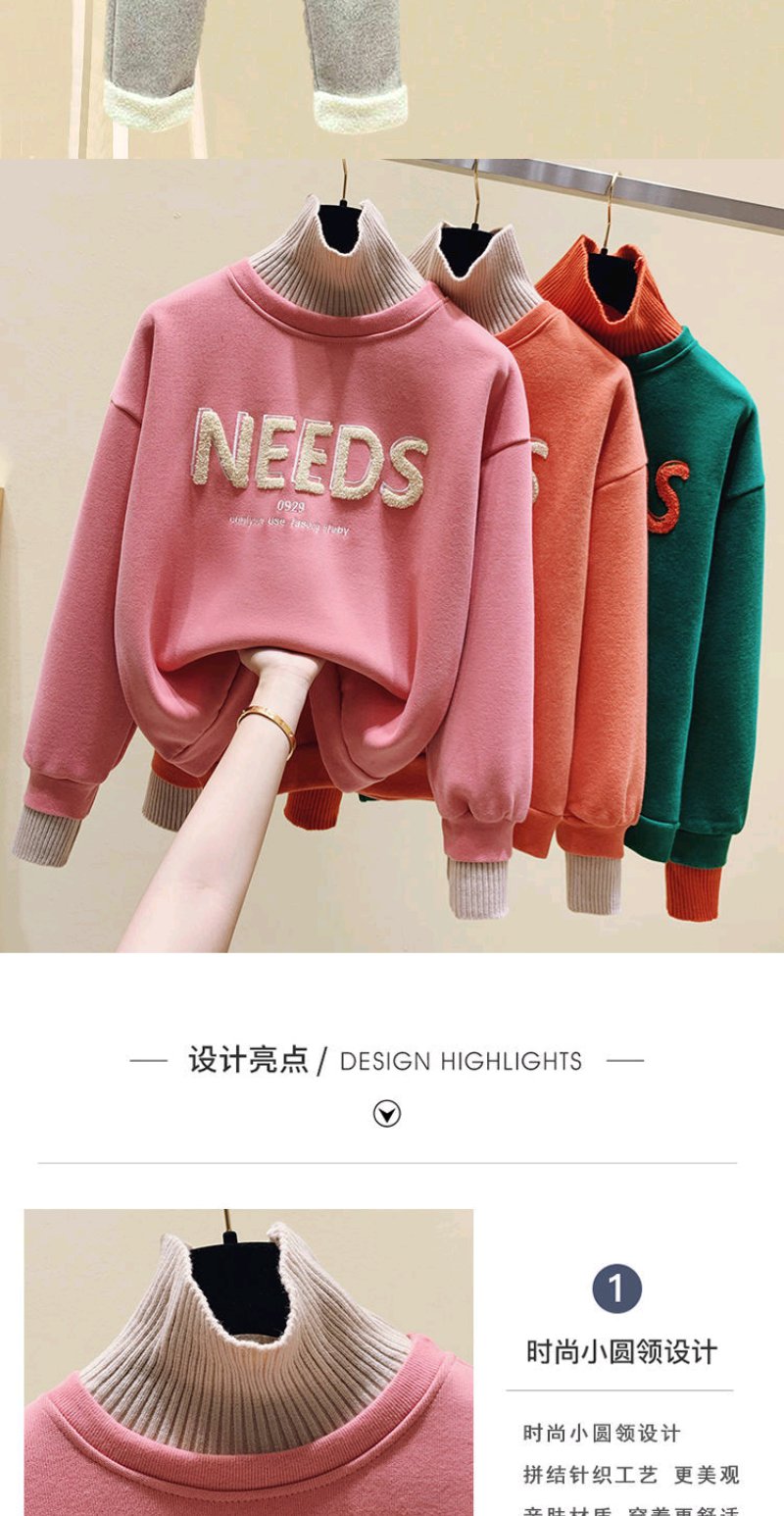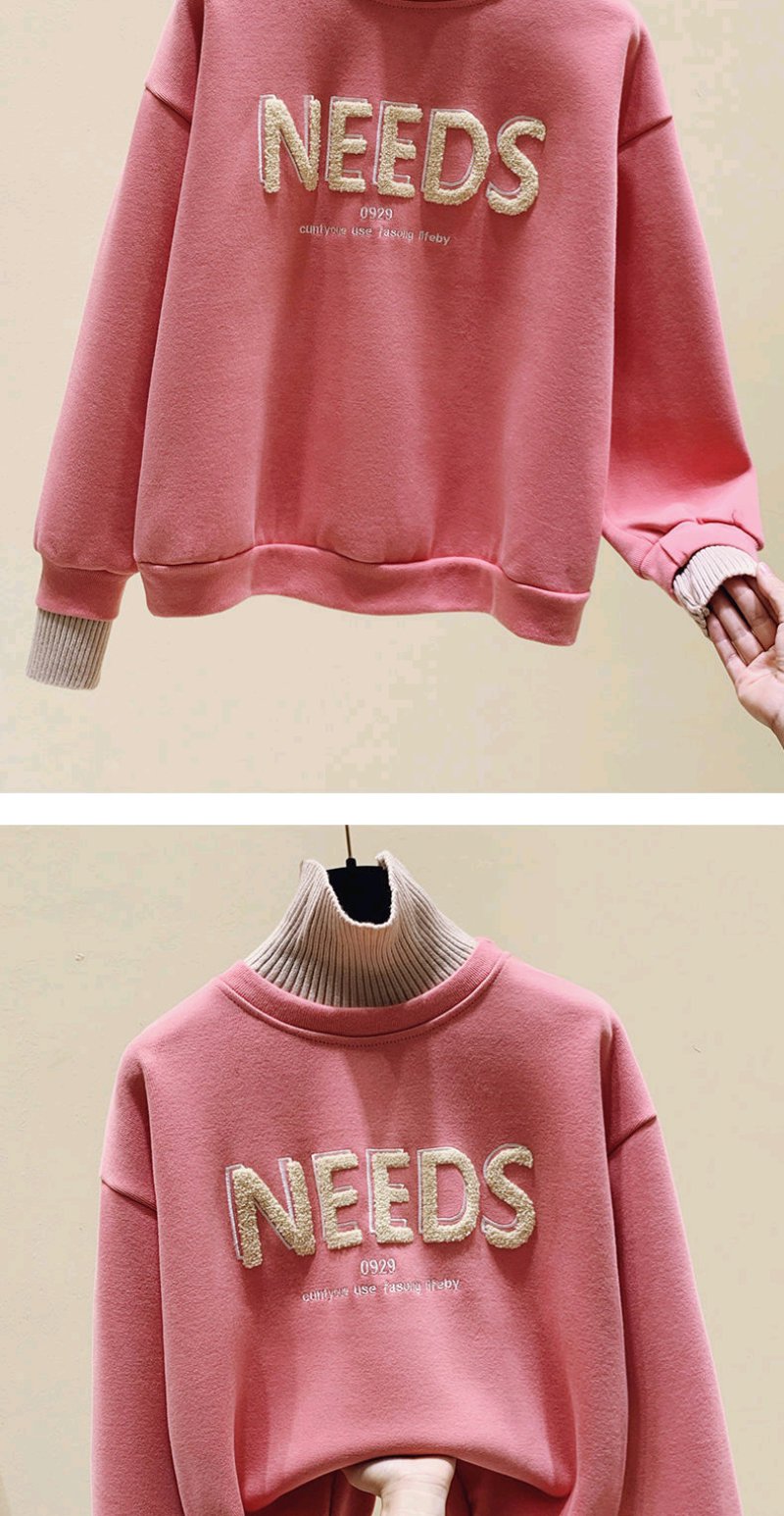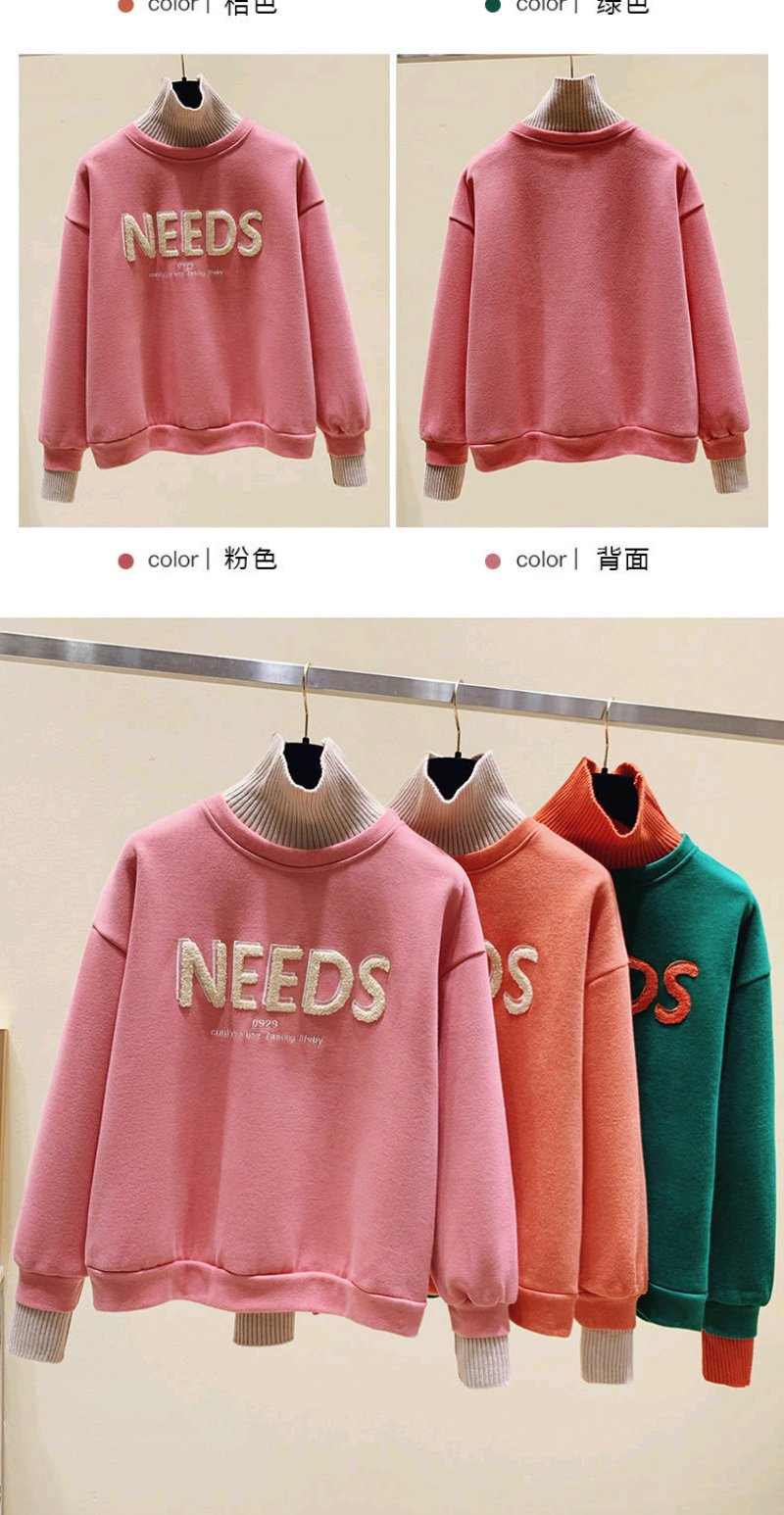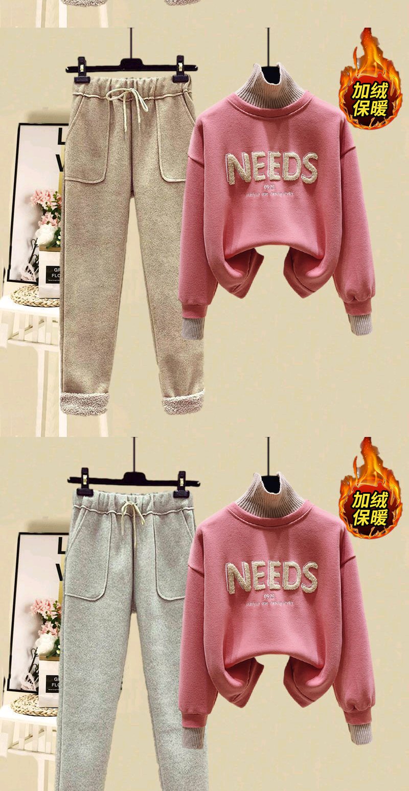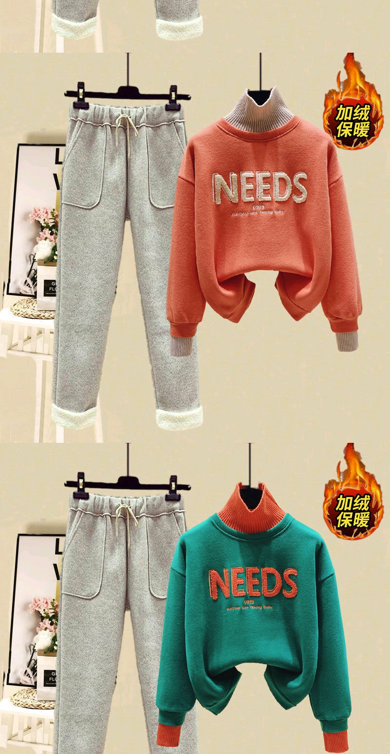 秋冬款加绒加厚高领重工毛巾绣假两件卫衣女+休闲直筒毛呢裤百搭