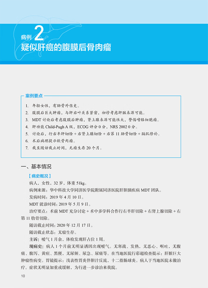【2】每个部分由概述和若干病例组成。每个病例分别从基本情况、本案例要点(收集原因)、疾病诊断、MDT讨论疑难点、讨论结论、实际执行方案及反馈七个方面进行详细描述。反馈涉及方案进行中各阶段(各学科方案)执行情况、患者预后情况总结及治疗过程图总结、需要反馈新病理结果或者随访情况。