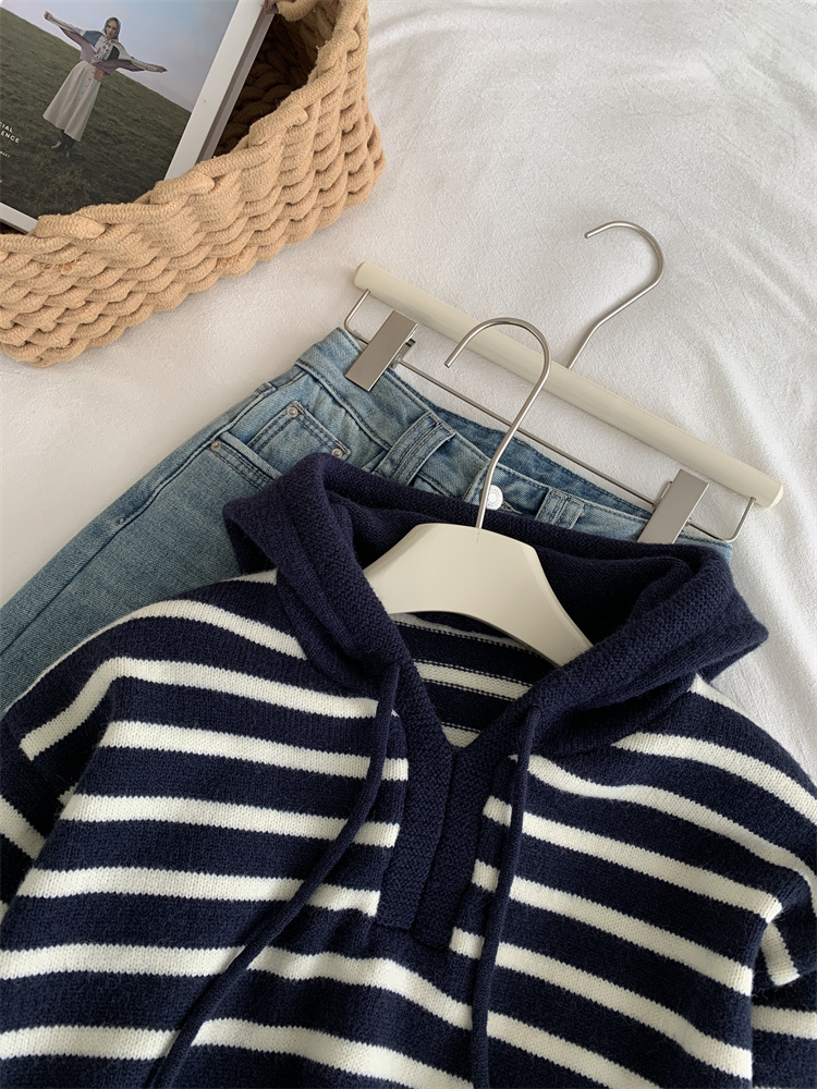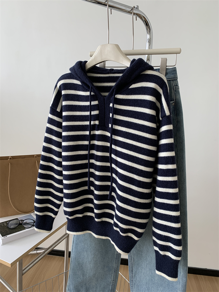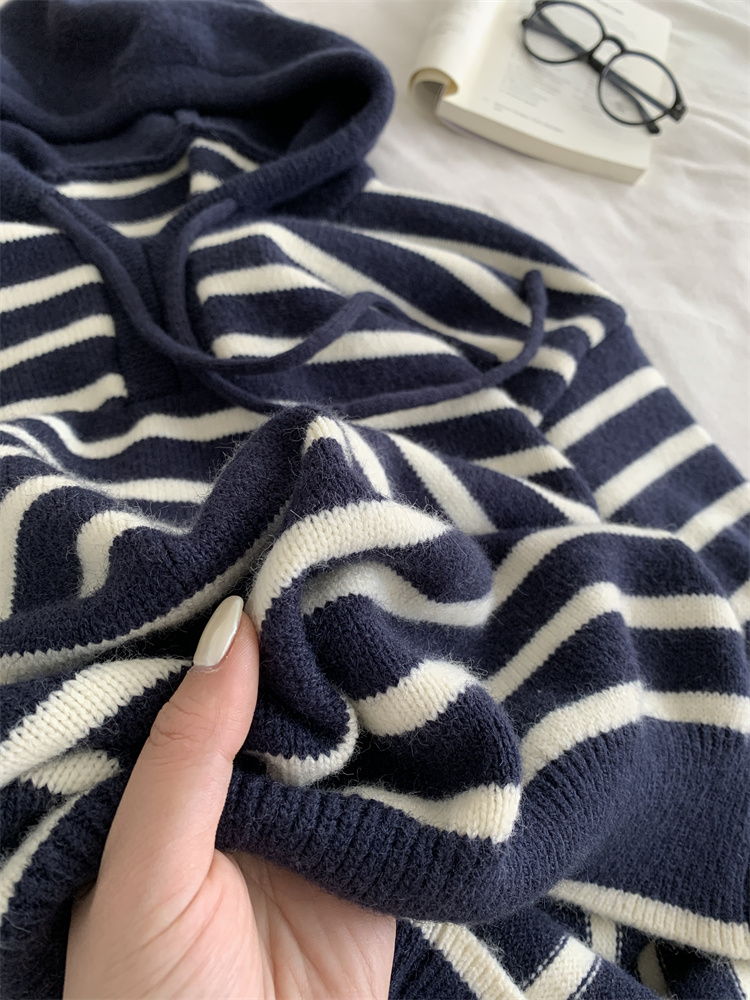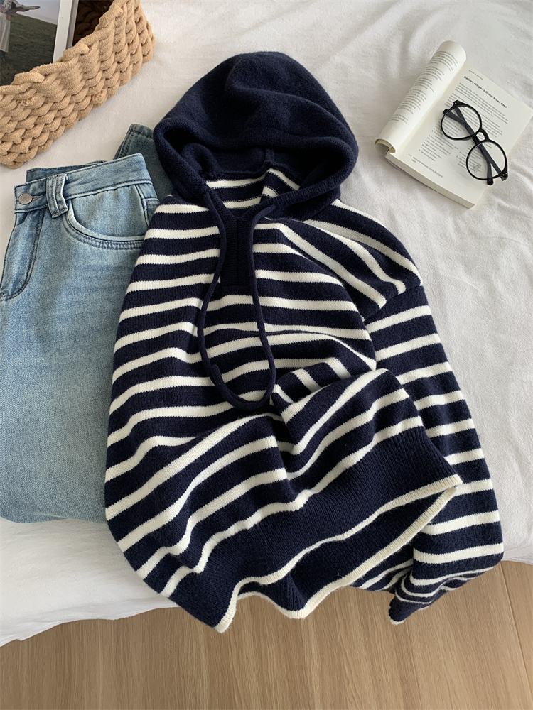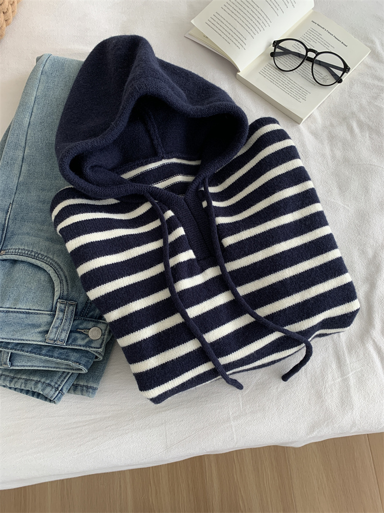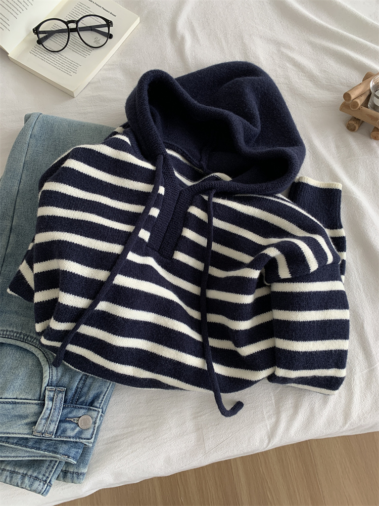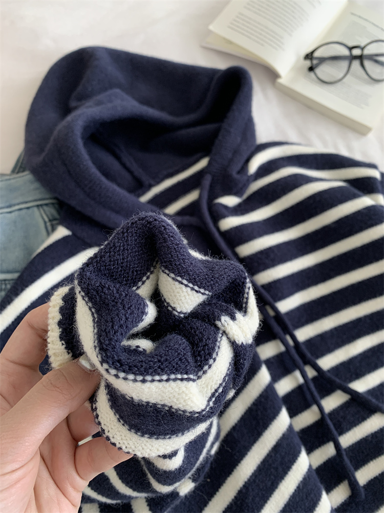 显白复古!2025藏青条纹连帽针织衫女简约韩版加厚秋冬叠穿保暖套头毛衣!