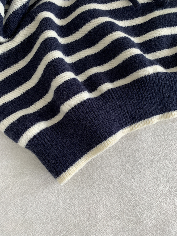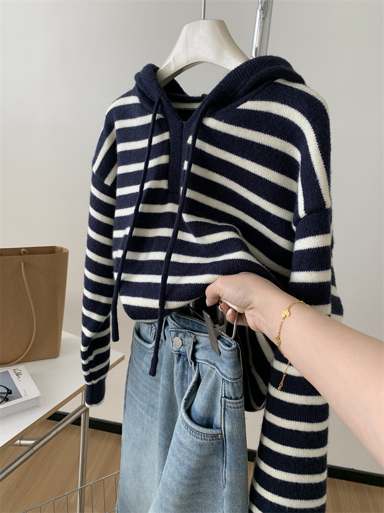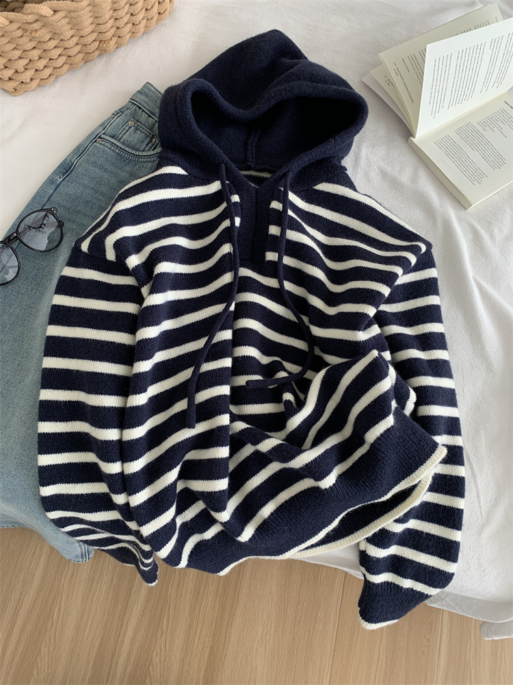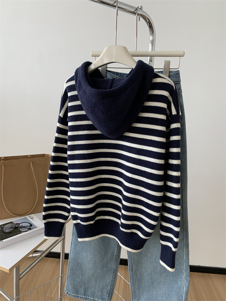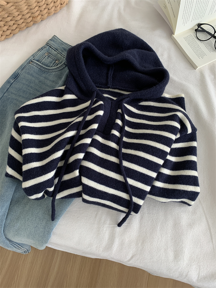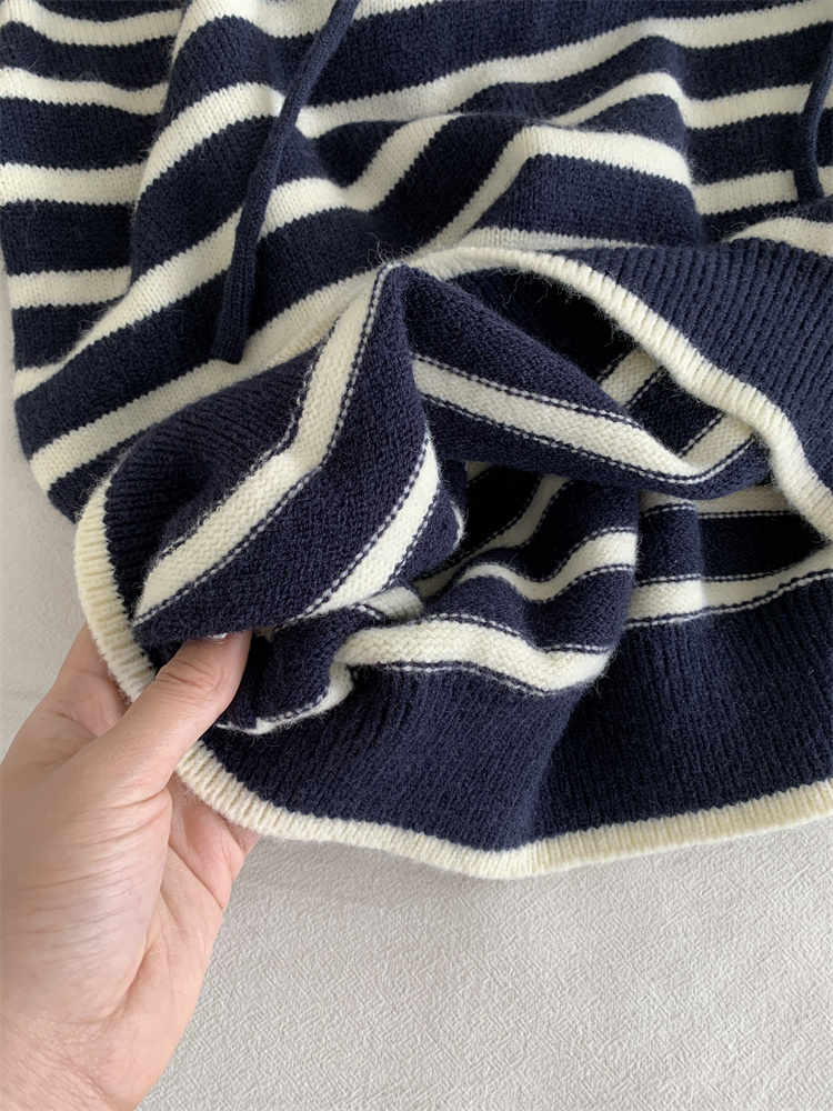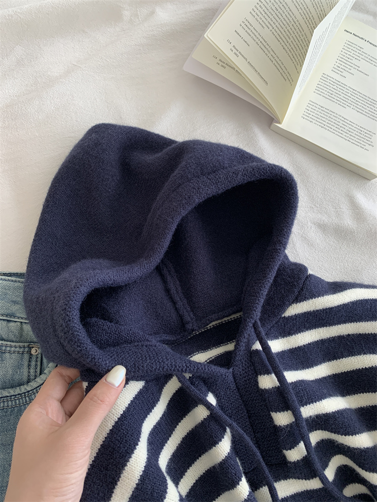 显白复古!2025藏青条纹连帽针织衫女简约韩版加厚秋冬叠穿保暖套头毛衣!