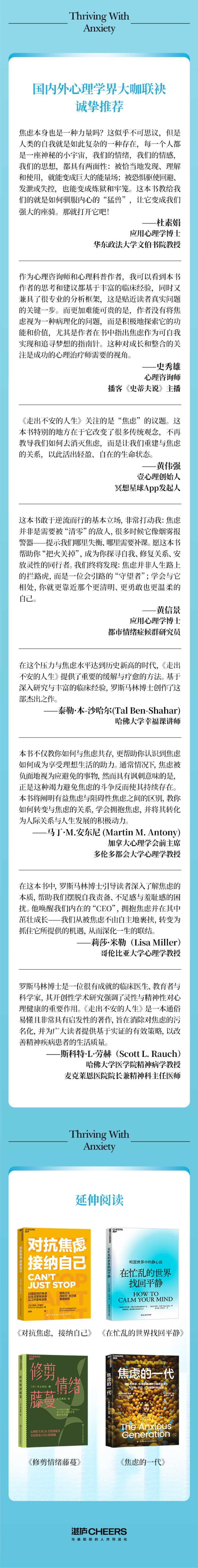 罗斯马林博士是一位成就的临床医生、教育者与科学家,其开创性学术研究强调了灵性与精神性对心理健康的重要作用。《走出不安的人生》是一本通俗易懂且非常具有启发性的著作,旨在消除对焦虑的污名化,并为广大读者提供基于实证的有效策略,以改善精神疾病患者的生活质量。