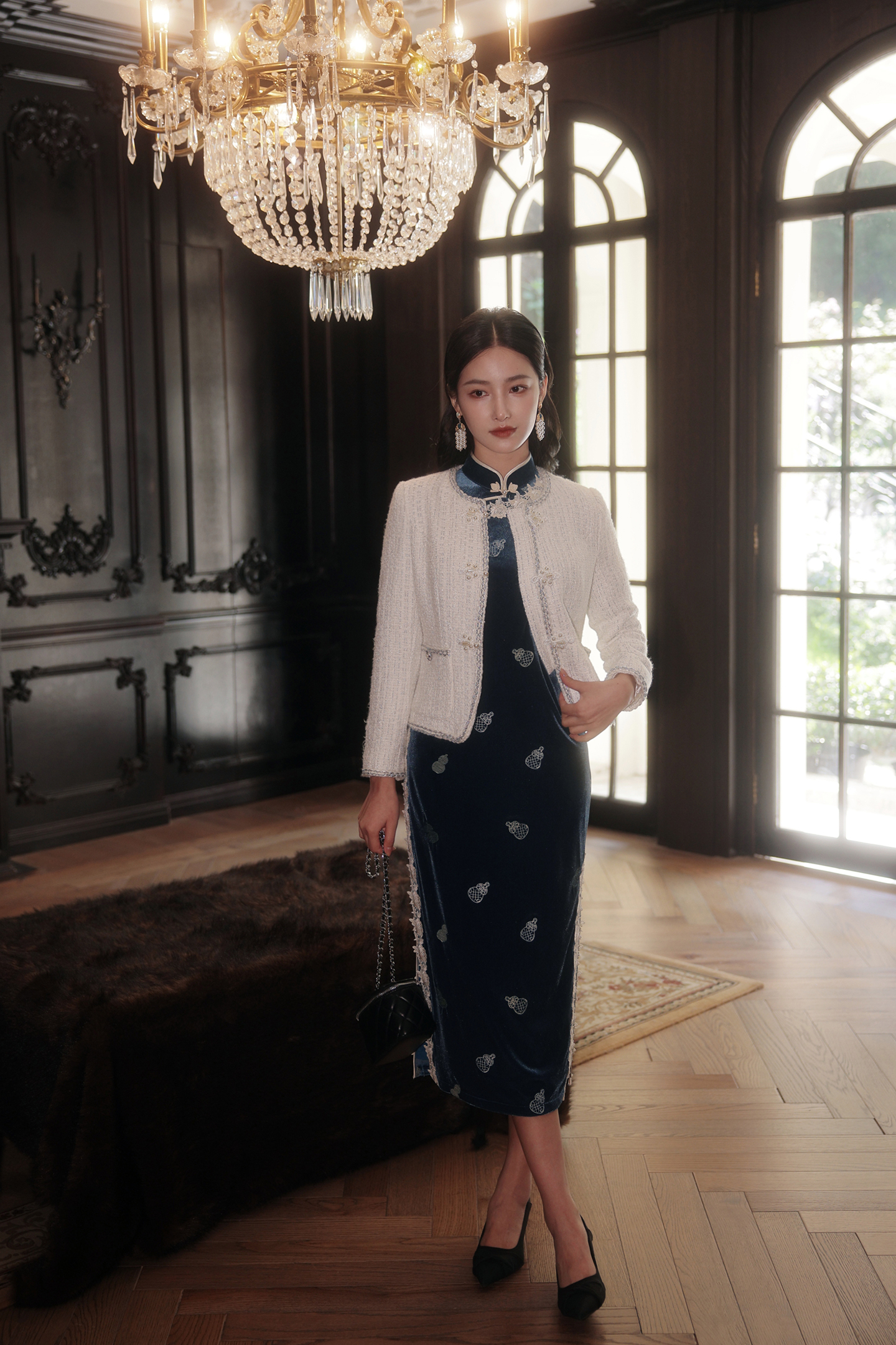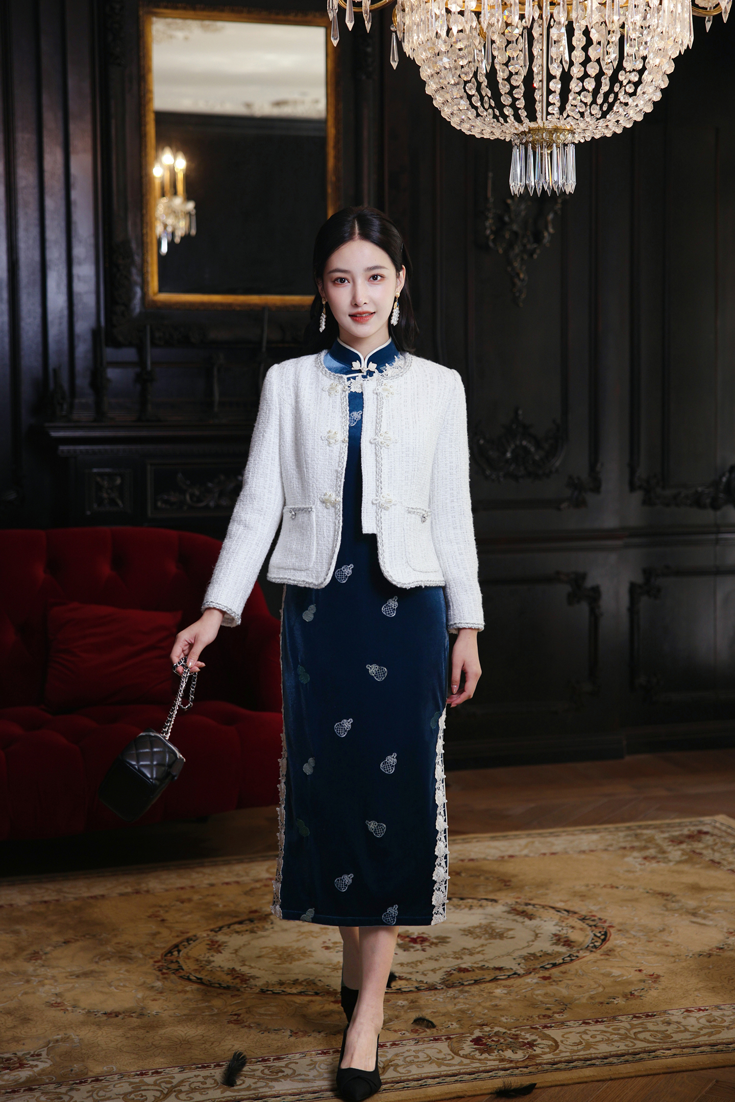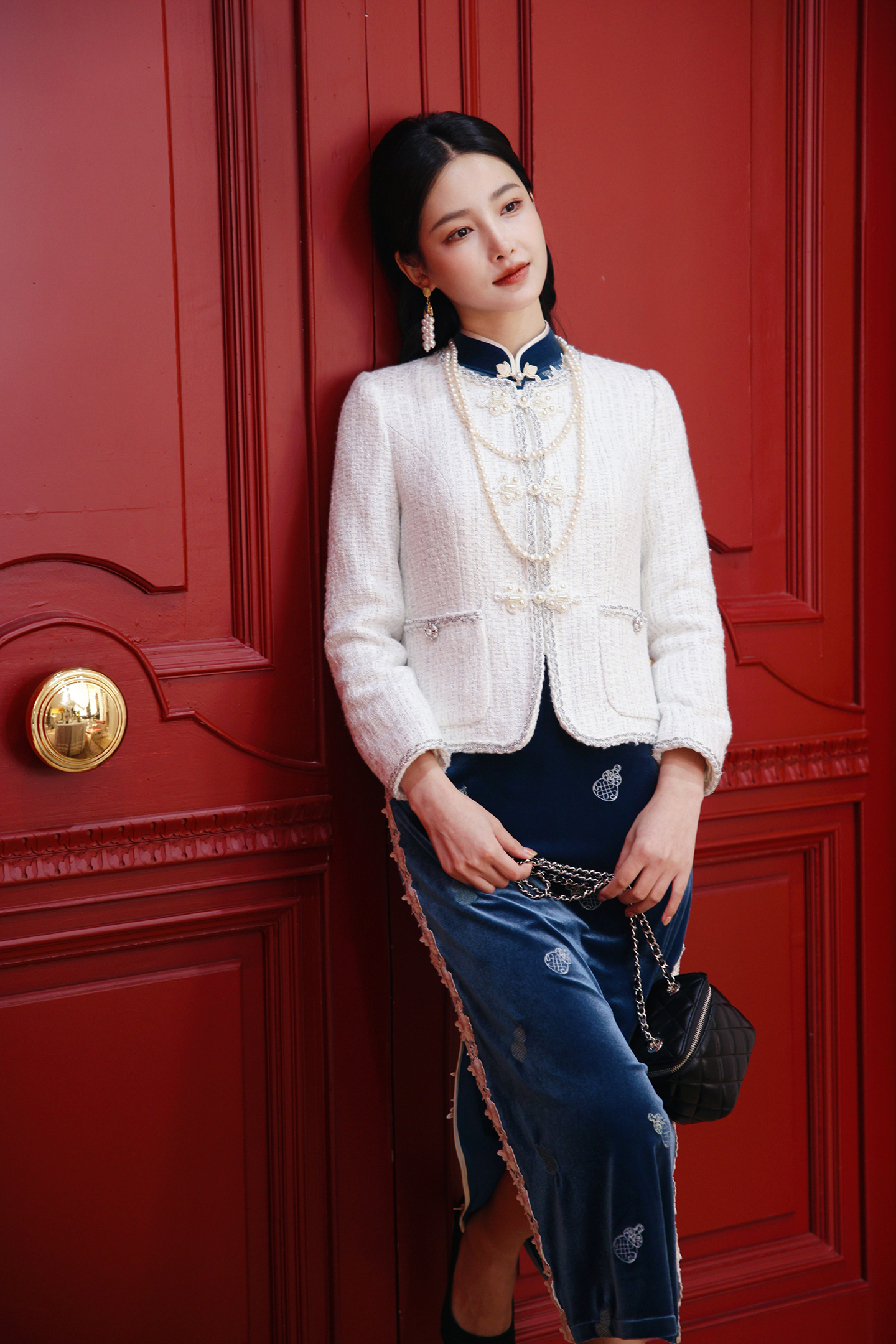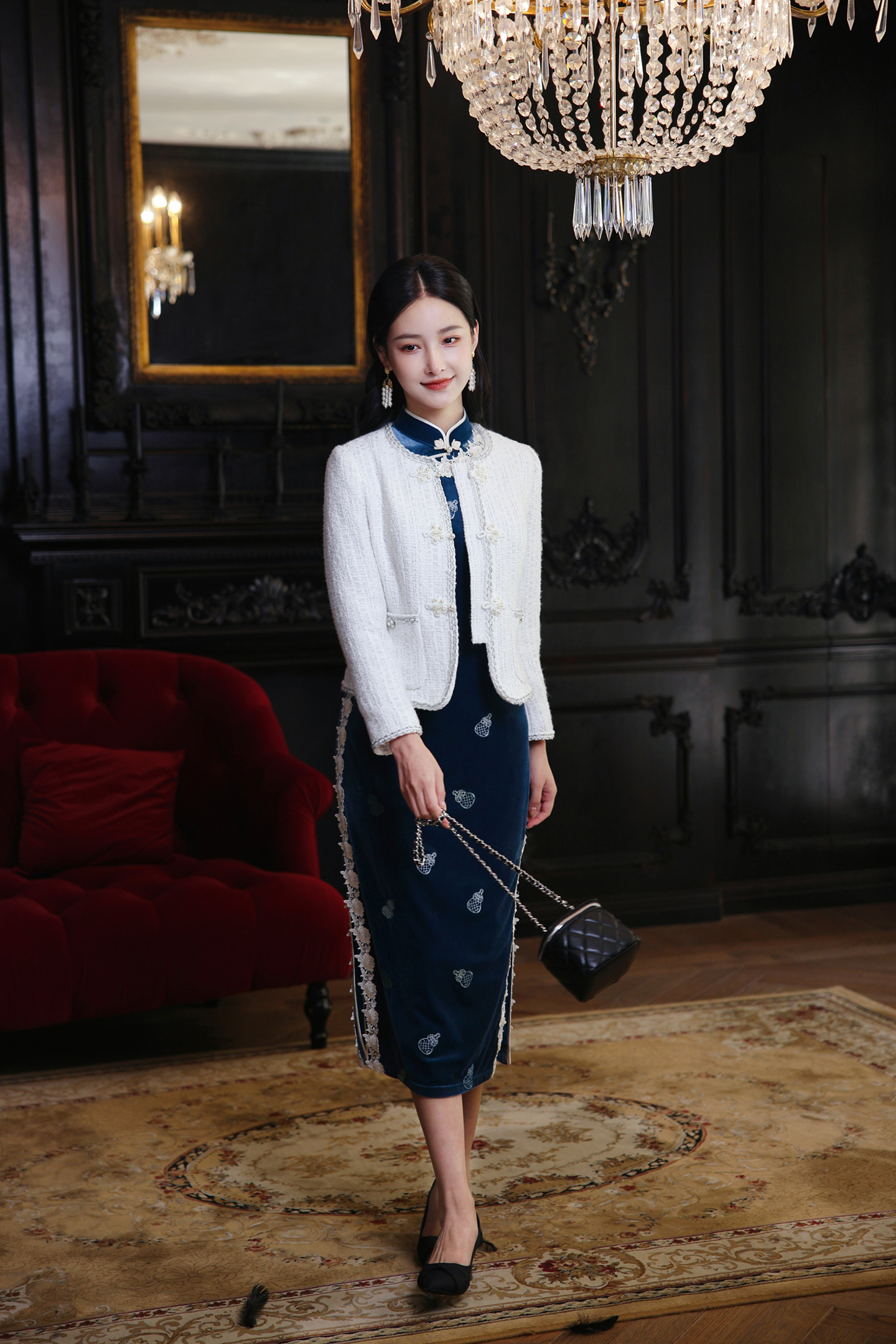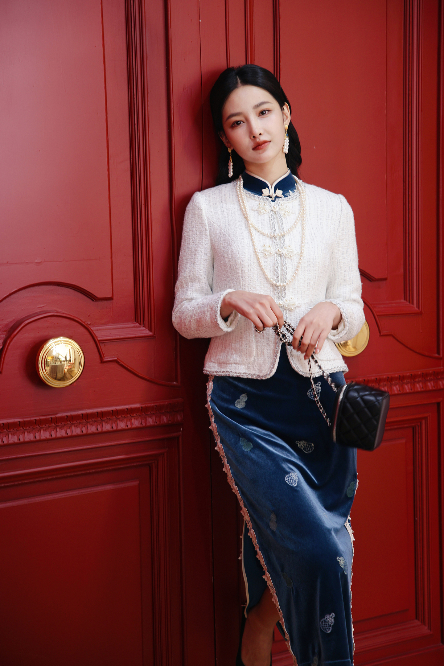 搭配丝绒旗袍走进办公室,白色小香风外套为职业装注入雅致灵魂。让你在汇报工作时,既是专业的职场人,也是风格的掌控者。