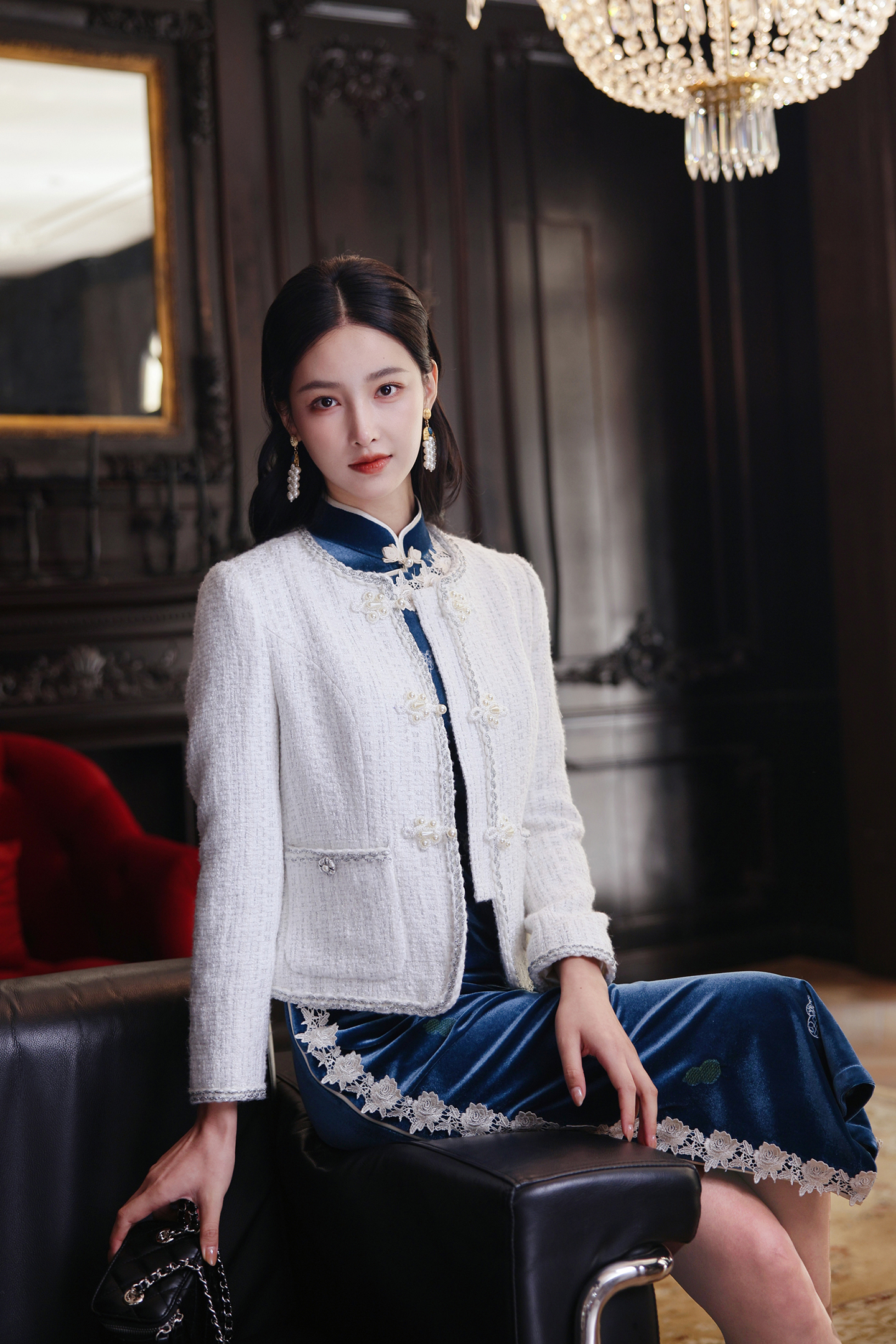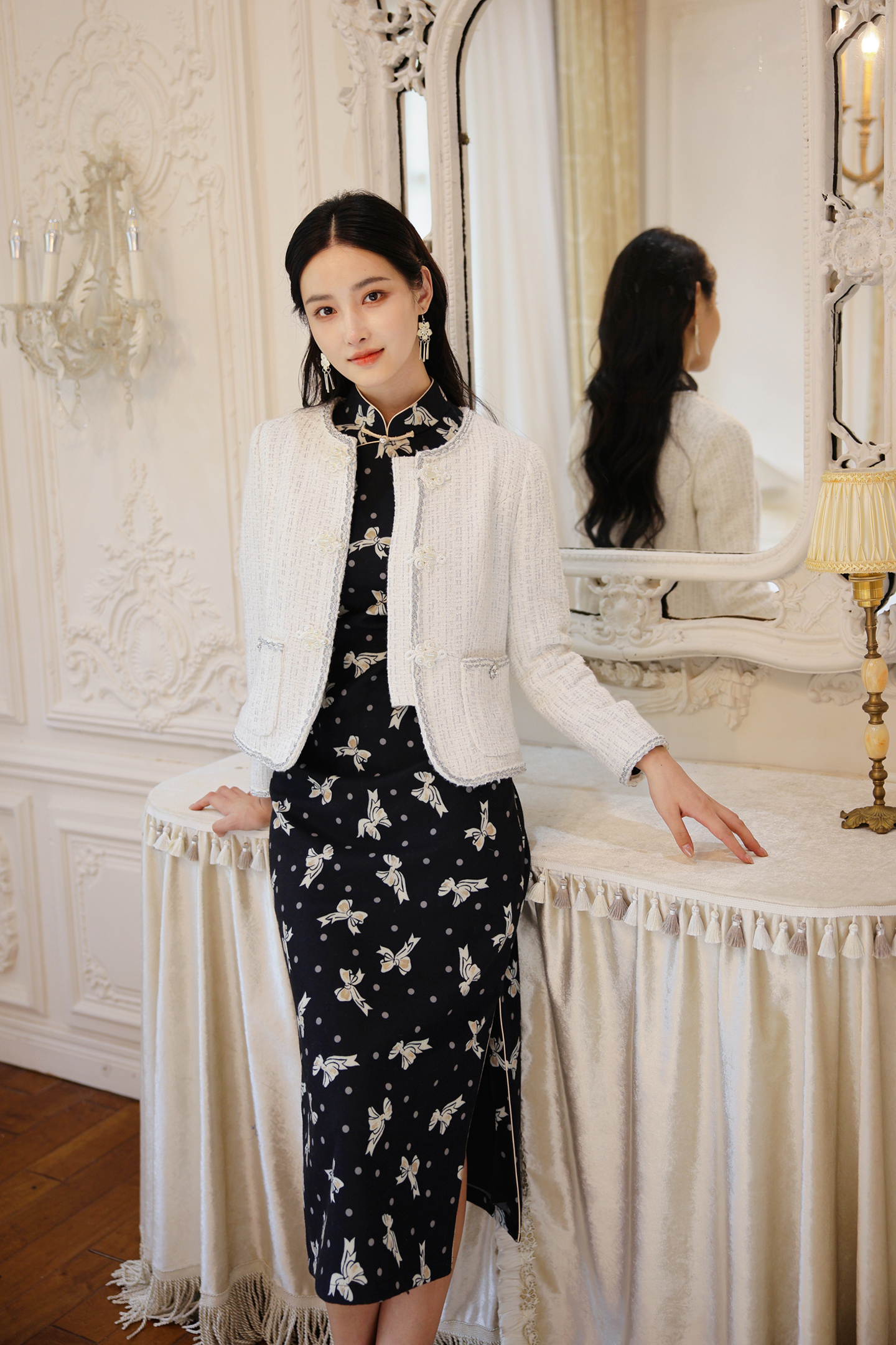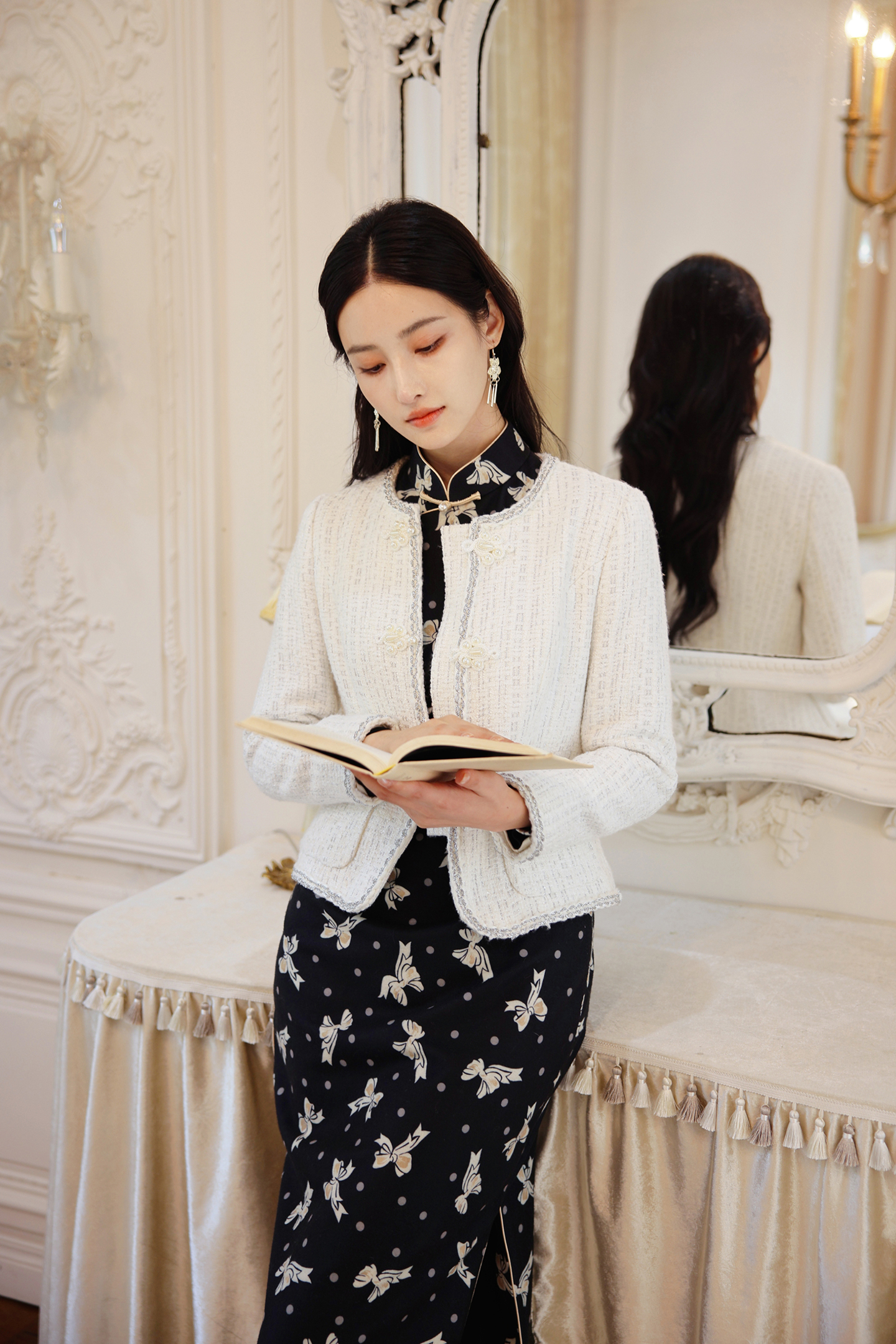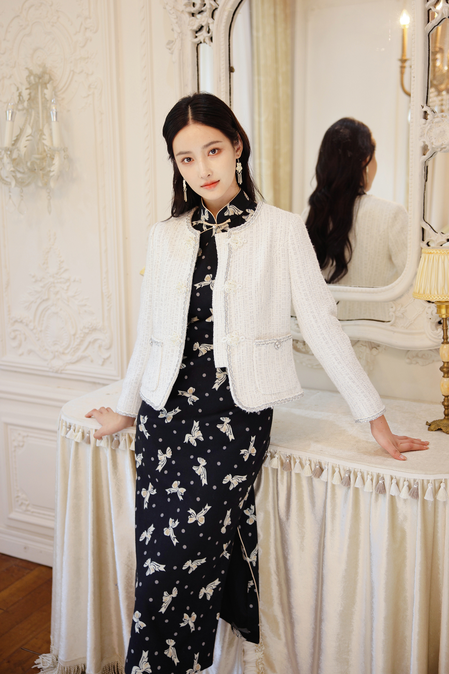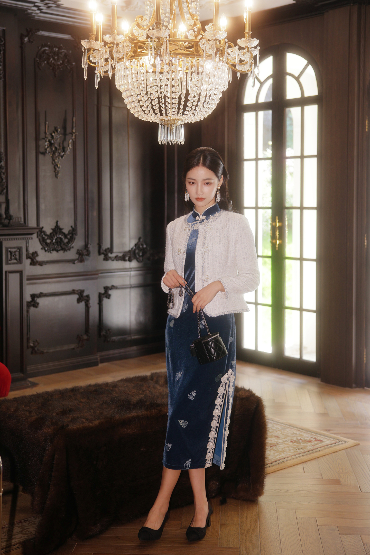 搭配丝绒旗袍走进办公室,白色小香风外套为职业装注入雅致灵魂。让你在汇报工作时,既是专业的职场人,也是风格的掌控者。
