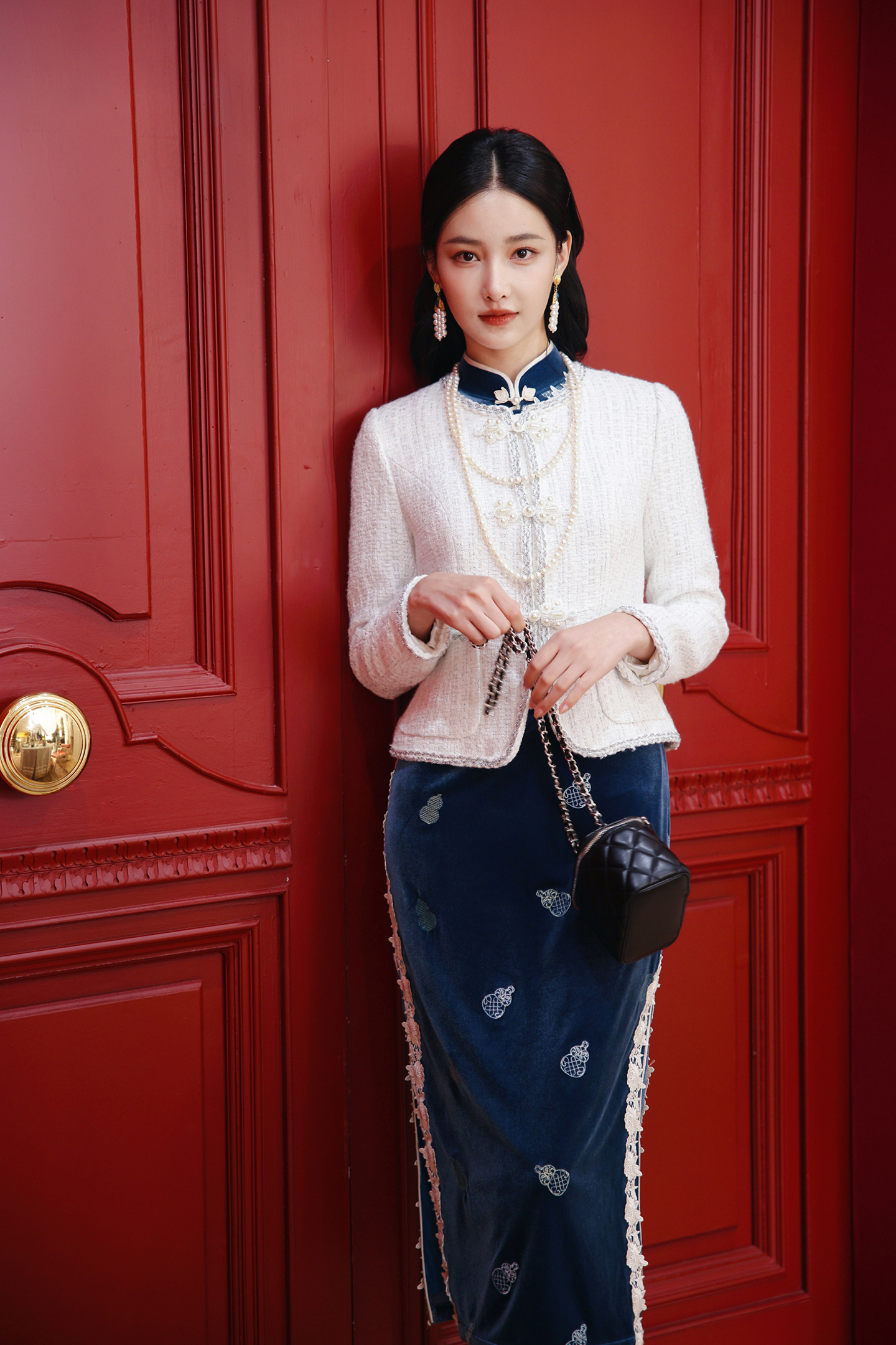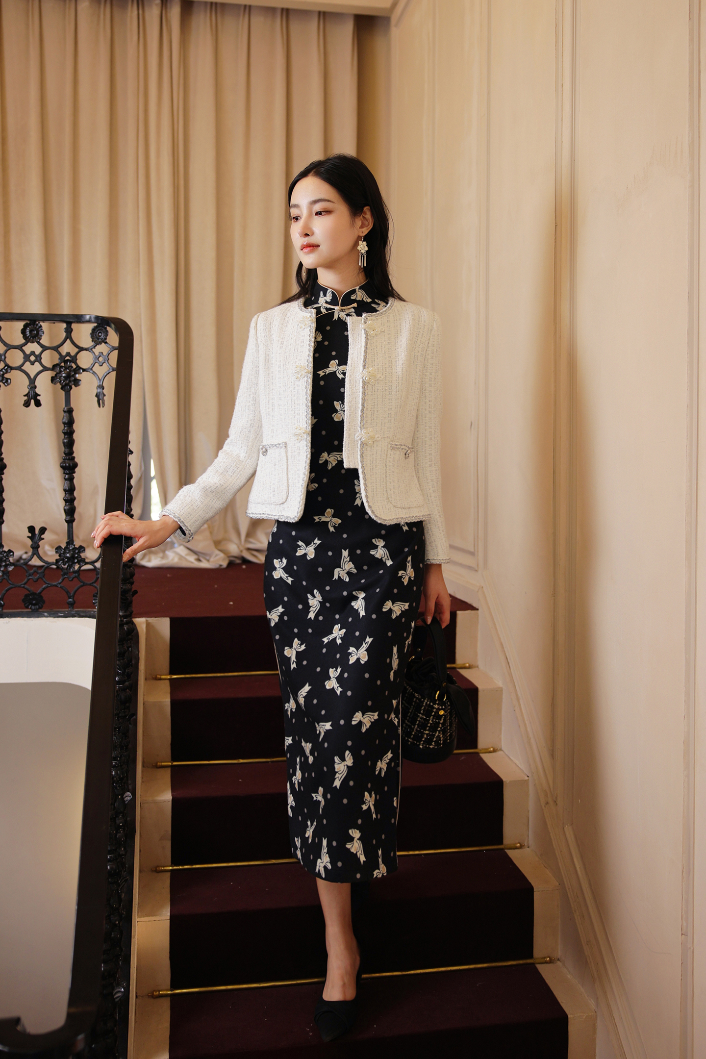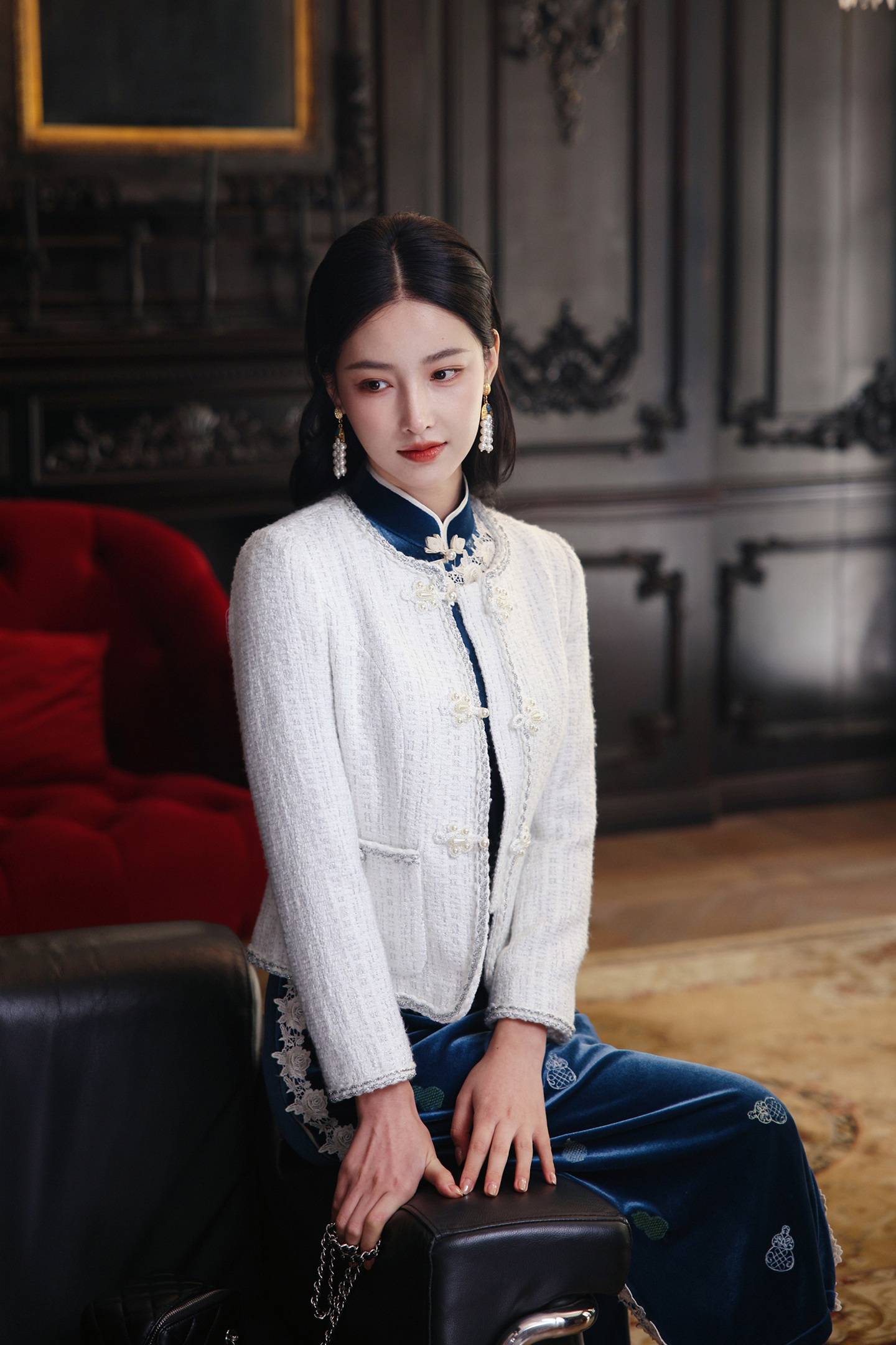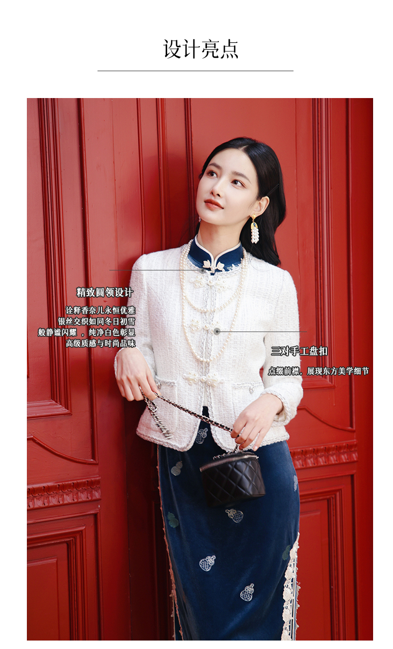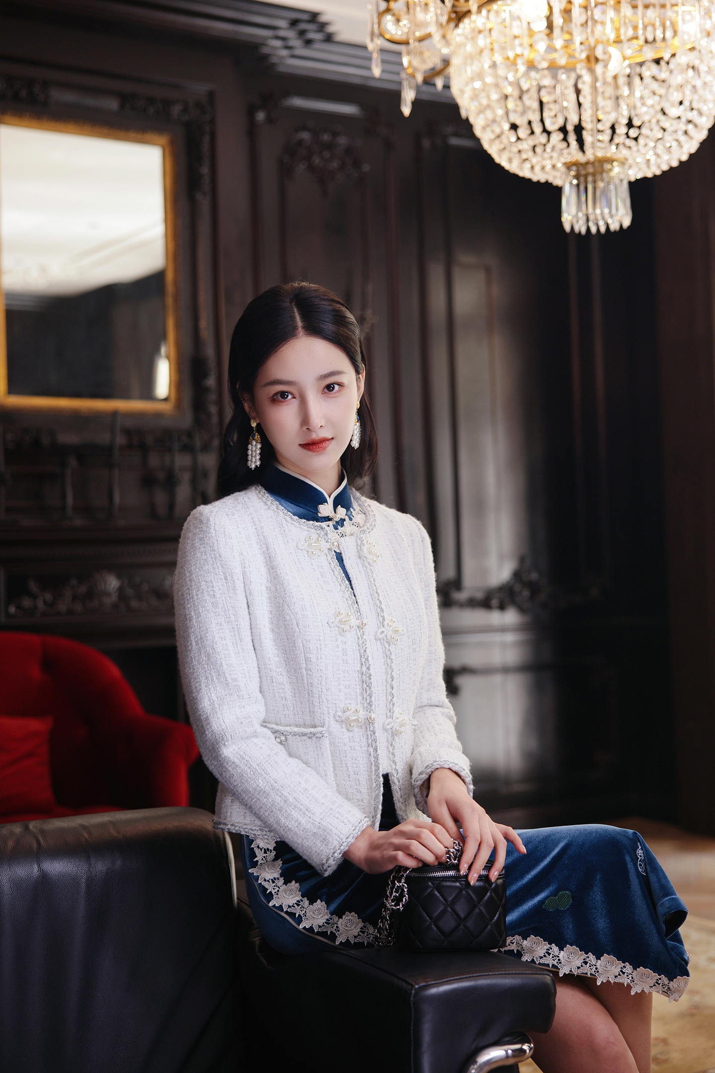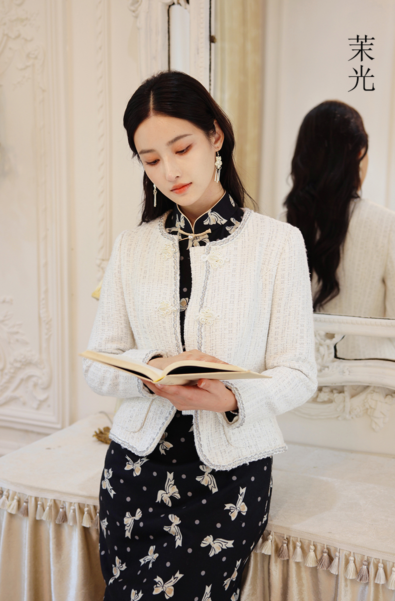 搭配丝绒旗袍走进办公室,白色小香风外套为职业装注入雅致灵魂。让你在汇报工作时,既是专业的职场人,也是风格的掌控者。