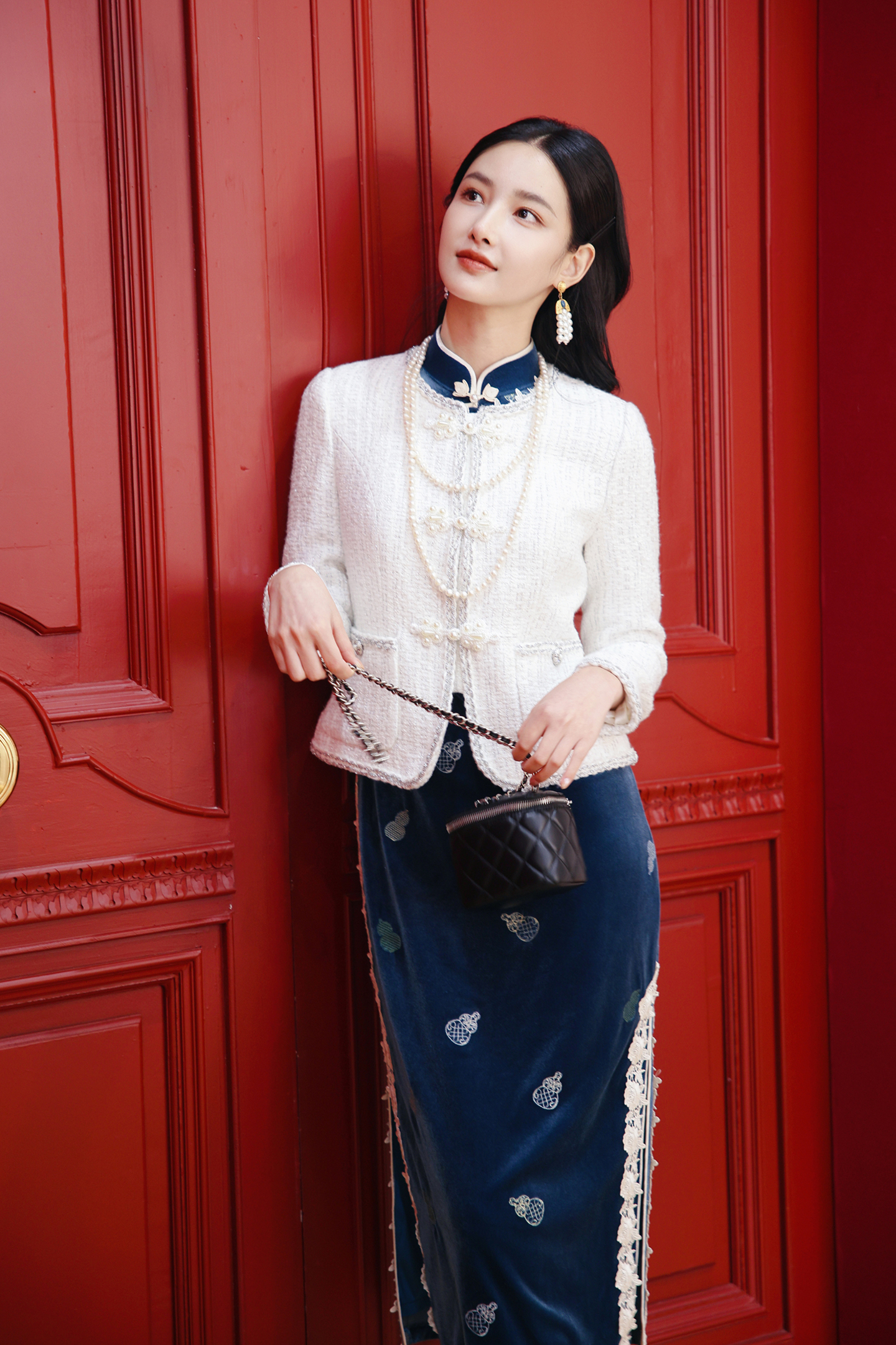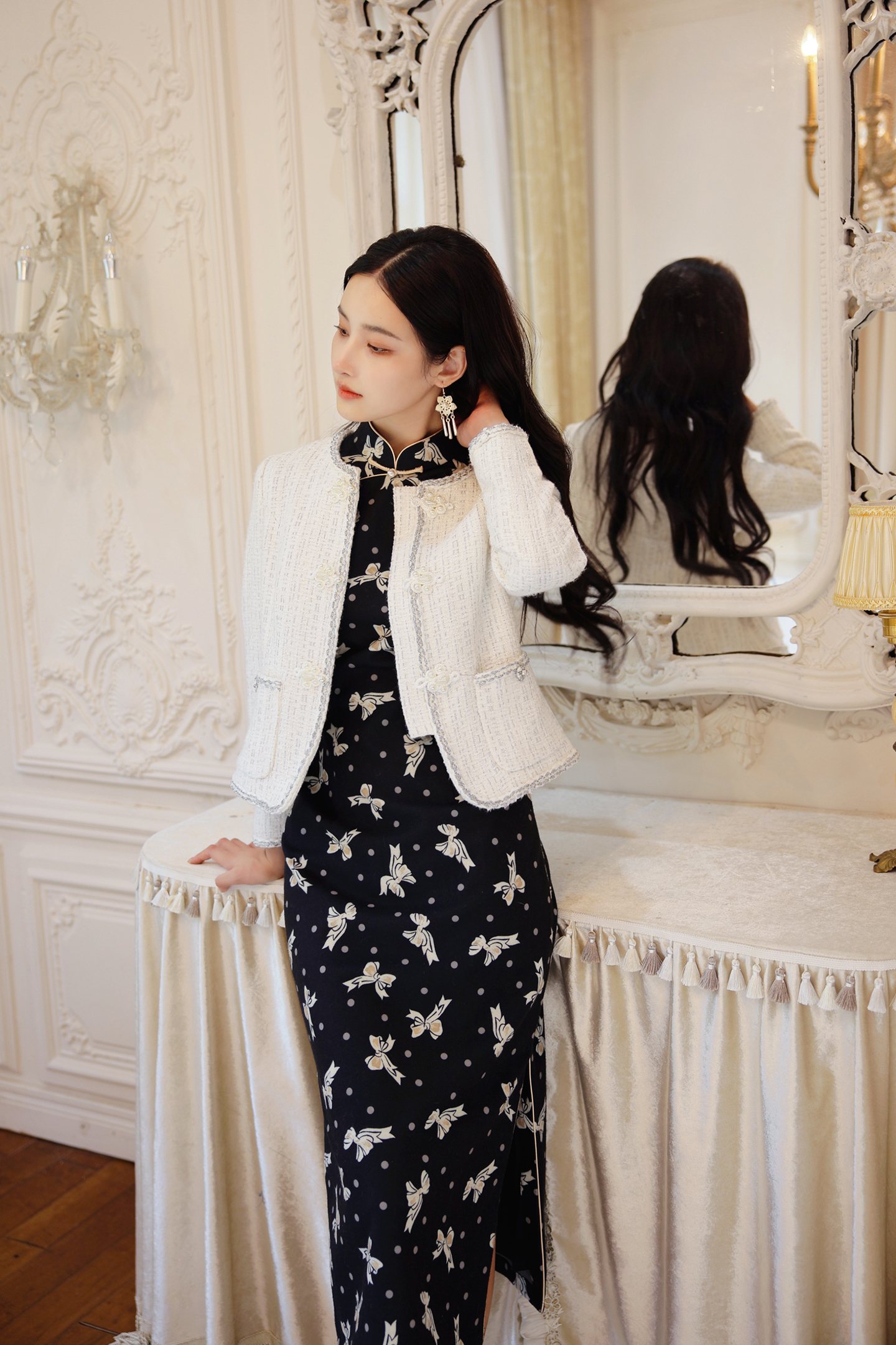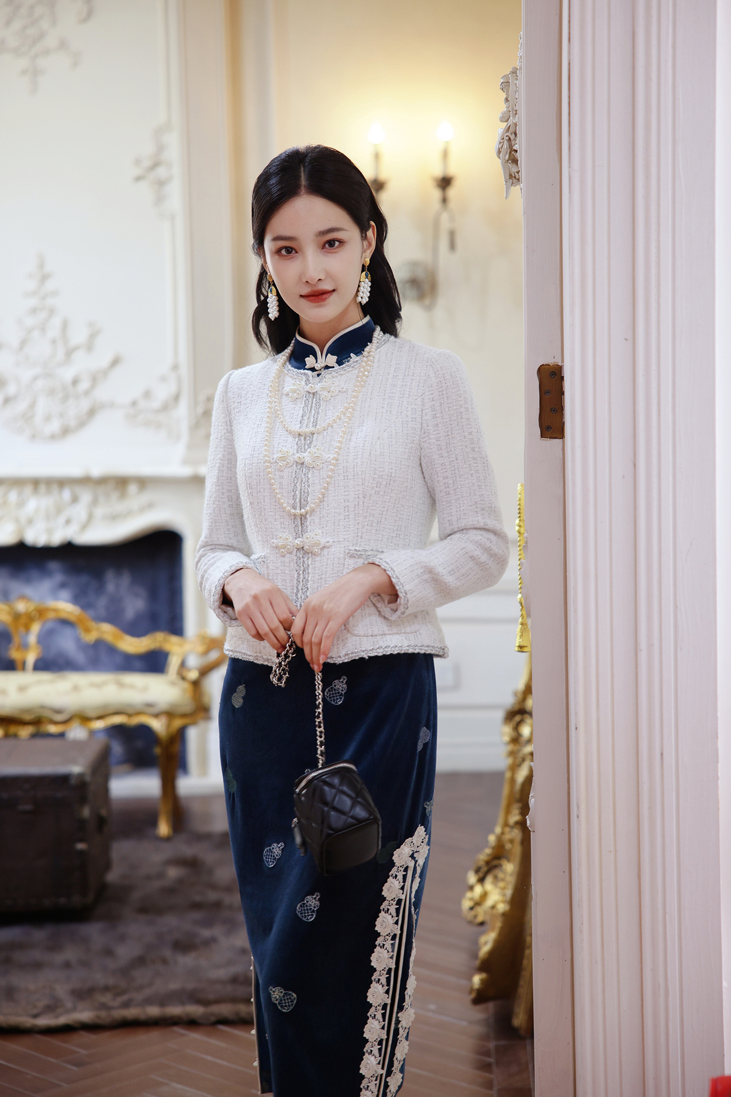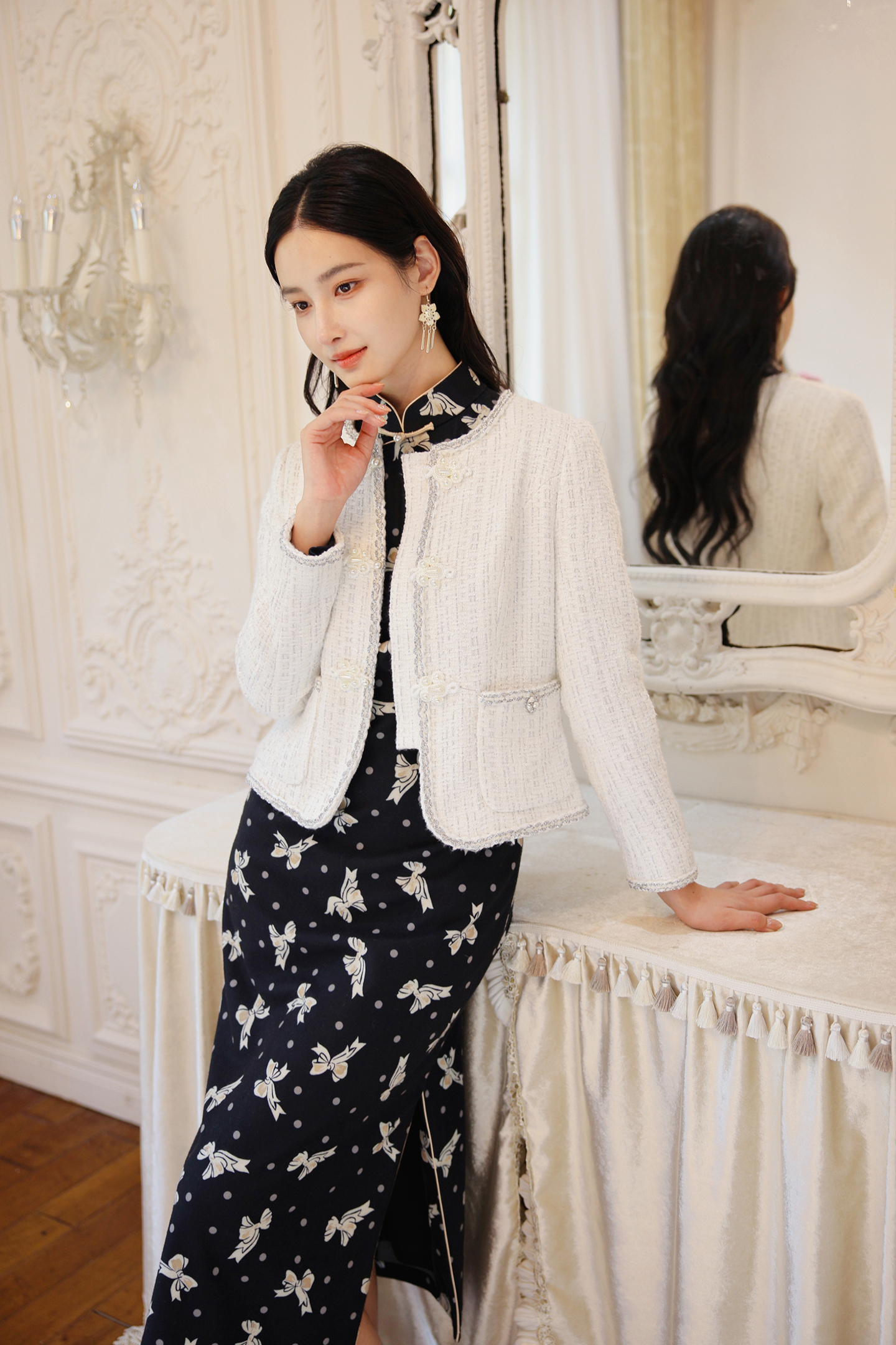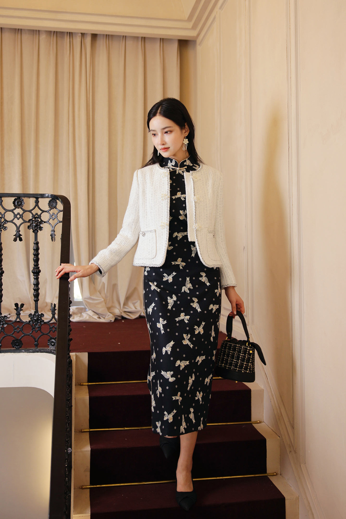 搭配丝绒旗袍走进办公室,白色小香风外套为职业装注入雅致灵魂。让你在汇报工作时,既是专业的职场人,也是风格的掌控者。