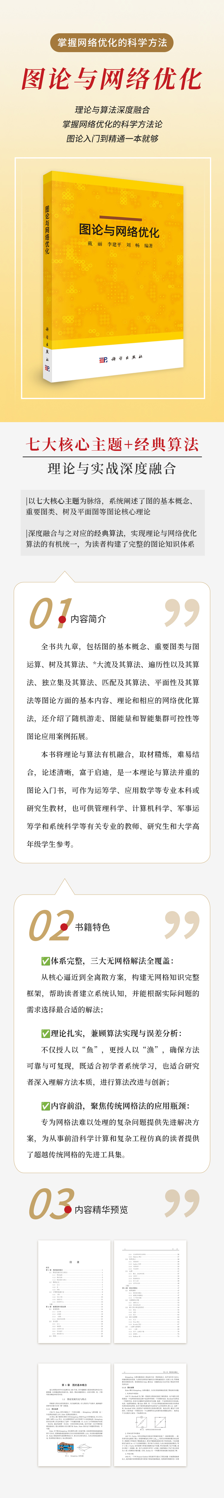 本书主要介绍图论的基本概念、理论和算法。涵盖图的概念与运算、树及其算法、…流及其算法、遍历性及其算法、独立集及其算法、…匹配及其算法、平面性及其算法、应用案例拓展等内容。每章配置了一定量的分层次、多题型的练习题。本书前两章为图与网络的基本概念及运算。自第三章始,每章节从实际问题出发,引出一个图论主题,建立相关概念和理论,清晰描述算法思想和执行步骤,严谨推演算法正确性、再用算例验证。最后一章介绍了综合运用图论知识解决具体应用问题的几个案例。本书为学习者较全面地呈现了图论研究的基本问题以及研究视角。