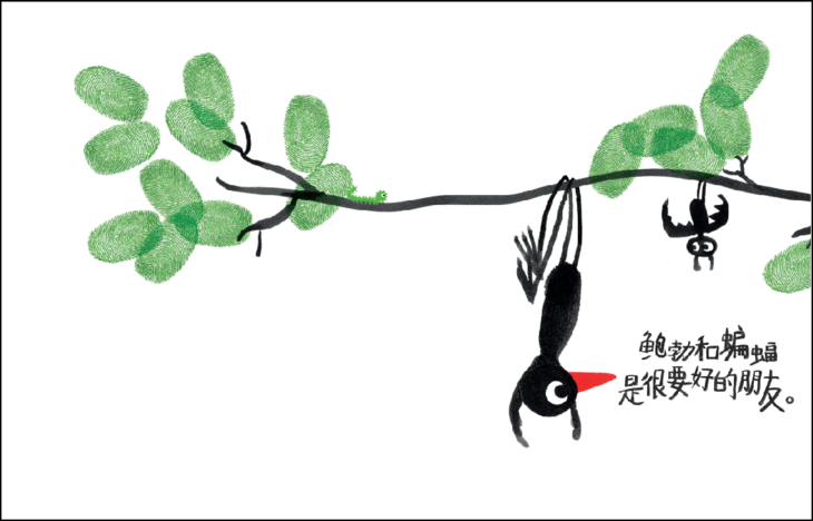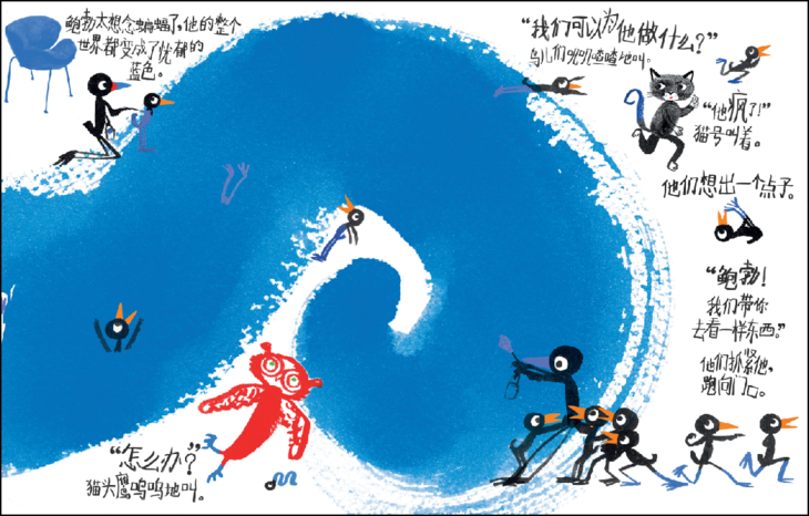 极简主义风格的图画,采用水彩画、指纹画、滴画等多种表现形式,色调和图画的叙事功能引人注目。文字内容简洁幽默,全文字体由六岁的小朋友亲自手写,尽显质朴天真。