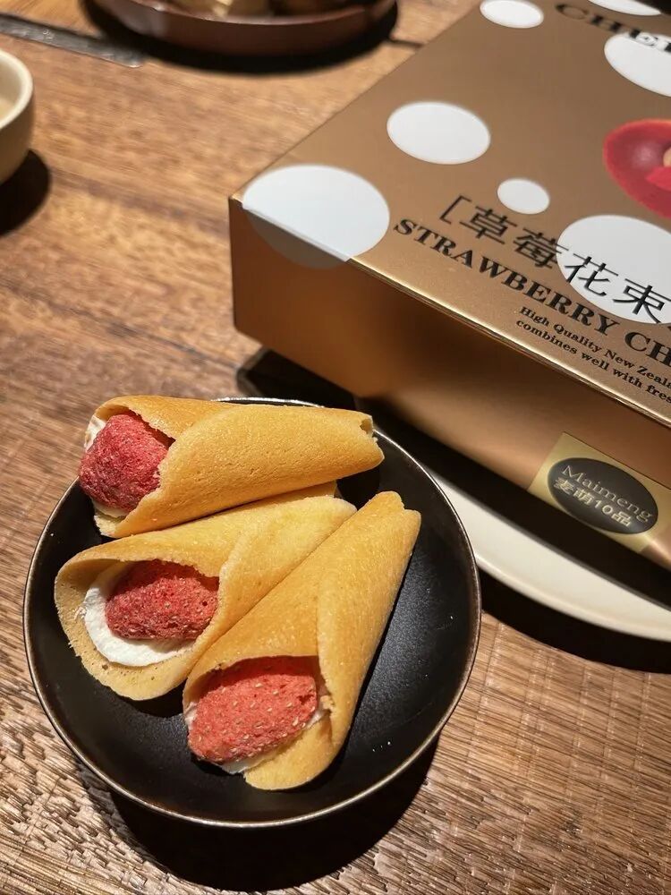 精致的小蛋卷很奶香,上面的草莓干下面就是松软的奶油,层次丰富,口感很好。