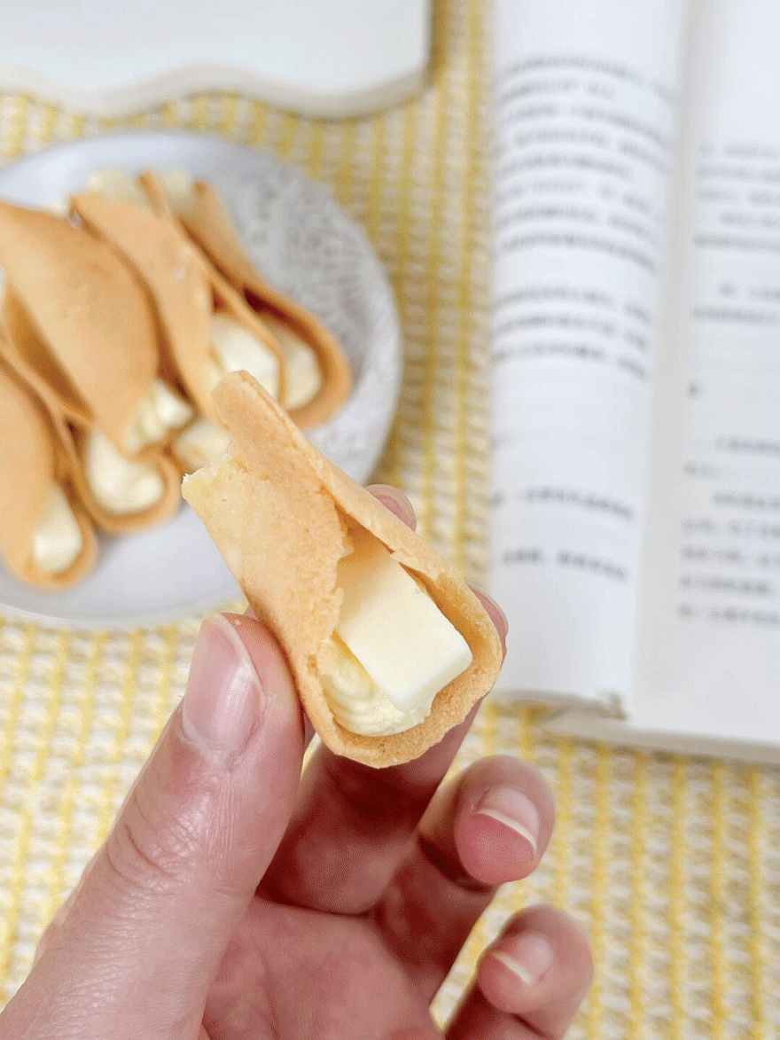 香脆的蛋卷里面裹着芝士奶酪。霜和入口即化的芝士条,甜中带有淡淡的咸香,吃一口完全停不下来。